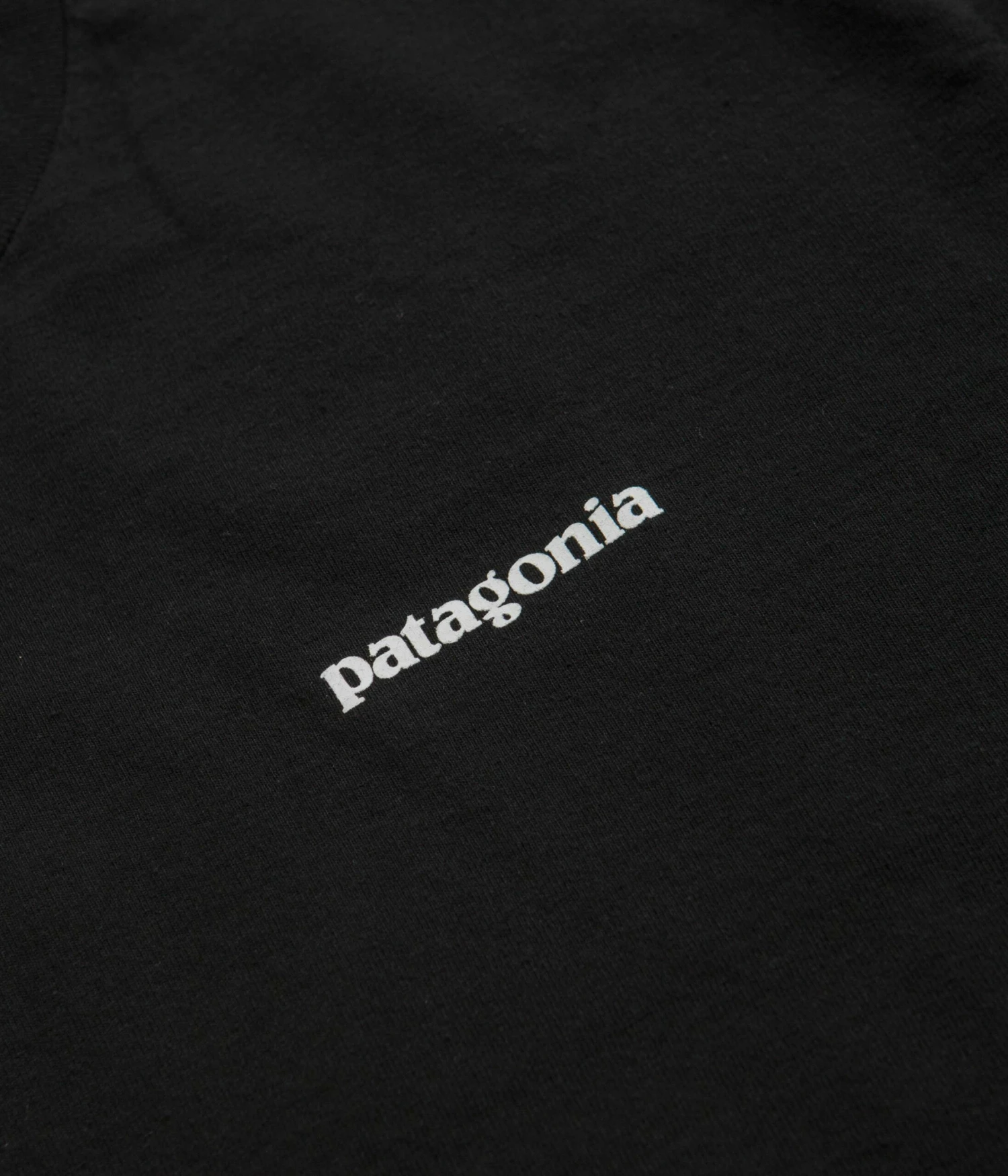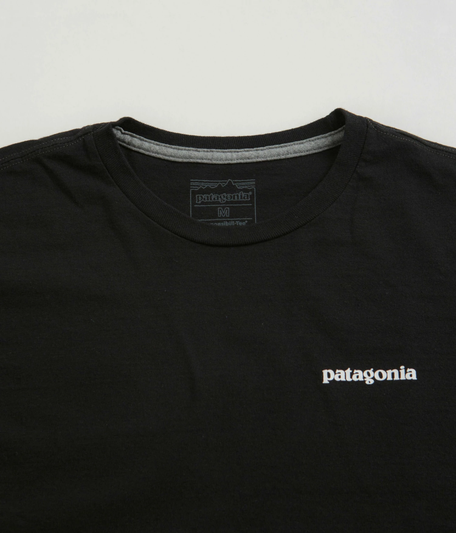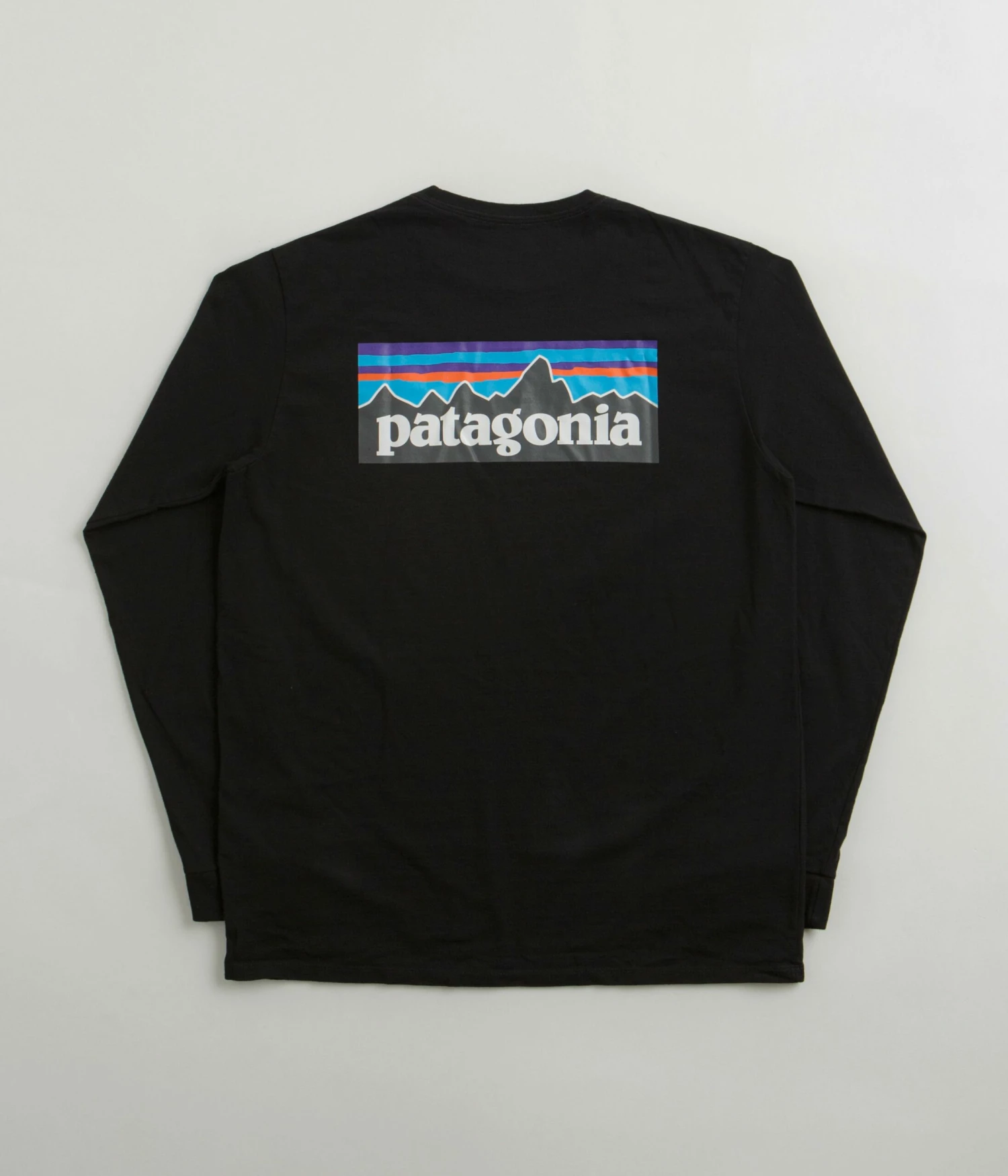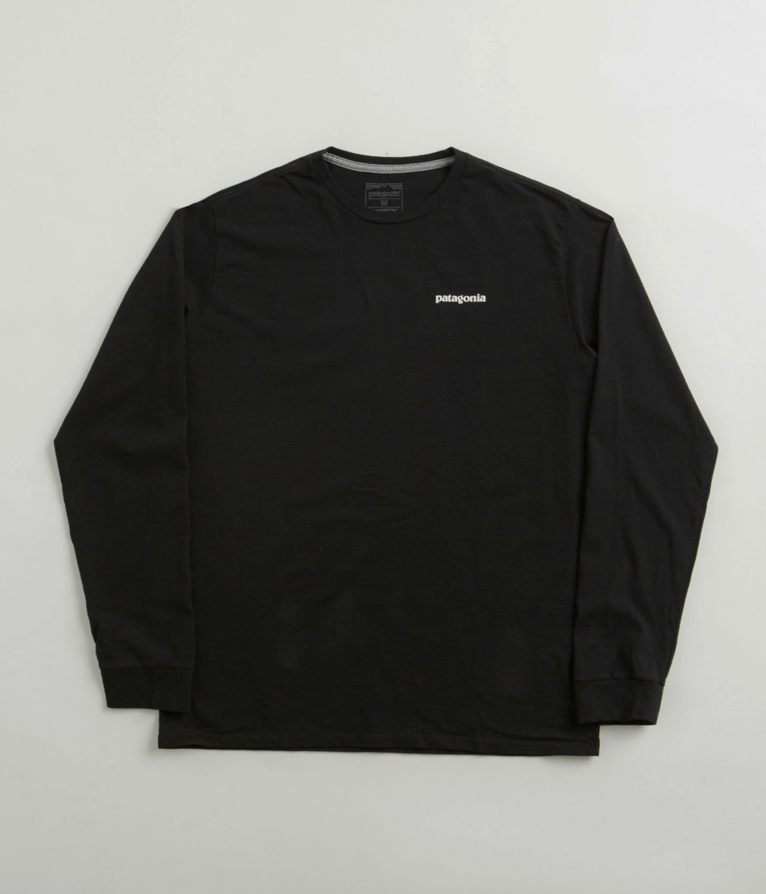 Patagonia P-6 Logo Responsibili-Tee Long Sleeve T-Shirt in Black. Tailored to a regular fitting from 100% recycled fabrics, this colour block Patagonia t-shirt is designed with a flexible rib knit collar and ribbed cuffs. Featuring a reinforced hem and taped shoulder seams, this black Patagonia t-shirt is finished with PVC and phthalate-free printed artwork displayed across both the left chest and the reverse.
