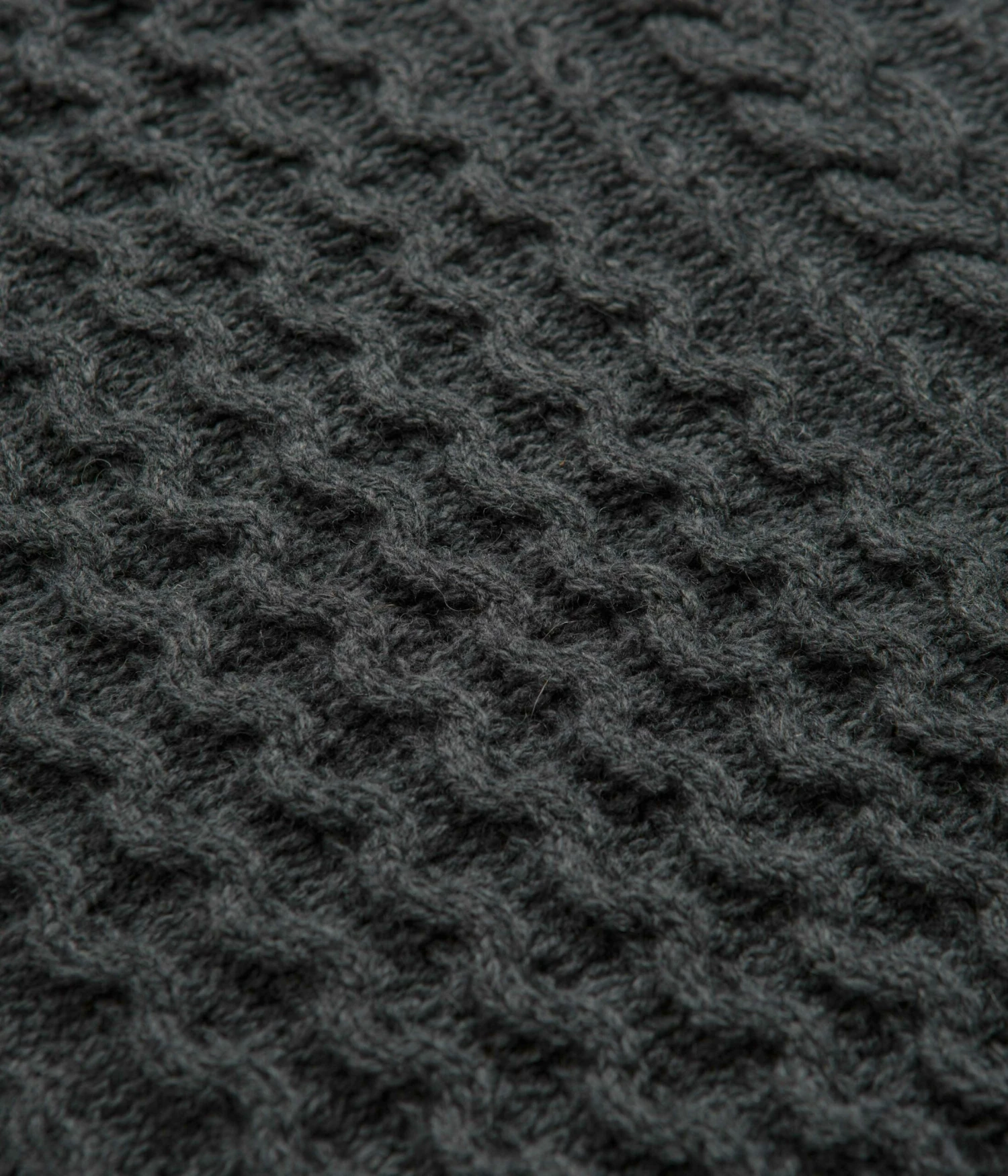 Patagonia Recycled Cable Knit Crewneck Sweatshirt in Hex Grey. Tailored to a unisex fitting, this Fair Trade Certified™ sweatshirt is made from a recycled fabric blend with a 3-gauge fisherman knit. Featuring 1×1 tubular rib knit trims and raglan sleeves, this grey Patagonia sweater is finished with a hand-linked construction with tonal stitched seams.