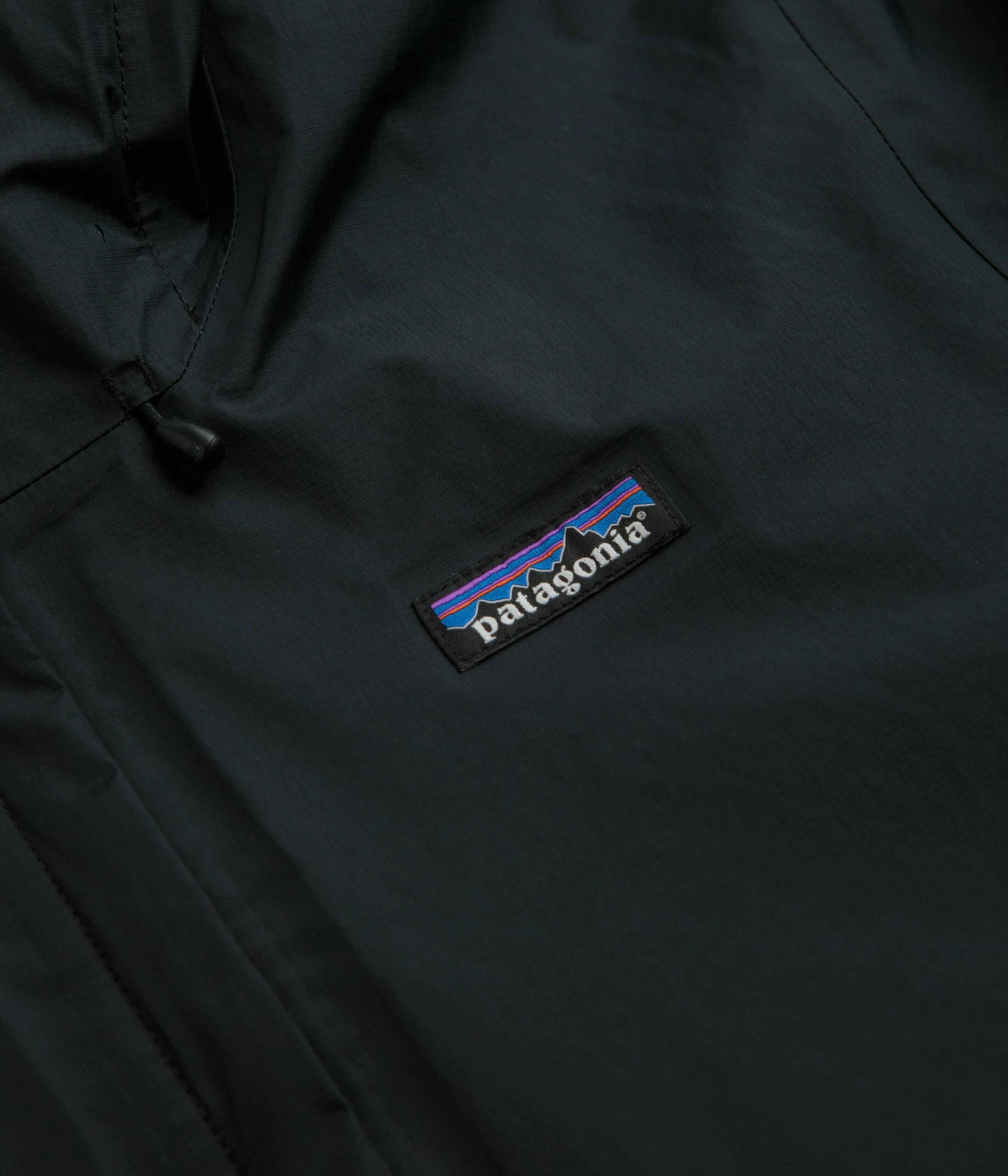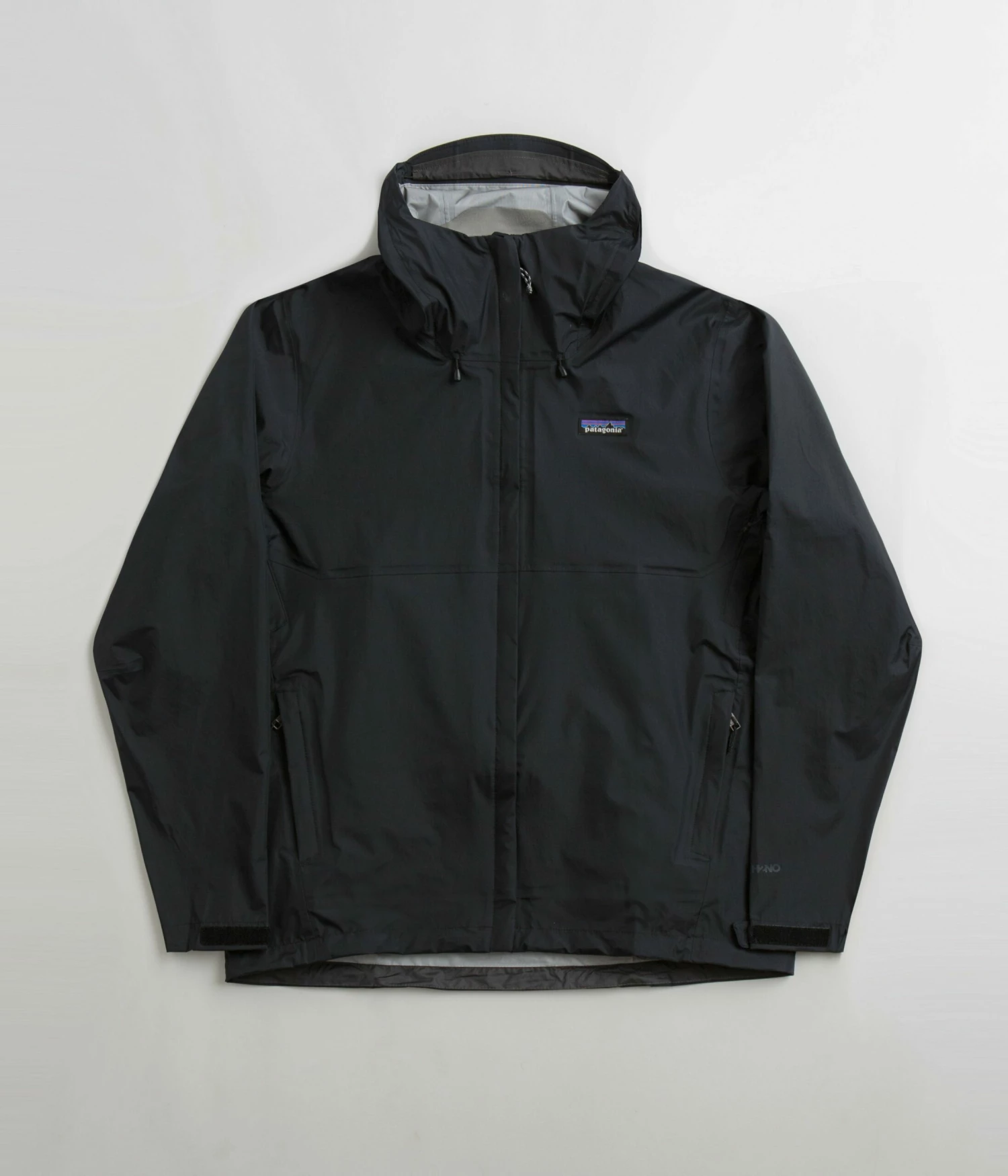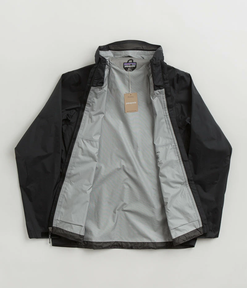 Patagonia Torrentshell 3L Jacket in Black. Designed with a H2No® Performance Standard shell made from 100% recycled nylon ripstop with a DWR coated exterior and a PU membrane, this regular fitting Patagonia jacket is Fair Trade Certified™ with a micro-fleece lined neck. Featuring a full length zipper fastening, zippered underarm vents, an adjustable drawcord hem and self-storing functionality, this black Patagonia torrentshell jacket is finished with an adjustable two-way hood, two zippered front pockets, adjustable cuffs and with woven P-6 flag label branding.