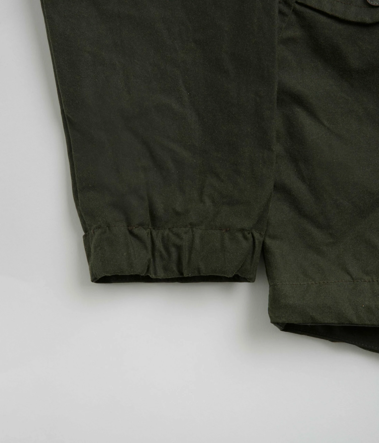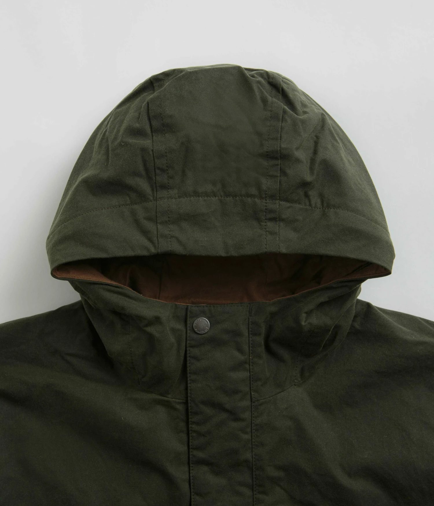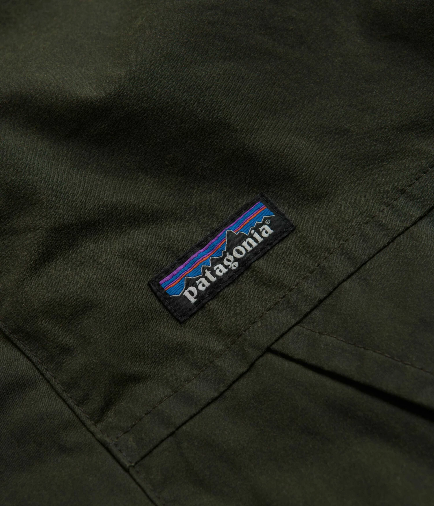 Patagonia Waxed Cotton Jacket in Basin Green. Tailored to a regular fitting from 100% Cotton in Conversion plain weave, this Patagonia jacket is designed with a Halley Stevensons EverWax™ Olive coating. Featuring a full length zipper fastening, a snap placket fold, a panelled chest and adjustable cuffs, this green Patagonia jacket also features a fixed hood and a high-low hem. Finished with two waist pockets and with woven P-6 flag label branding.