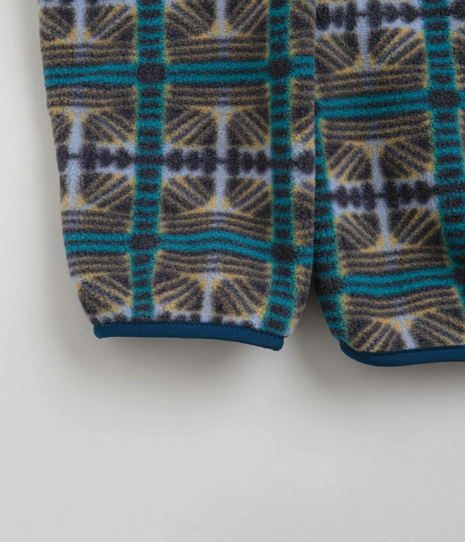 Patagonia Womens Synchilla Snap-T Pullover Fleece in Snow Beam: Pale Periwinkle. Tailored to a regular fitting and Fair Trade Certified™, this Patagonia fleece is made from 100% recycled polyester double-sided fleece. Featuring an all-over sublimation print, this teal Patagonia fleece also features Y-joint sleeves, a four-button placket and spandex trimmed cuffs. Finished with a nylon plain weave chest pocket and an embroidered P-6 flag label.