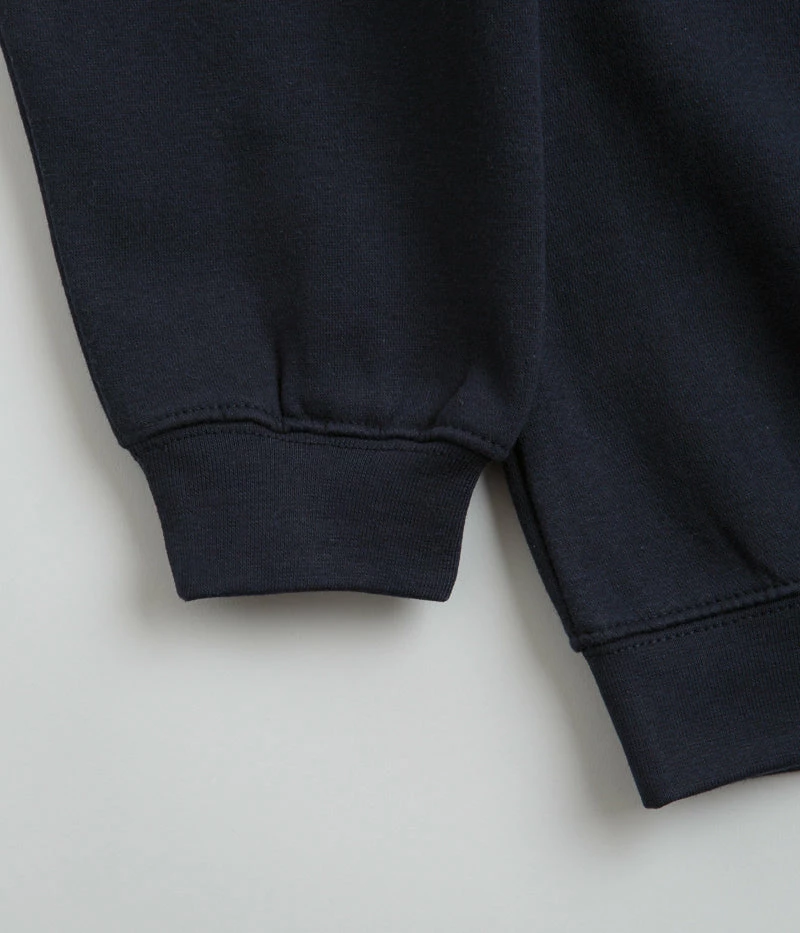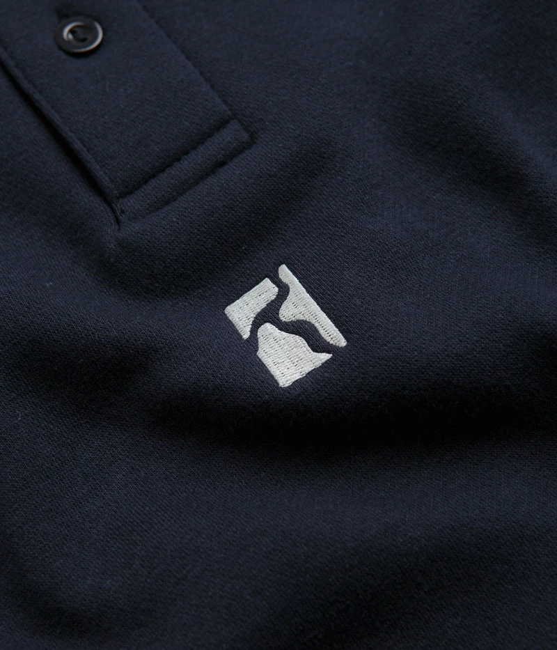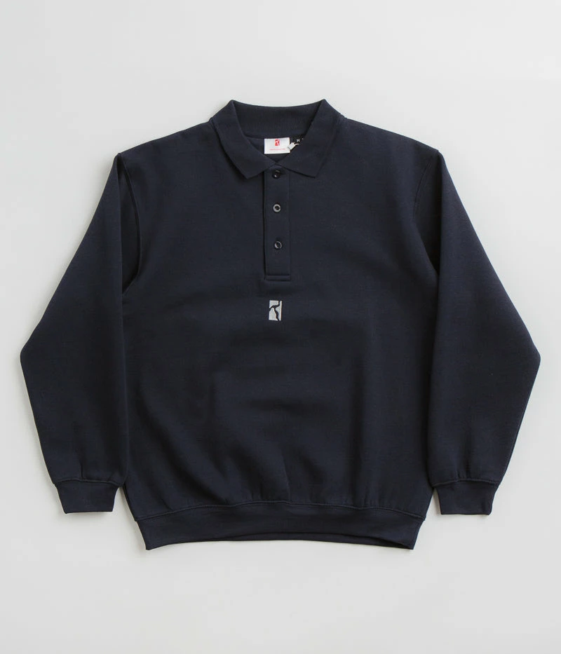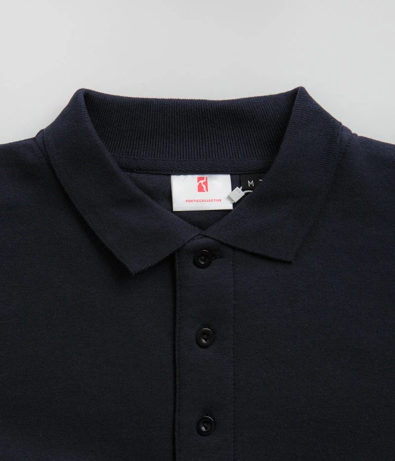 Poetic Collective Heavy Polo Sweatshirt in Dark Navy. Relaxed fitting and made from heavyweight fabric, this Poetic Collective sweatshirt is designed with a classic stand collar with a triple button placket. Featuring ribbed cuffs, a woven elastic hem and tonal stitched seams, this navy Poetic Collective sweater is finished with an embroidered centre chest logo.