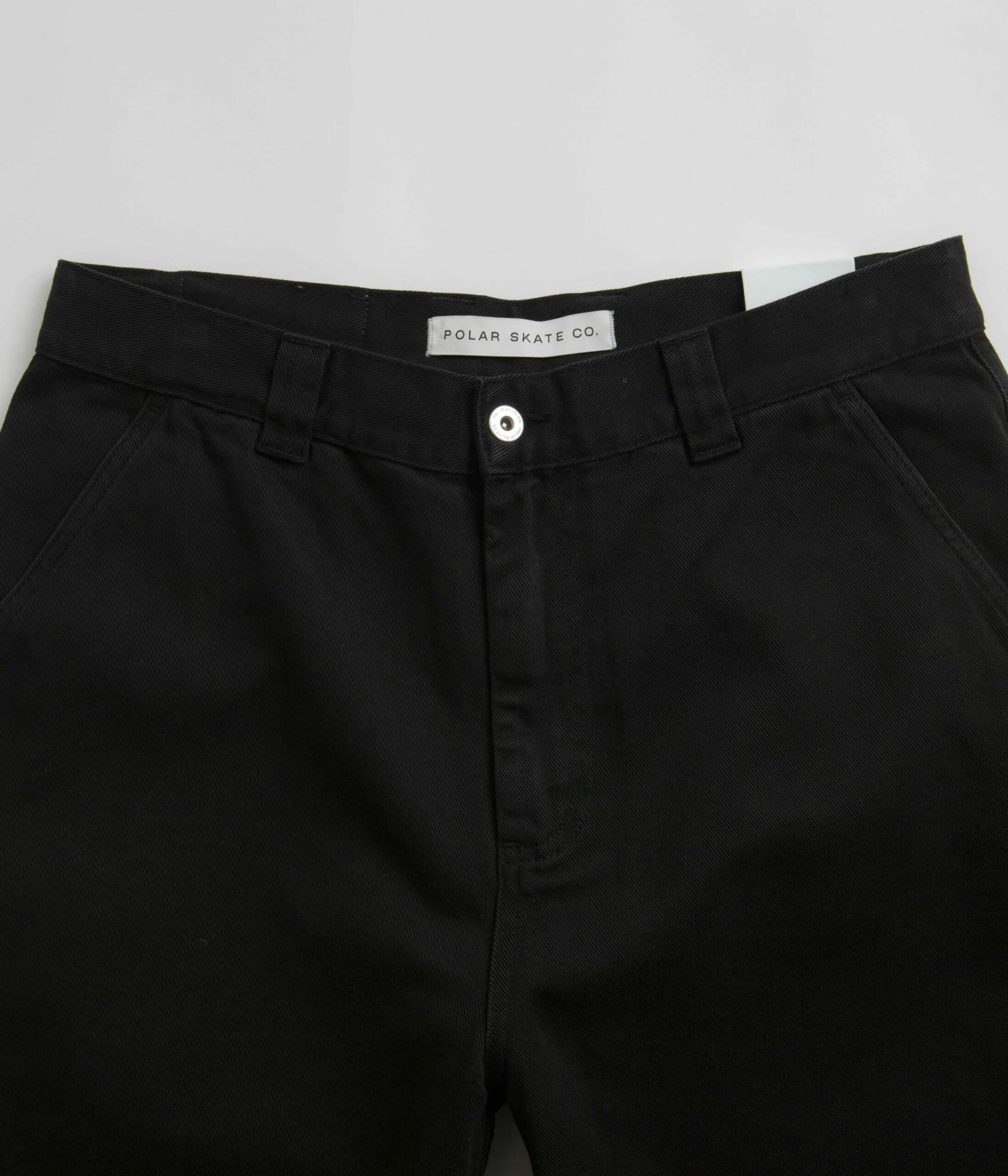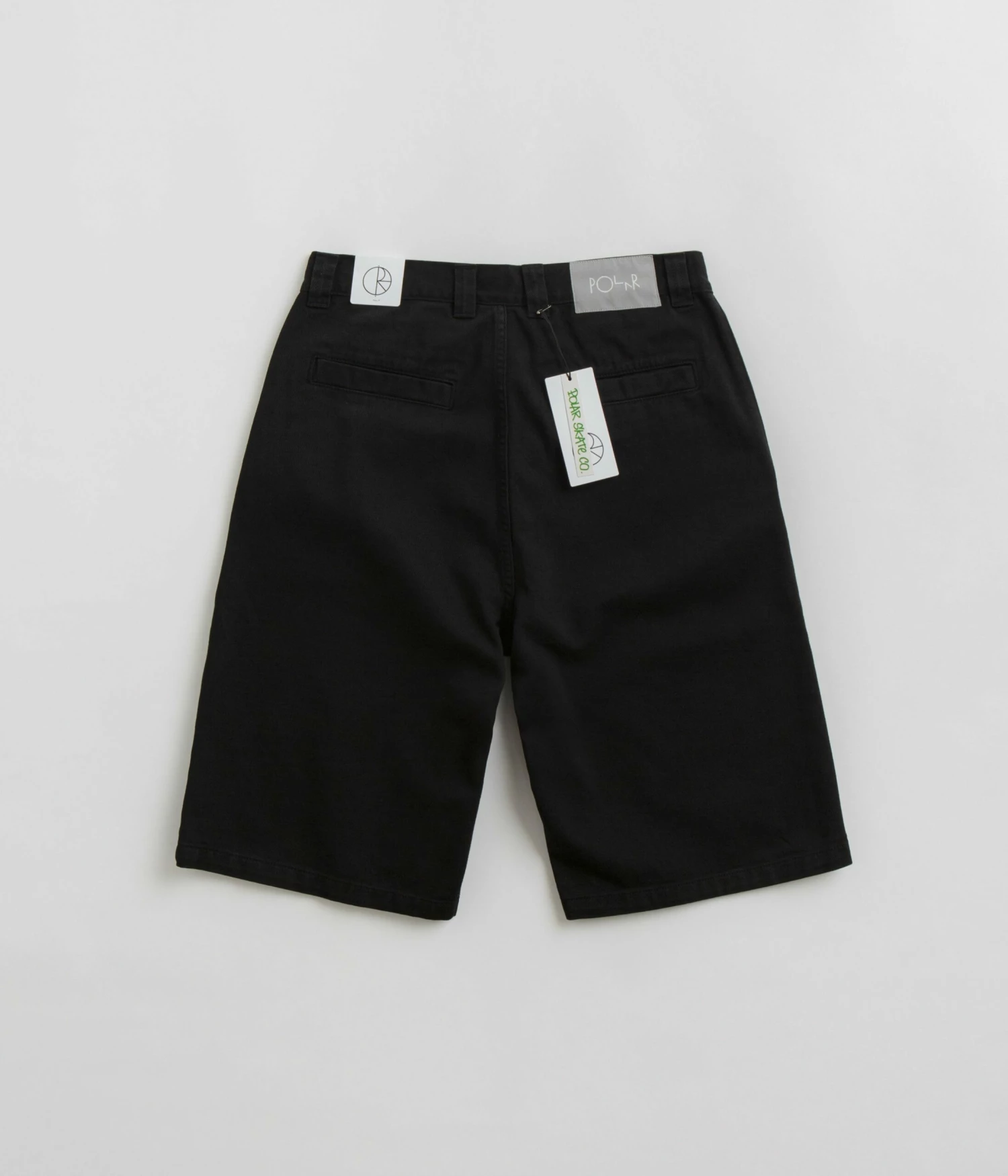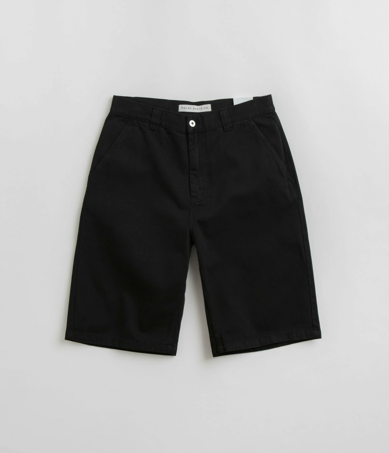 Polar 44 Twill Shorts in Black. Made from 100% midweight cotton twill, these retro fitting Polar shorts are garment dyed with a high-rise waist. Featuring a wide cut, a single button secured zipper fly and four classic pockets, these black Polar shorts are finished with a woven rear belt patch.>