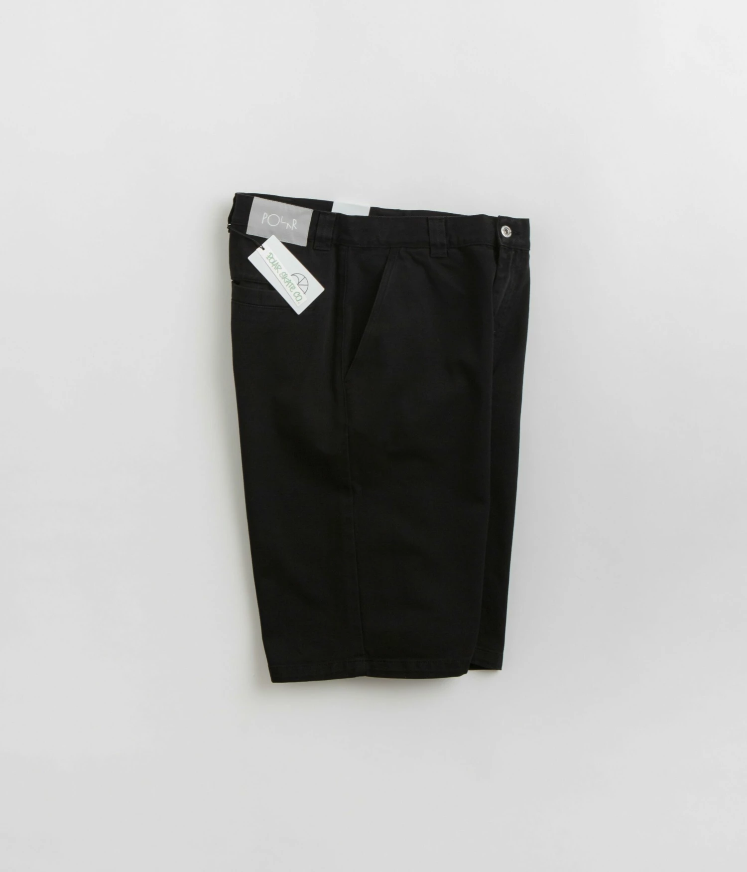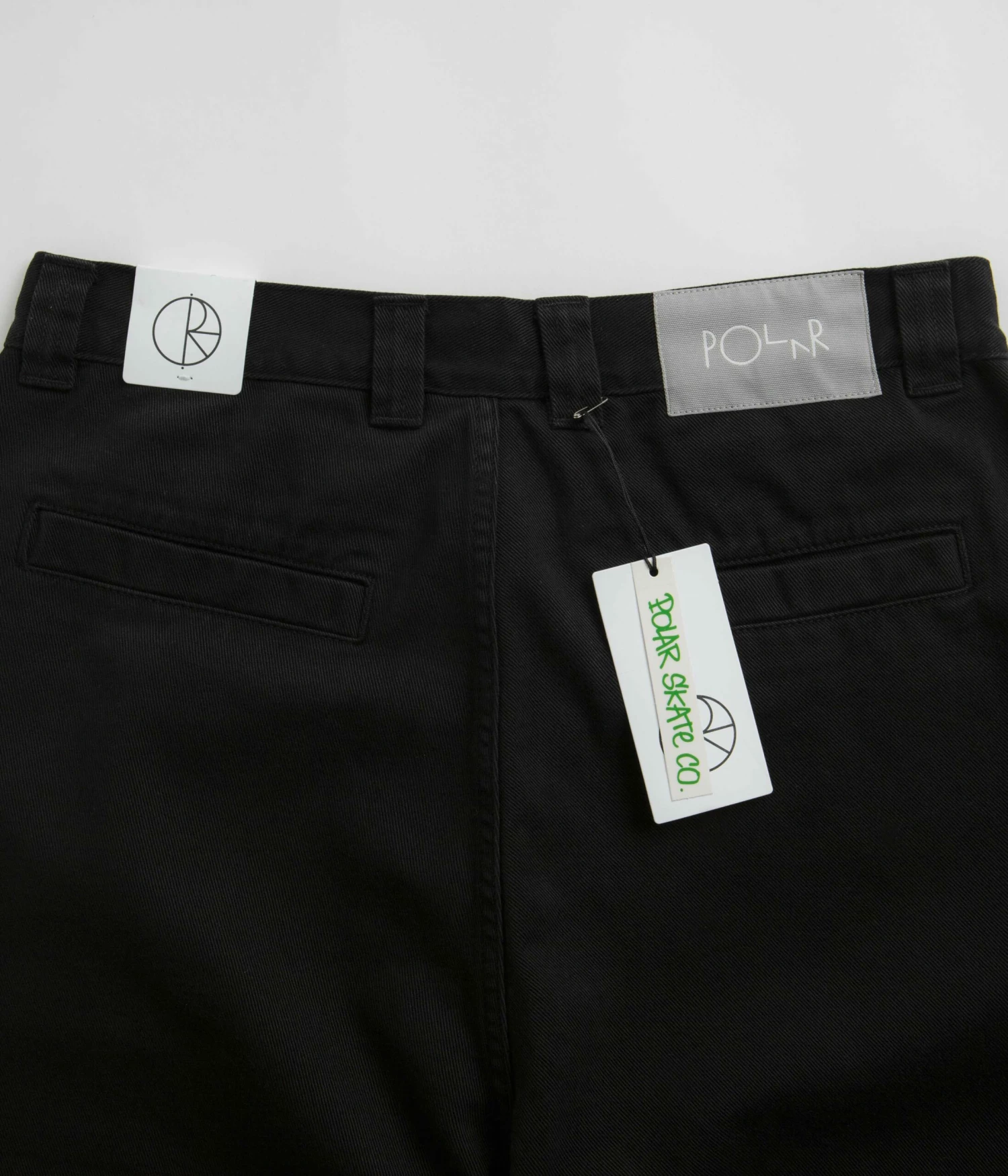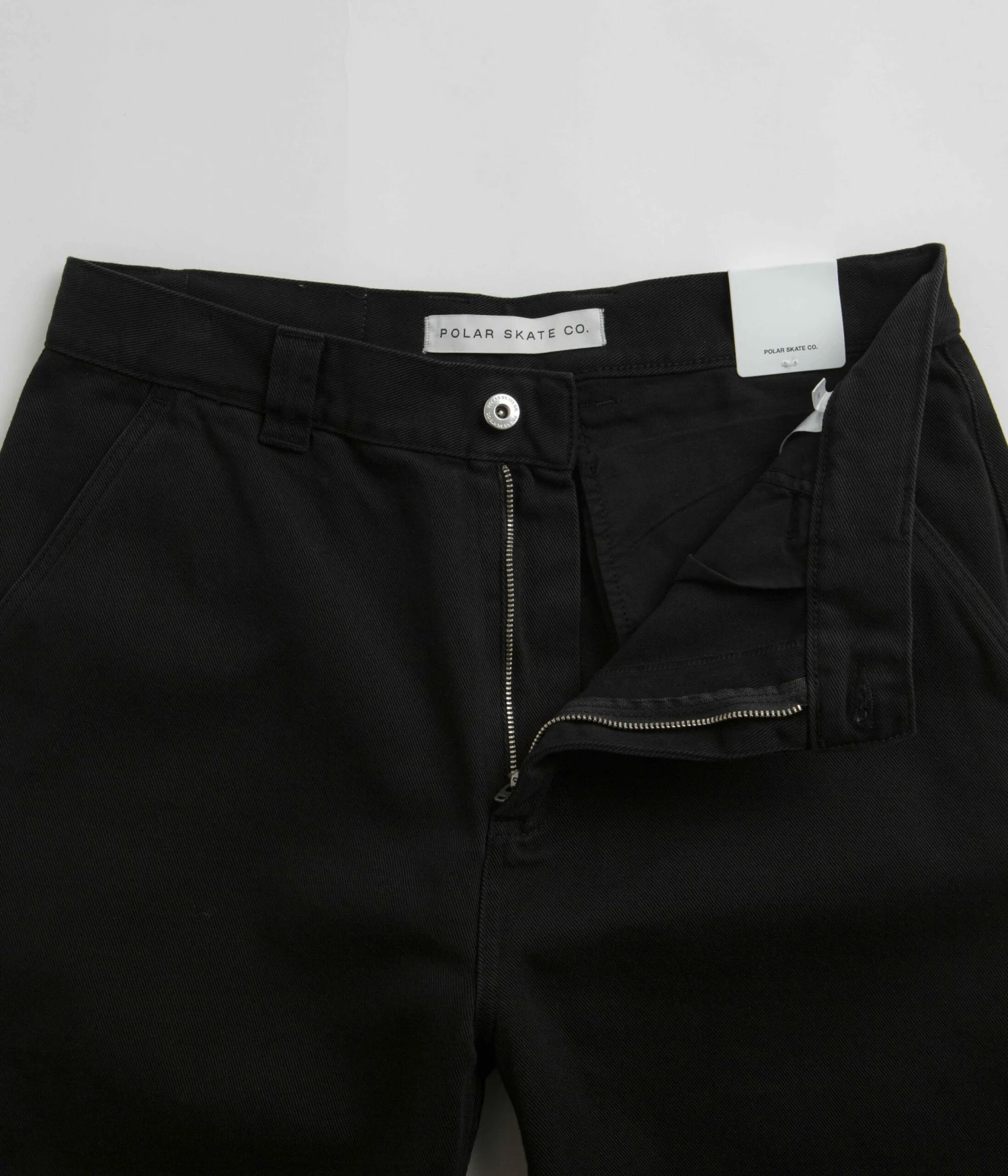 Polar 44 Twill Shorts in Black. Made from 100% midweight cotton twill, these retro fitting Polar shorts are garment dyed with a high-rise waist. Featuring a wide cut, a single button secured zipper fly and four classic pockets, these black Polar shorts are finished with a woven rear belt patch.>