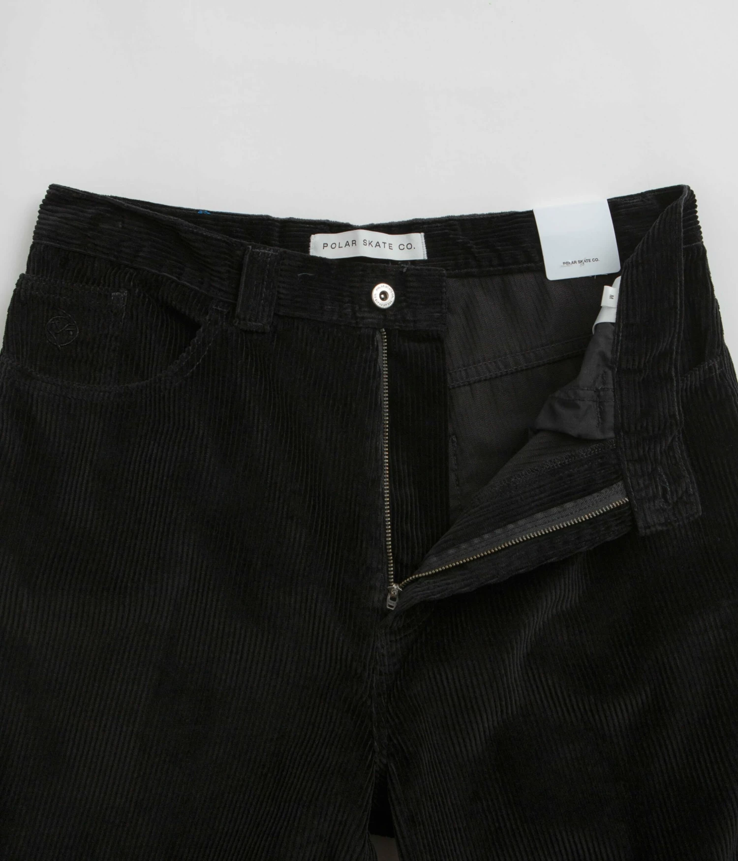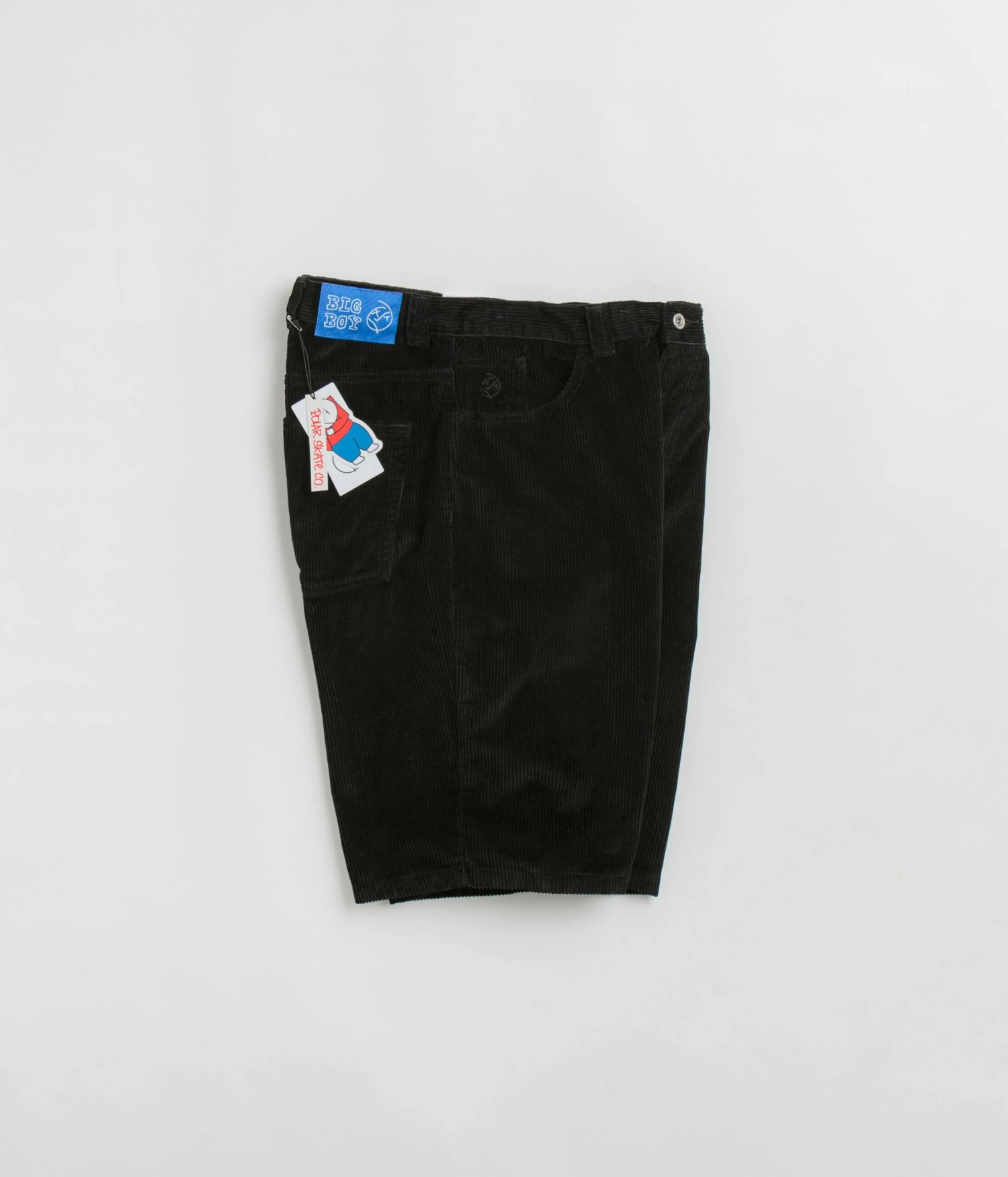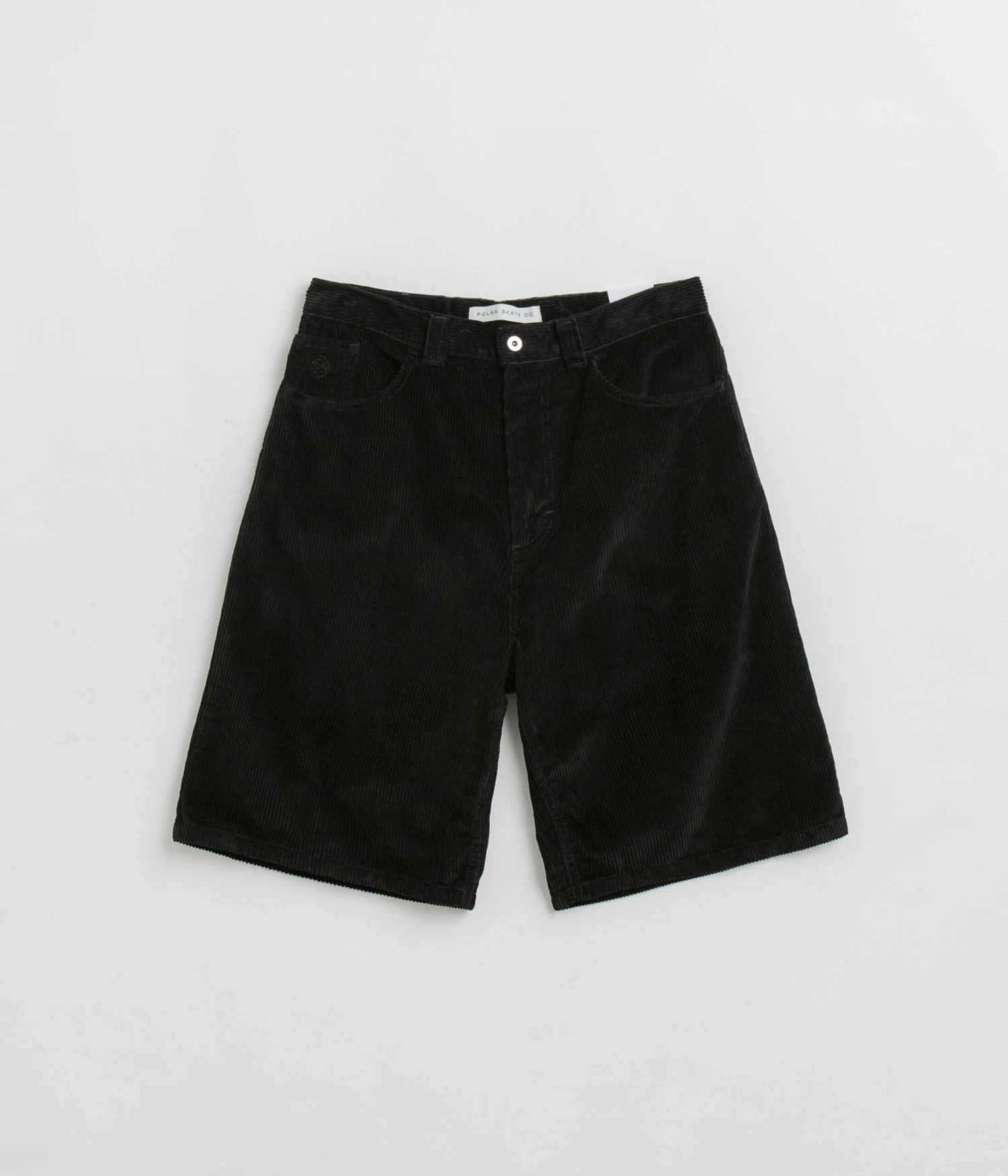 Polar Big Boy Cord Shorts in Black. Made from 100% cotton corduroy and cut to an above-knee length, these Polar shorts are designed with single button secured zipper fly and with five pocket storage. Finished in a shade of black with a baggy fit and with an embroidered coin pocket graphic.