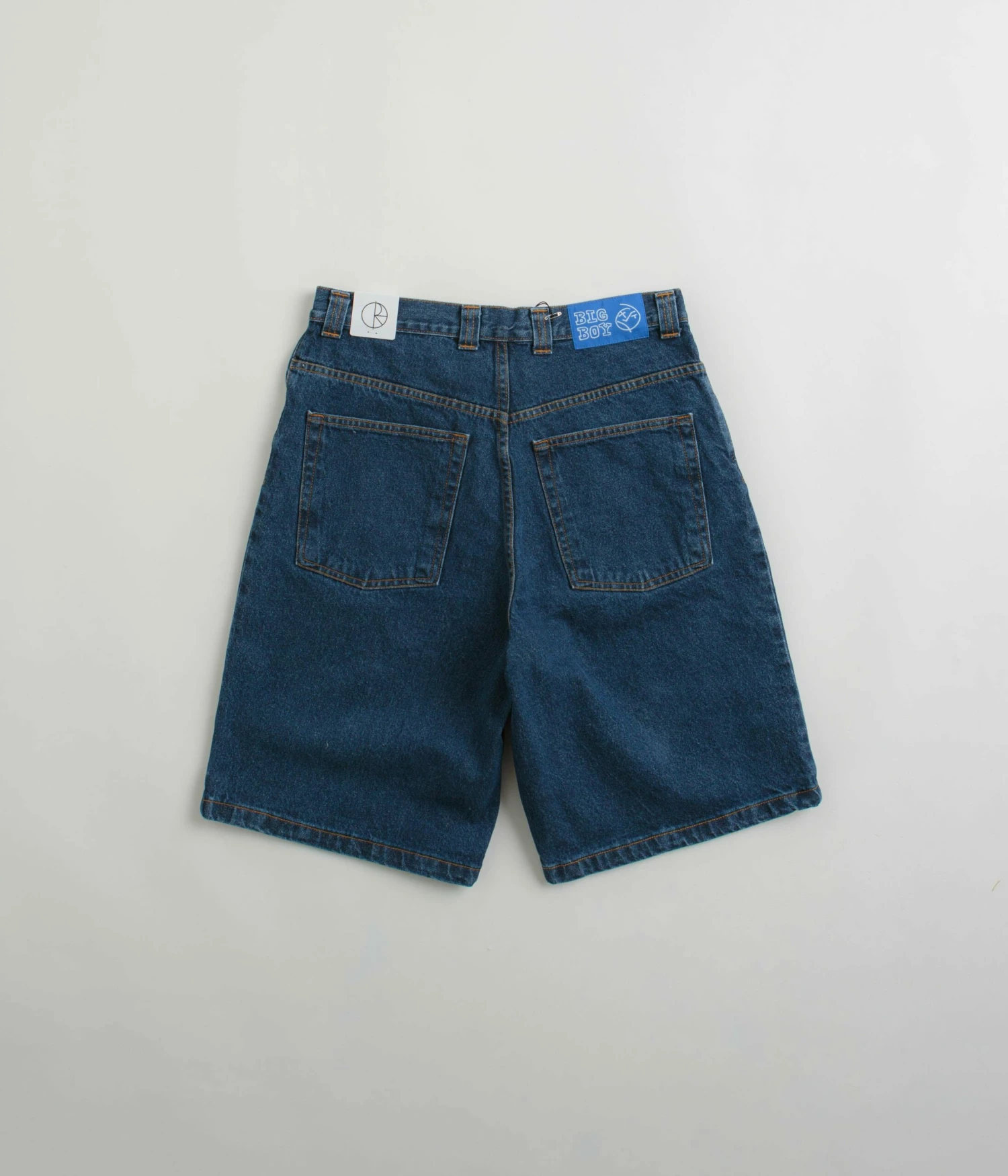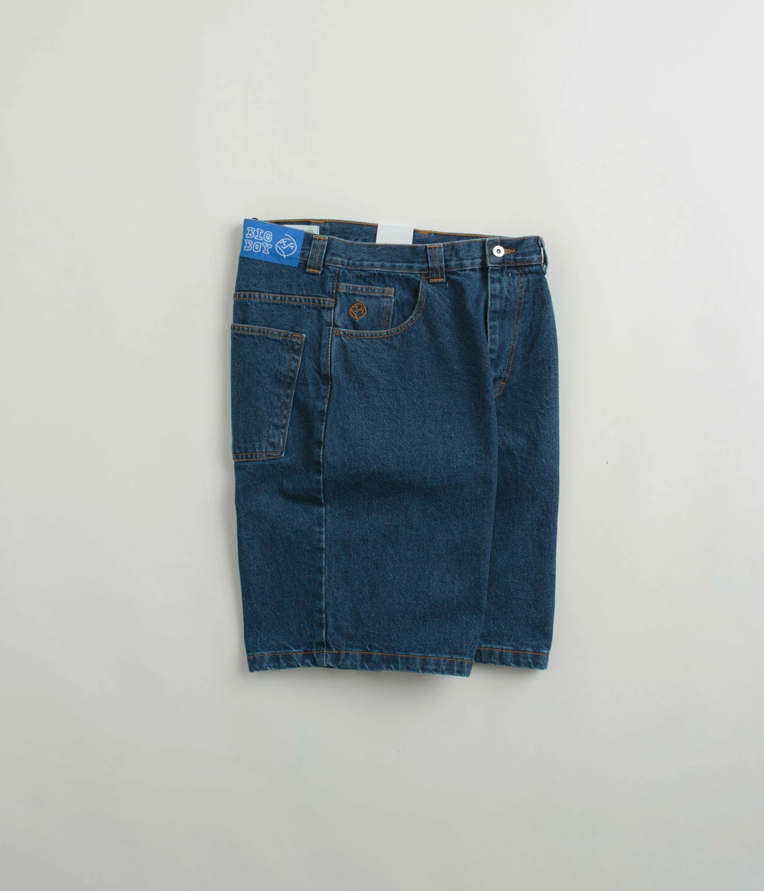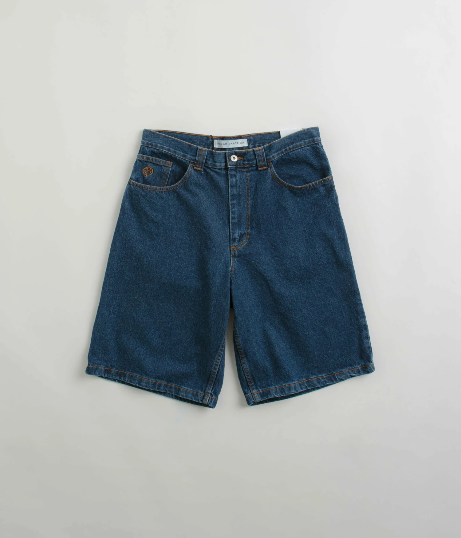 Polar Big Boy Shorts in Dark Blue. A returning favourite for SP21, these ‘90s inspired Big Boy Shorts arrive as a shortened variant of their tapered-leg jean counterpart. Made in Poland from 100% cotton-denim with a midweight 435gsm composure that’s designed to cater to even the most strenuous of lifestyles, these baggy-fitting shorts are styled with a belt-loop shadowed waistband, colour-contrasting stitchings across all high-stress areas and with a custom YKK button fastening above its concealed YKK zipper fly. Two curve-entry pockets are mirrored by two drop-pockets beneath the exposed yoke on the rear, whilst the embroidered Polar character across the right-side coin stash is neatly complemented by the brand’s OG ‘Big Boy’ brand patch across the seam of the waist.
