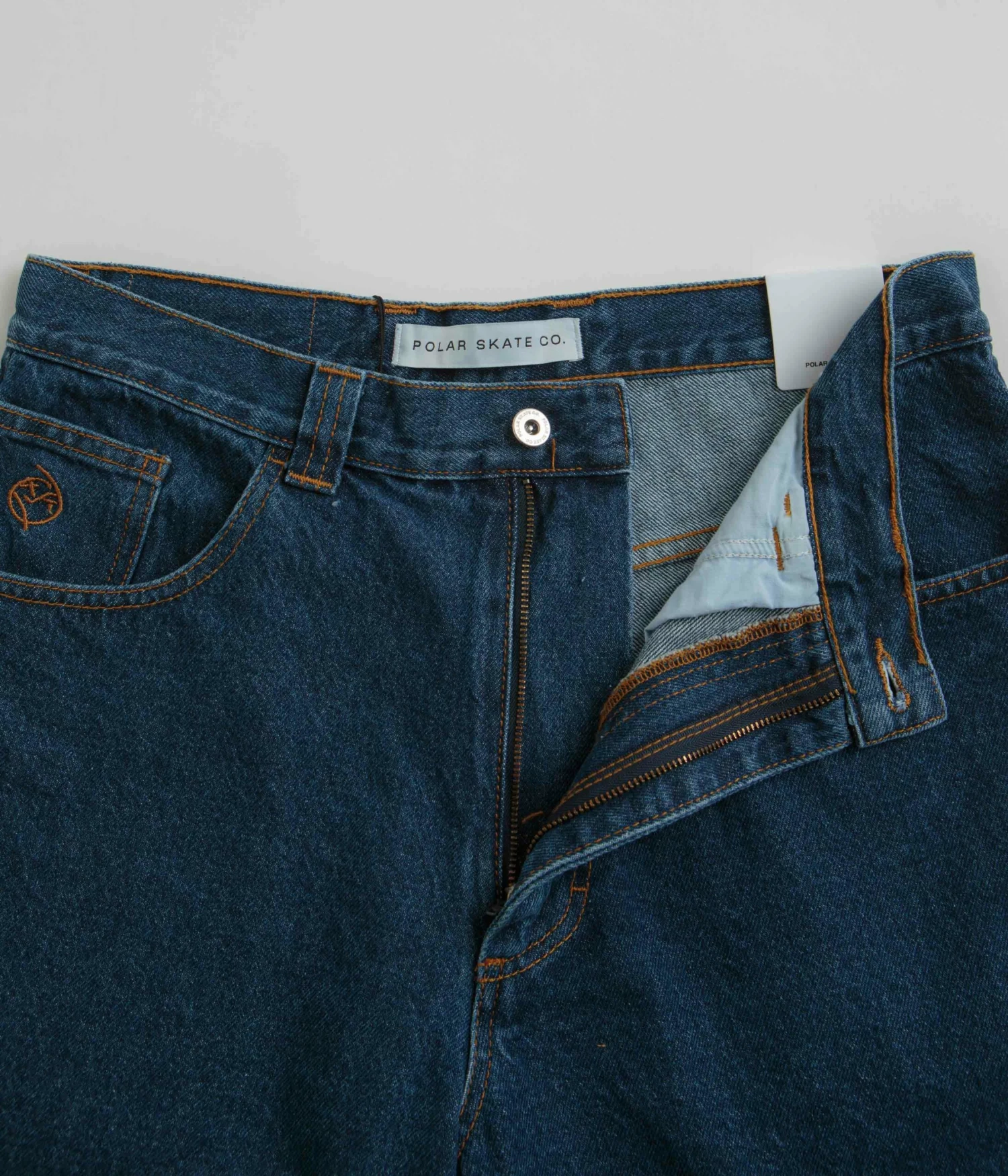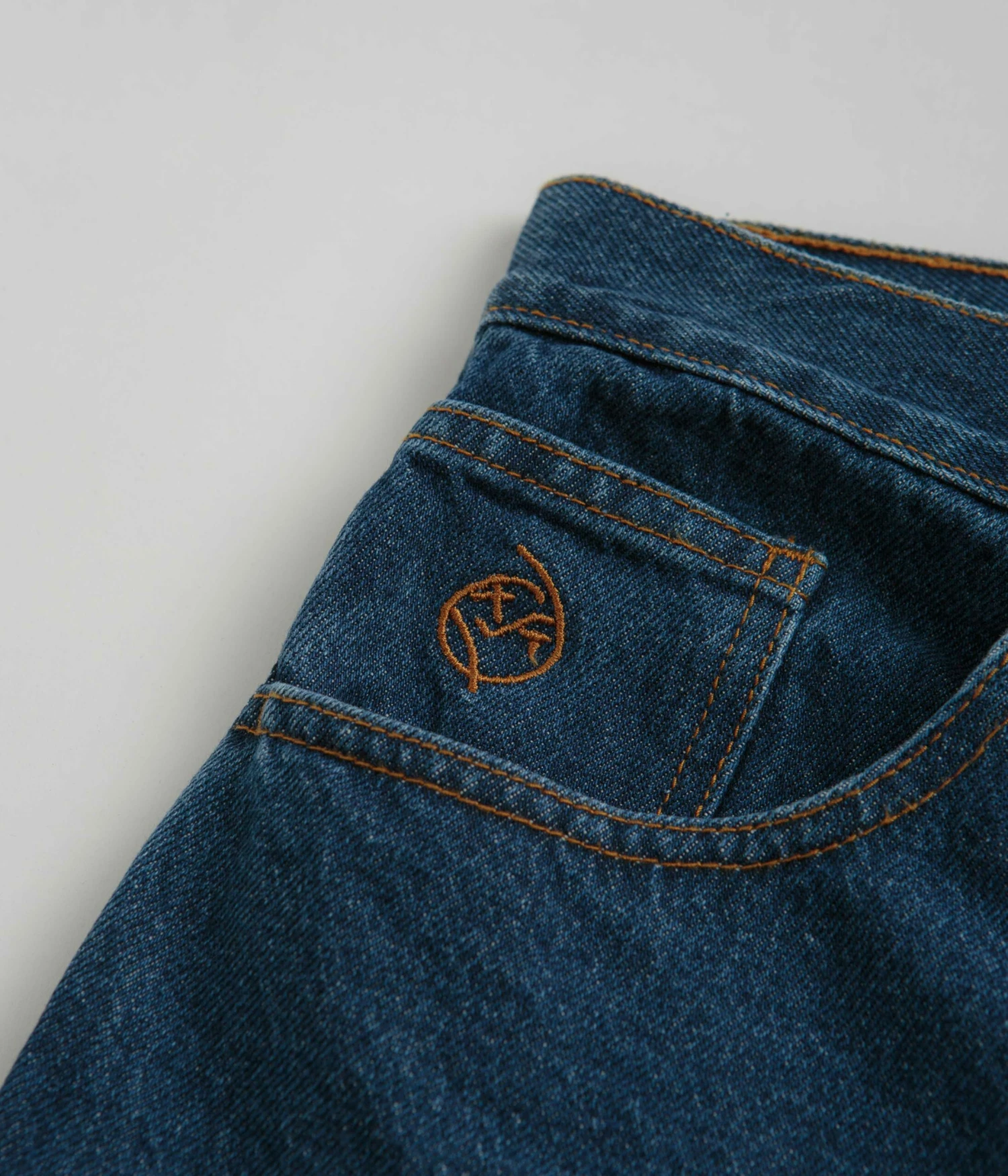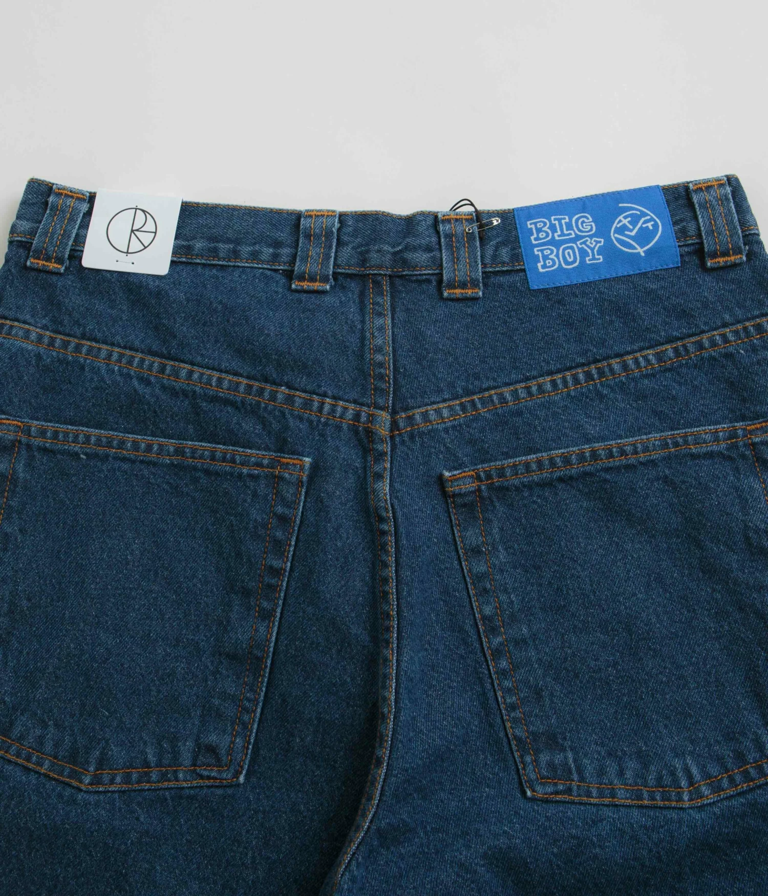 Polar Big Boy Shorts in Dark Blue. A returning favourite for SP21, these ‘90s inspired Big Boy Shorts arrive as a shortened variant of their tapered-leg jean counterpart. Made in Poland from 100% cotton-denim with a midweight 435gsm composure that’s designed to cater to even the most strenuous of lifestyles, these baggy-fitting shorts are styled with a belt-loop shadowed waistband, colour-contrasting stitchings across all high-stress areas and with a custom YKK button fastening above its concealed YKK zipper fly. Two curve-entry pockets are mirrored by two drop-pockets beneath the exposed yoke on the rear, whilst the embroidered Polar character across the right-side coin stash is neatly complemented by the brand’s OG ‘Big Boy’ brand patch across the seam of the waist.