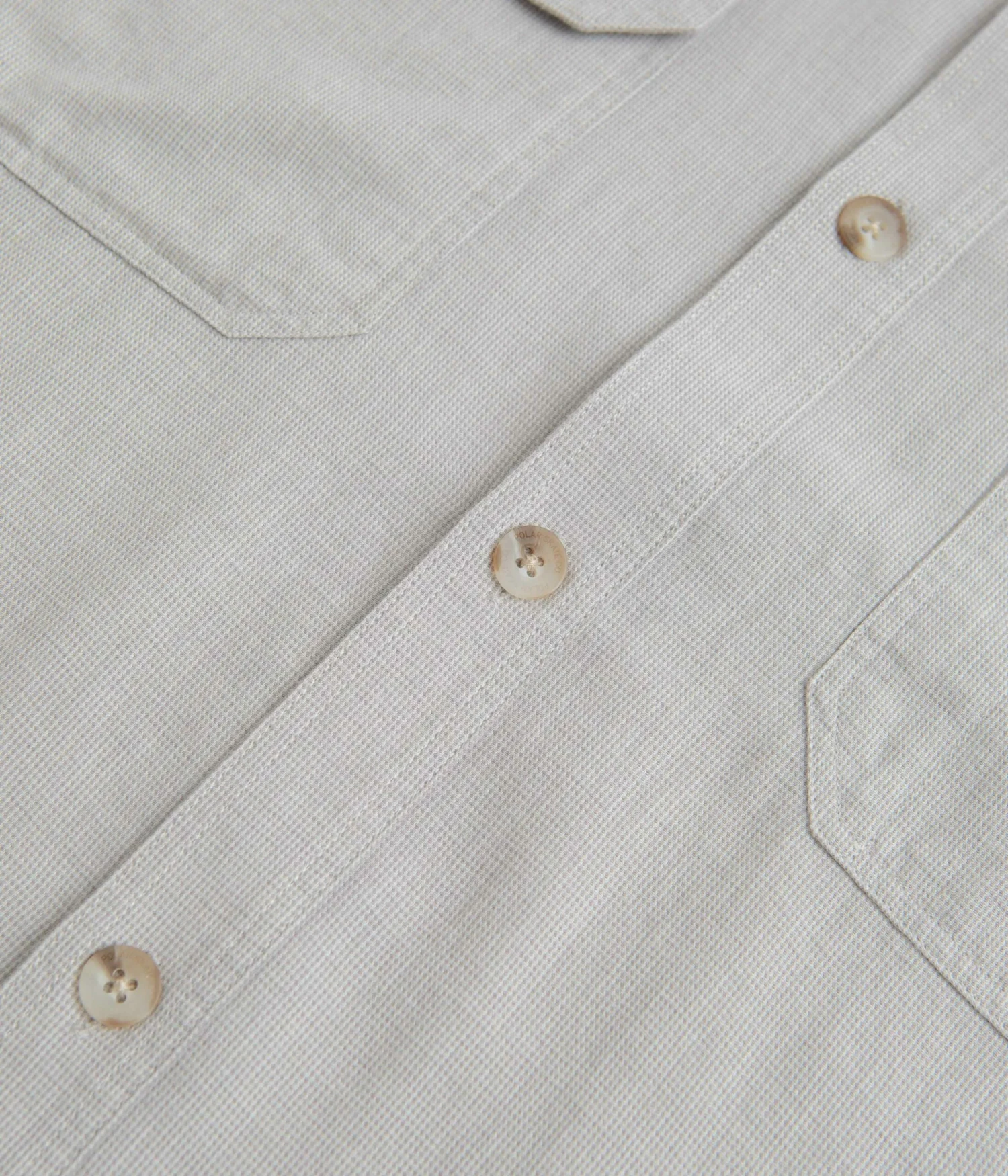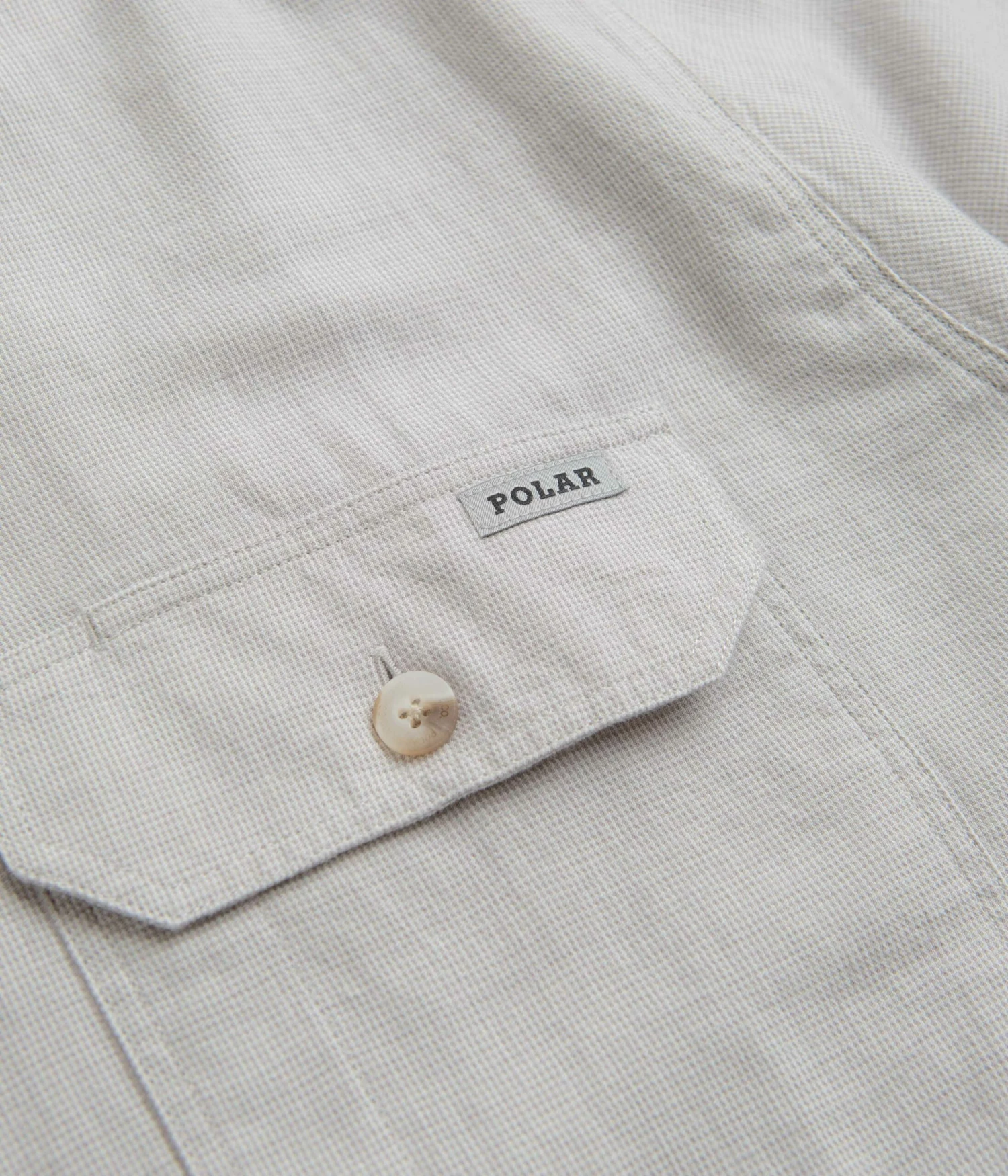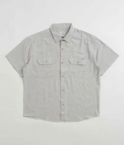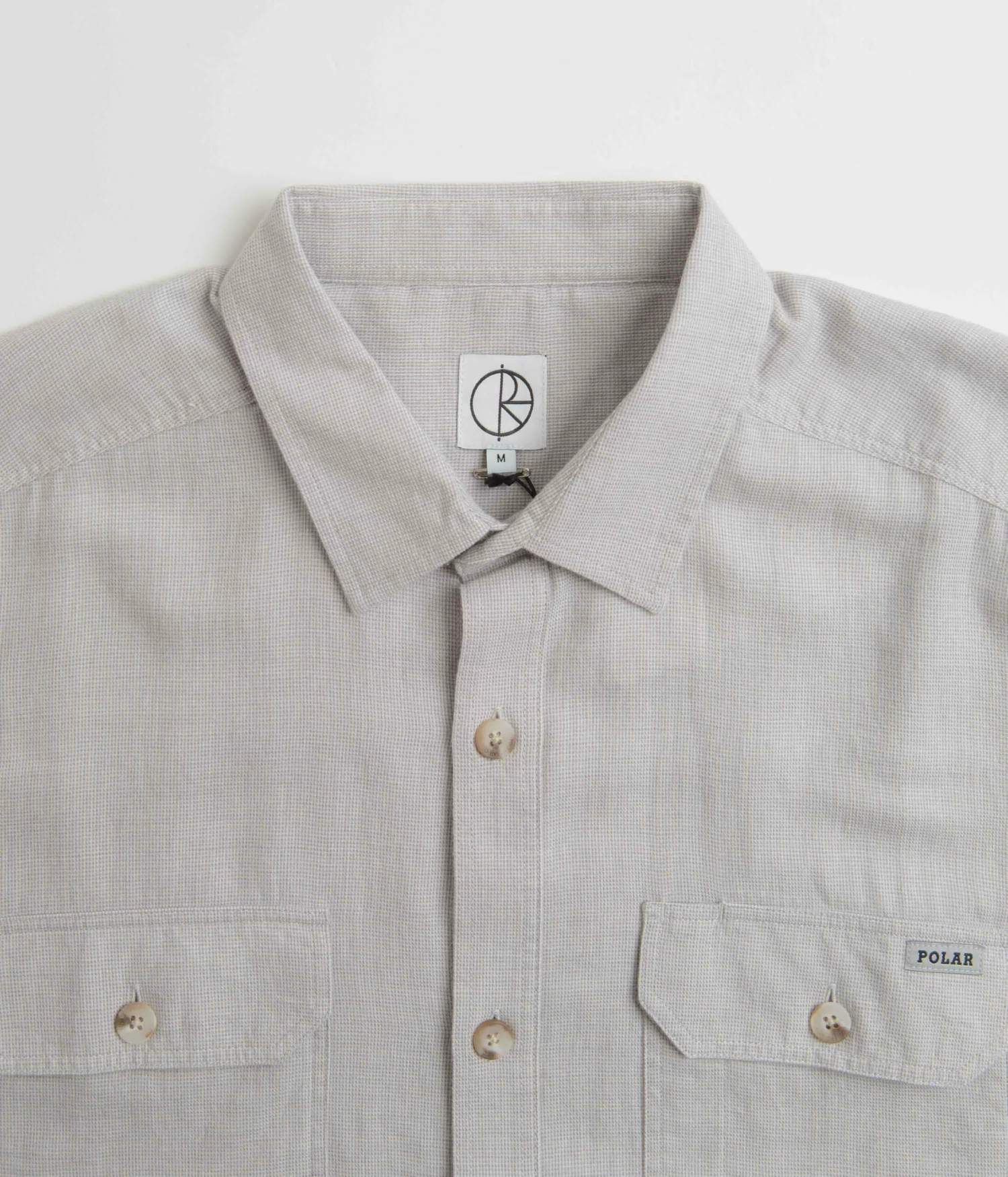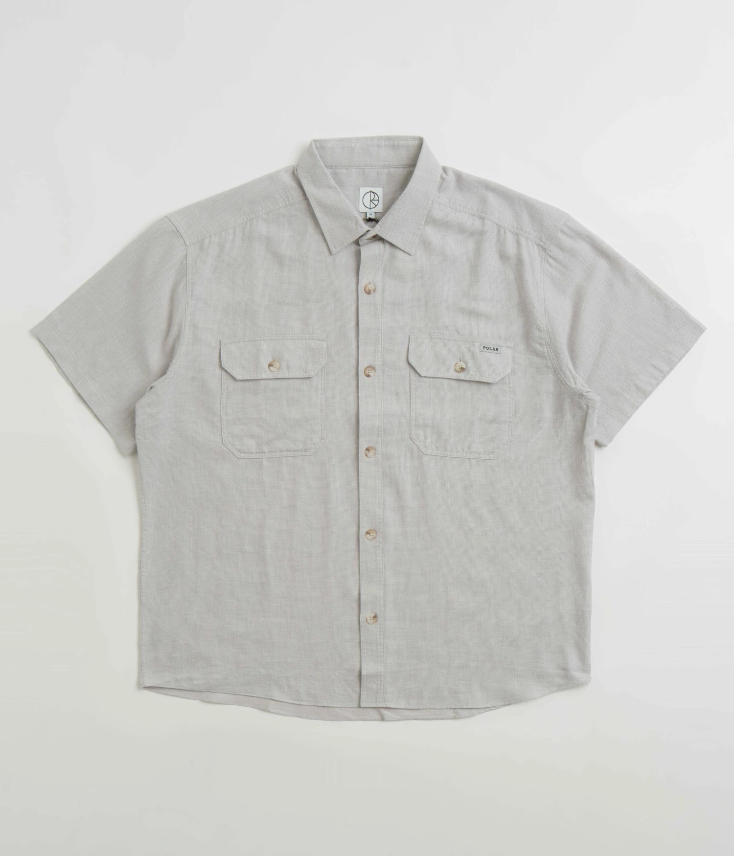 Polar Bob Short Sleeve Shirt in Grey. Tailored to an oversized fitting from a thin vyella mix, this Polar shirt is made from a cotton-wool blend. Featuring a classic stand collar, a full length faux tortoise button fastening and a curved hem, this grey Polar shirt is finished with two button-down chest pockets and woven flag label branding.