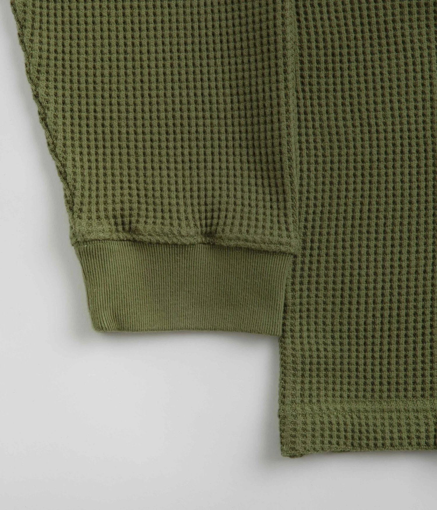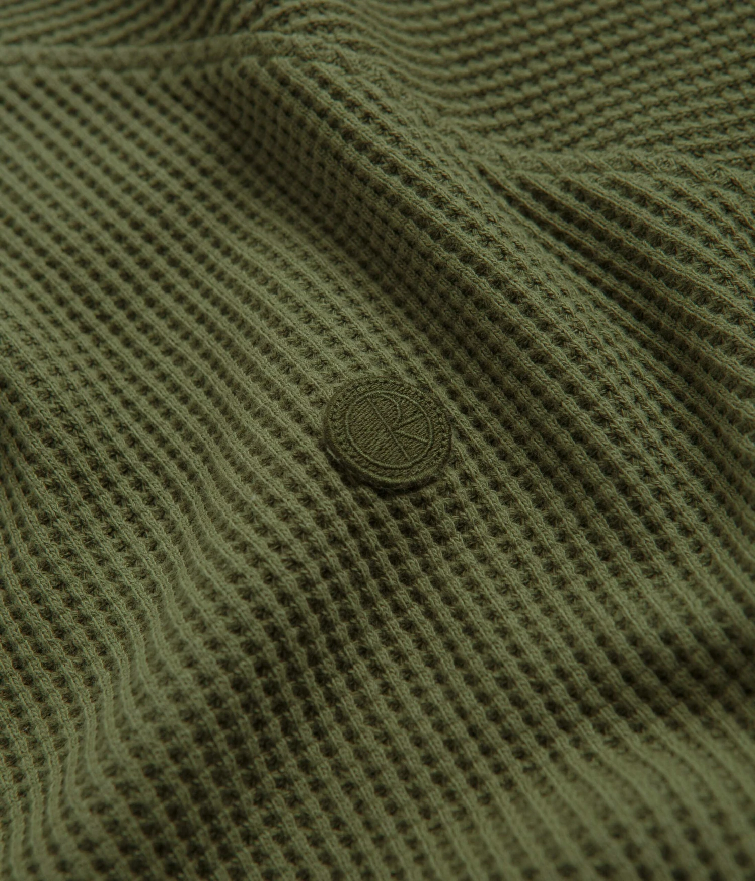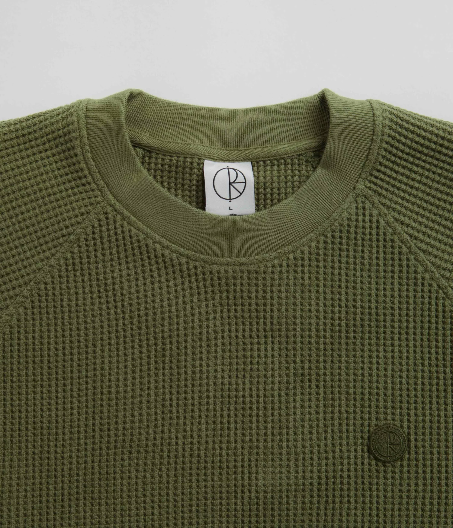 Polar Dan Long Sleeve T-Shirt in Army Green. Part of the brand’s latest release, this regular fitting Polar t-shirt is made from 100% cotton. A waffle jersey design with a garment dyed construction, a rib knit crew collar and raglan sleeves, this army green Polar t-shirt is finished with ribbed cuffs and with an embroidered patch logo.