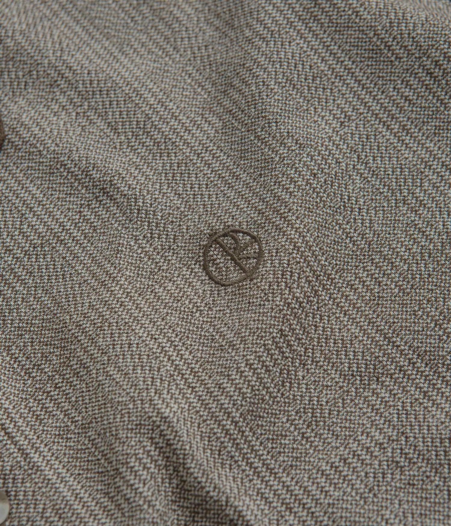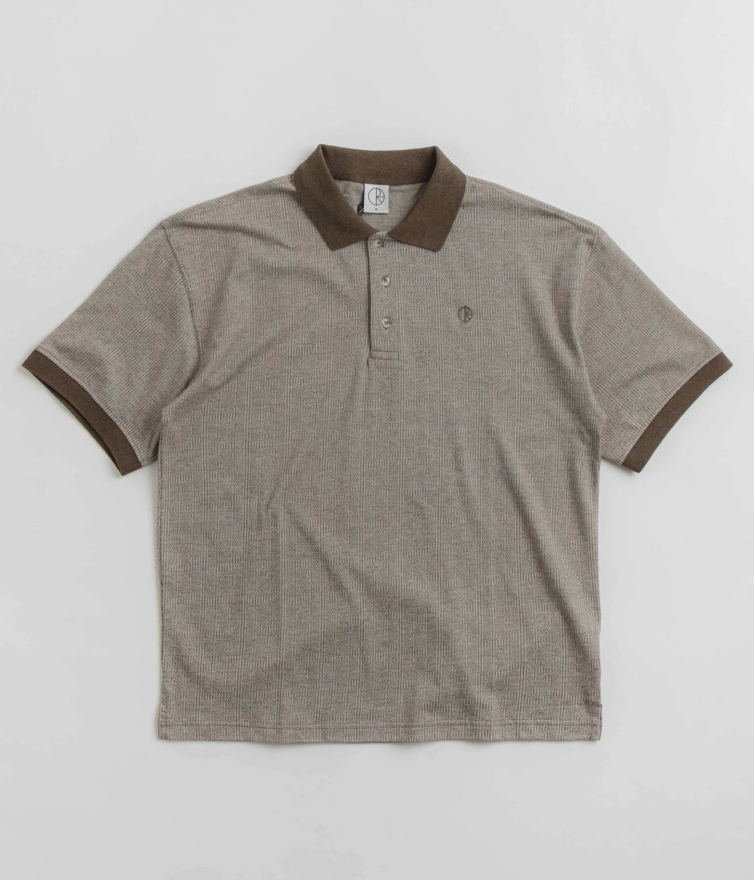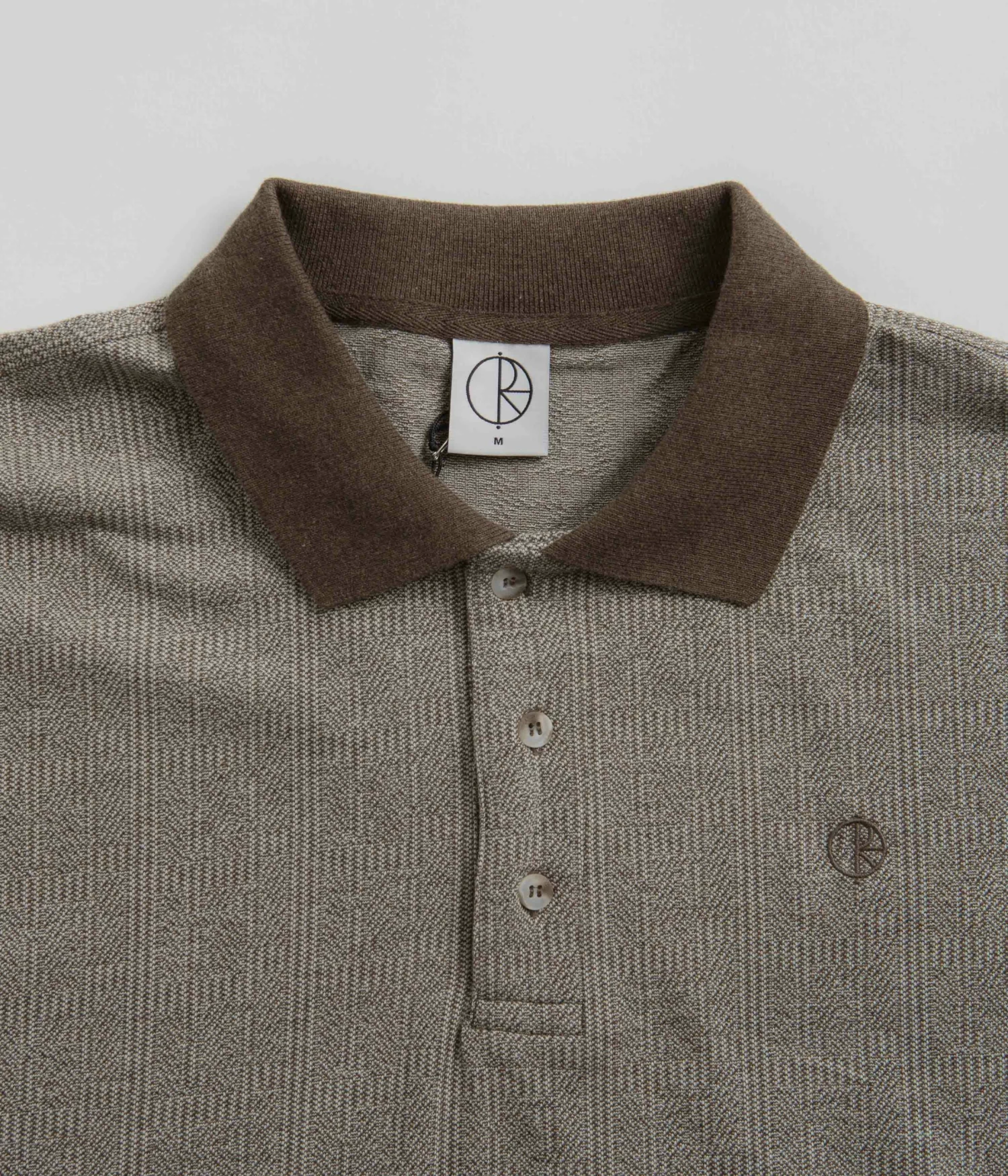 Polar Illusion Surf Polo Shirt in Brown. Vintage inspired and made from 100% cotton, this oversized Polar polo shirt is designed with an interlock knit fabric and faux tortoise hardware. Featuring a triple button placket, dropped shoulders and a V-slit hem, this brown Polar polo is finished with custom artwork by PSC.
