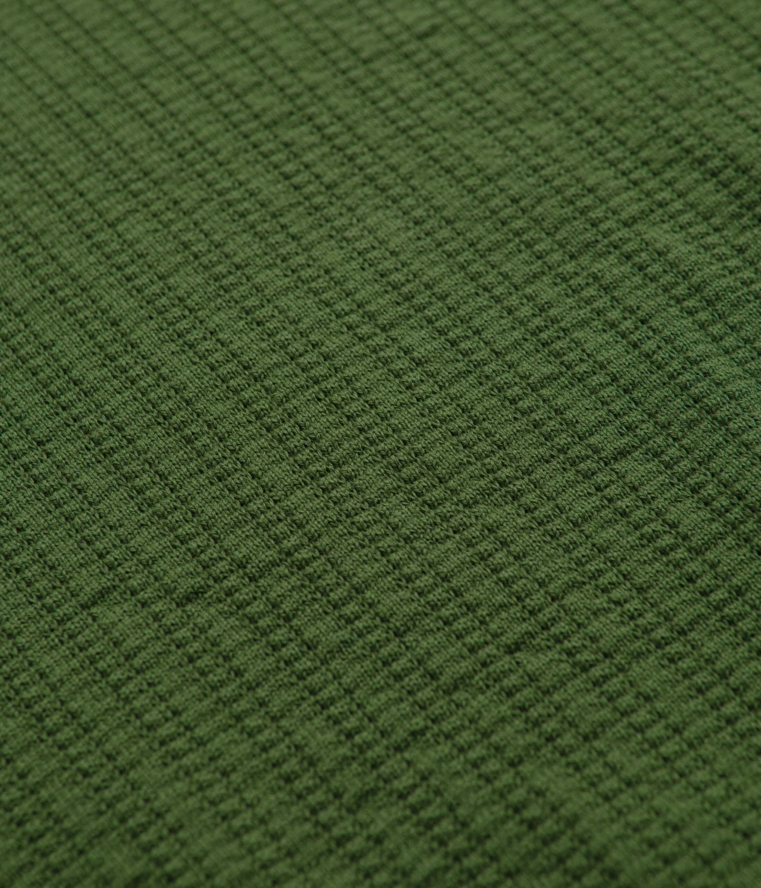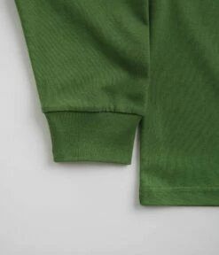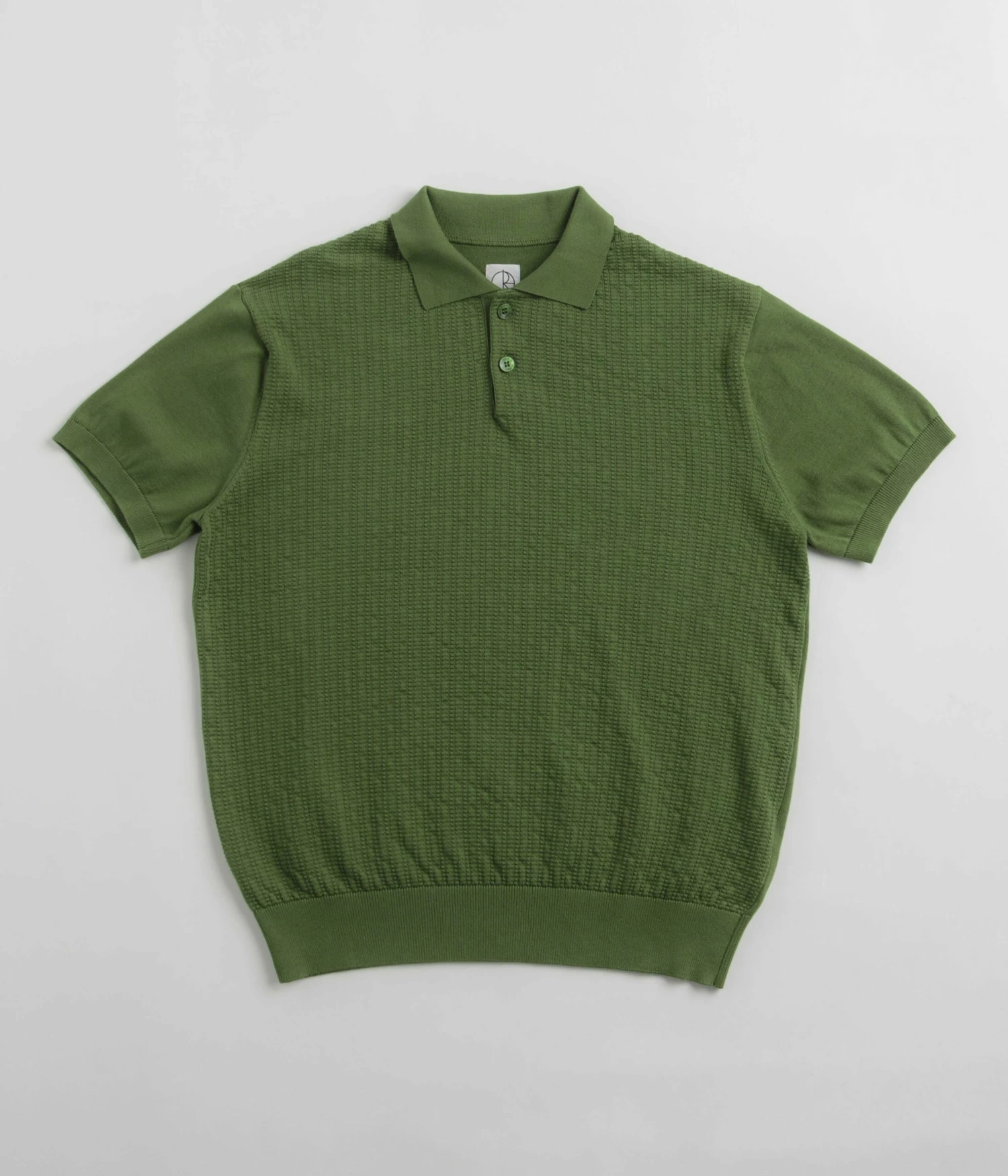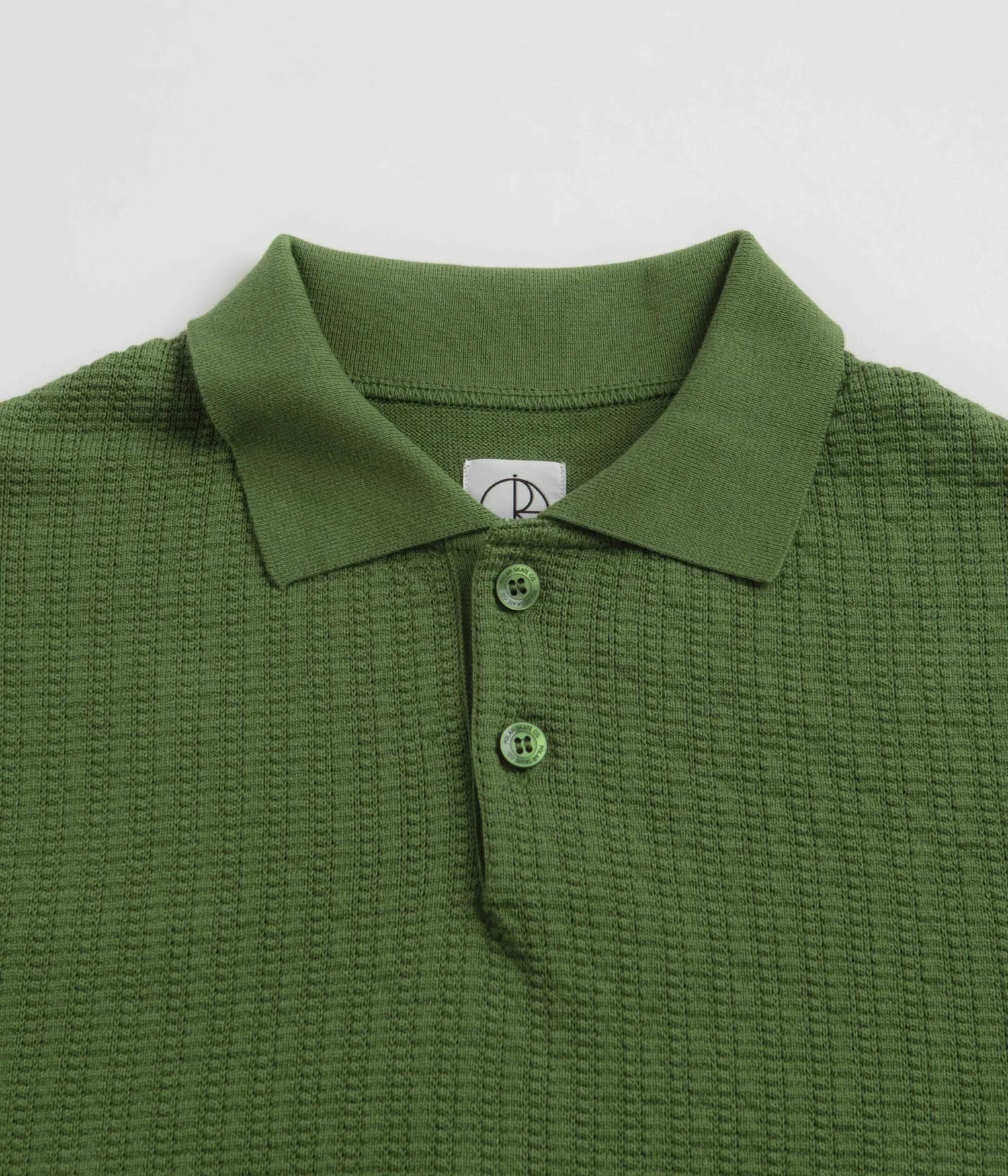 Polar Miles Polo Shirt in Garden Green. Vintage inspired with a retro-style fit, this cropped Polar shirt is made from 100% cotton with a structured jersey knit construction. Featuring faux pearl buttons, a stand collar and a double button placket, this green Polar polo shirt is finished with ribbed cuffs and a woven elastic hem.