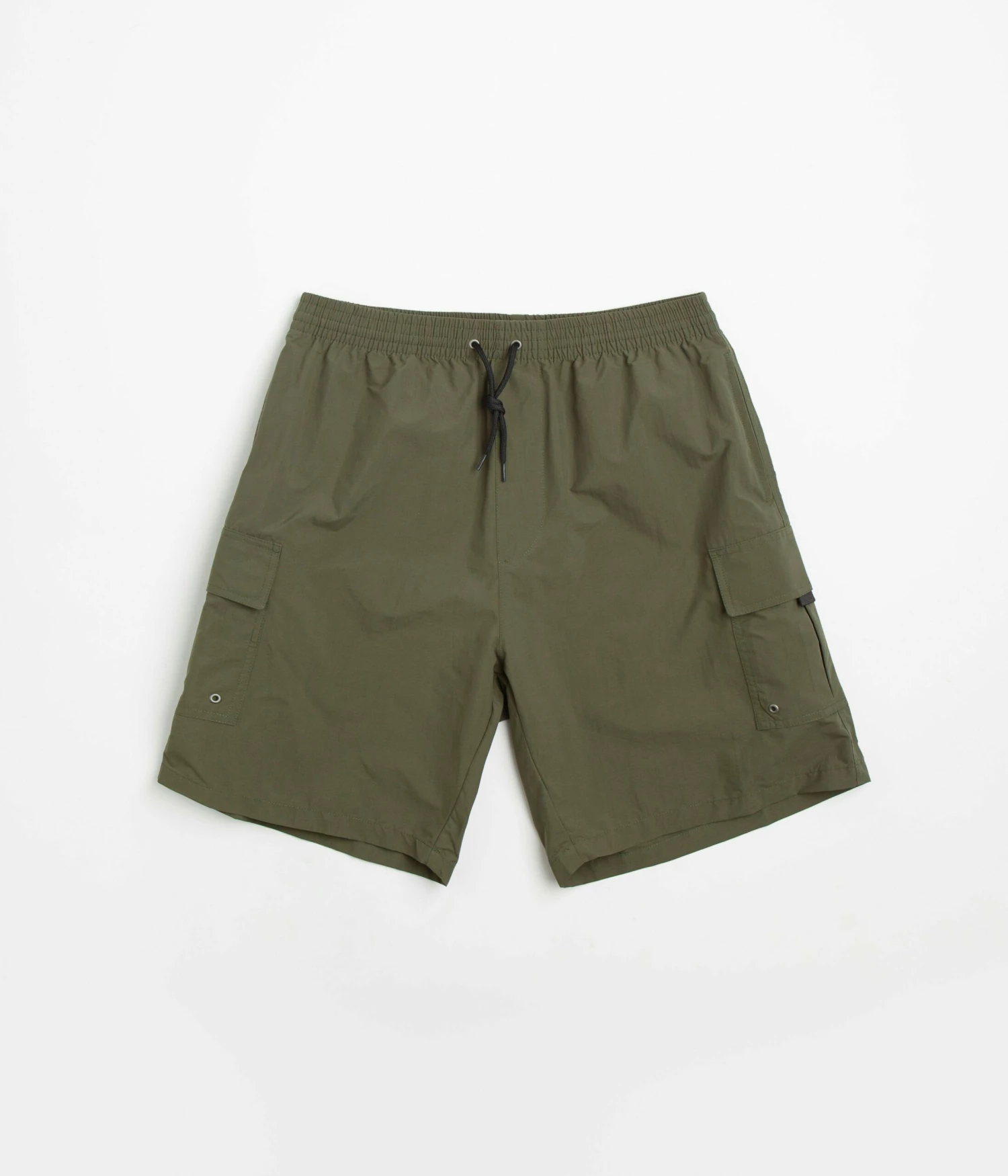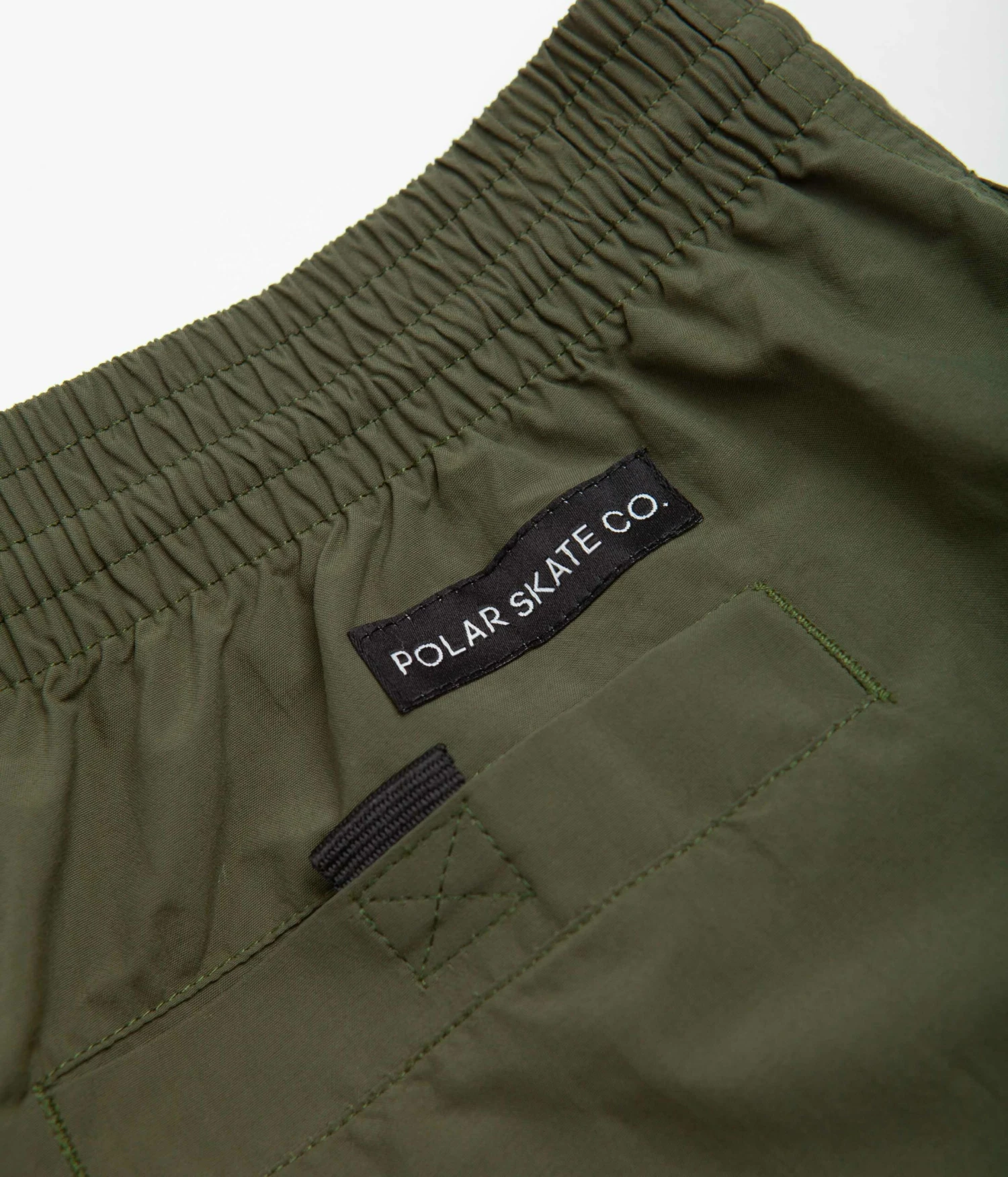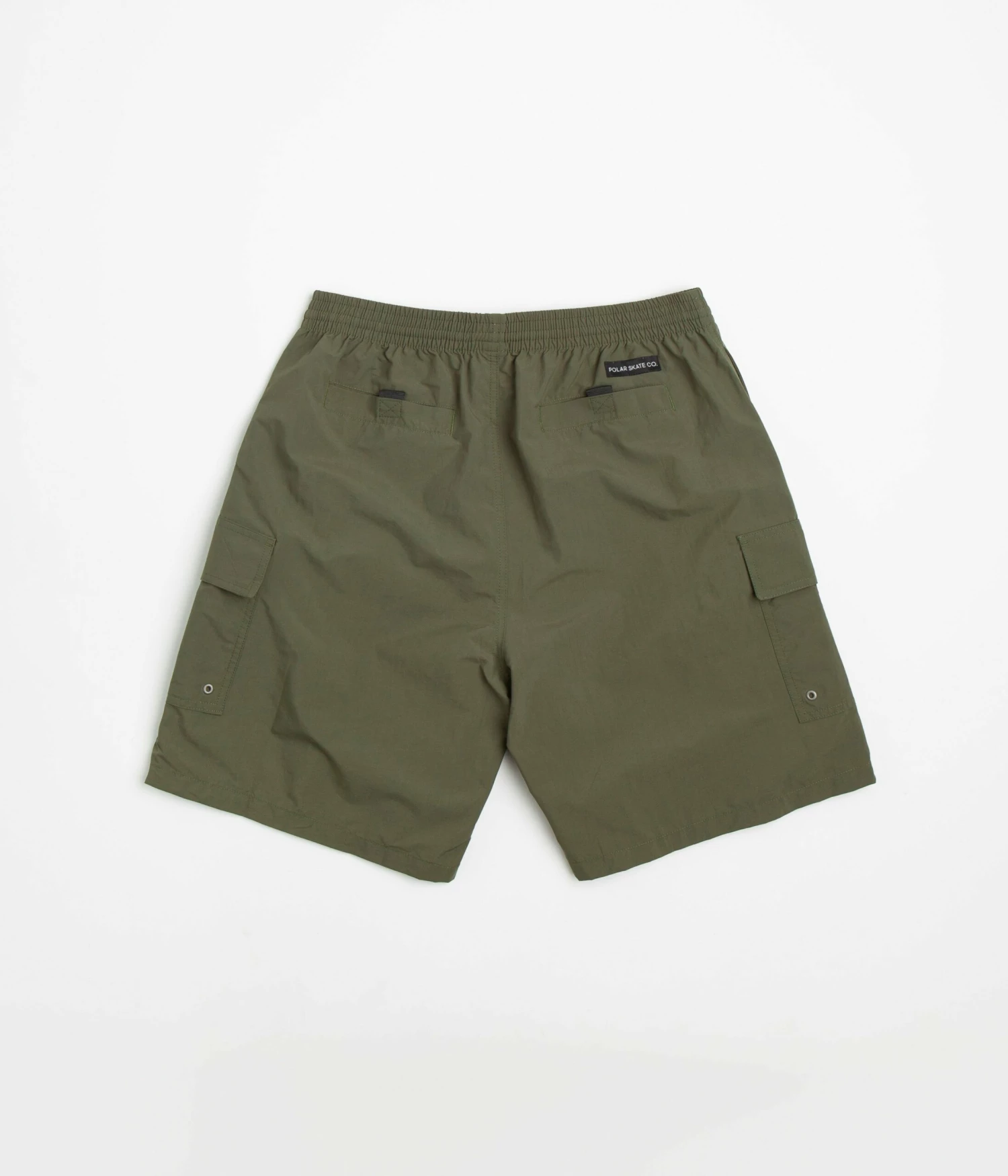 Polar Utility Swim Shorts in Dark Olive. Fast drying and styled with a 100% polyamide shell, these above-knee Polar shorts are styled with an elasticated drawstring waistband and tonal stitched seams. Tailored to a freedom style fitting with two side pockets, two rear pockets, two utility pockets and with woven flag label branding.