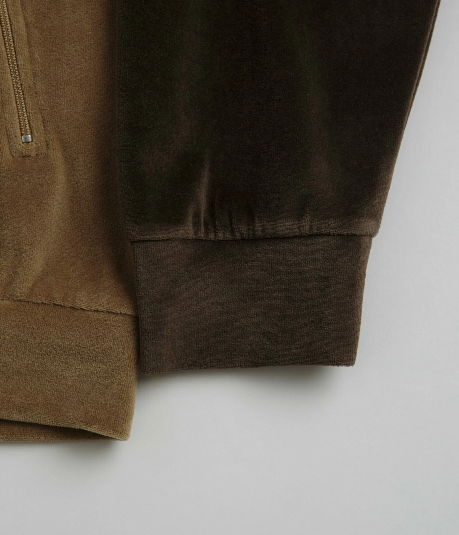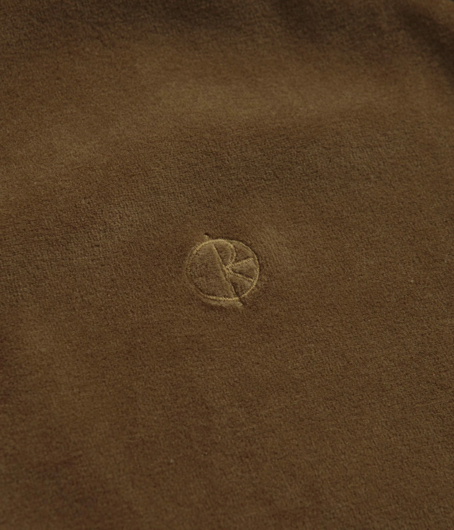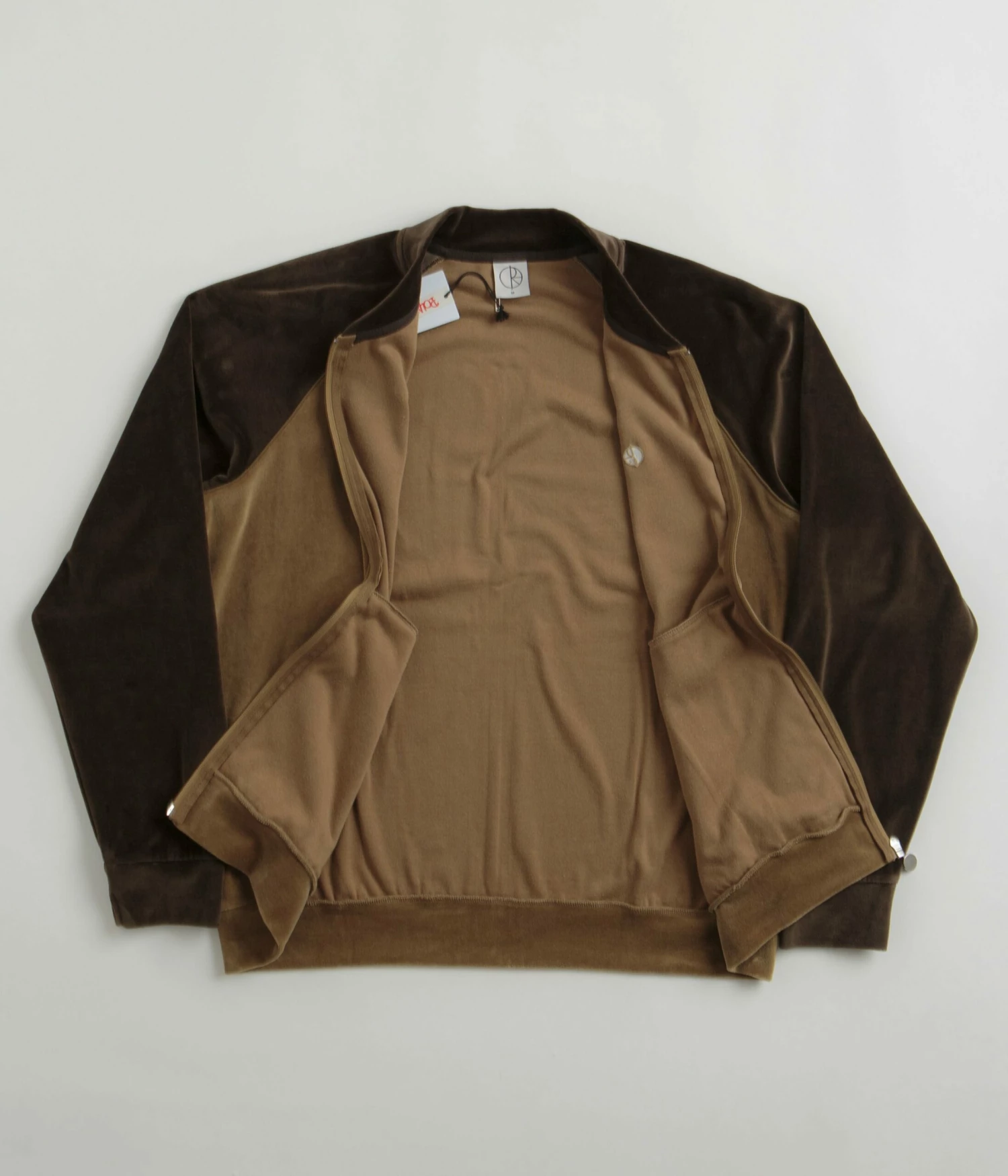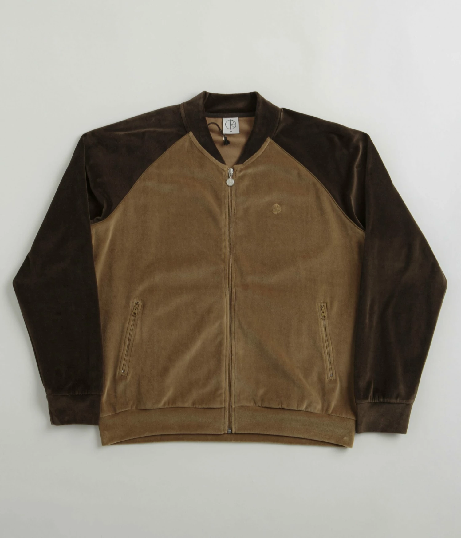 Polar Velour Ralph Jacket in Brown. Made from a cotton-polyamide blend with a velour fabrication, this regular fitting Polar jacket is designed with a full length zipper fastening. Featuring a bomber-style collar, raglan sleeves, ribbed cuffs and a woven elastic hem, this brown Polar jacket is finished with contrast sleeves, two zippered pockets and with tonal logo embroidery.