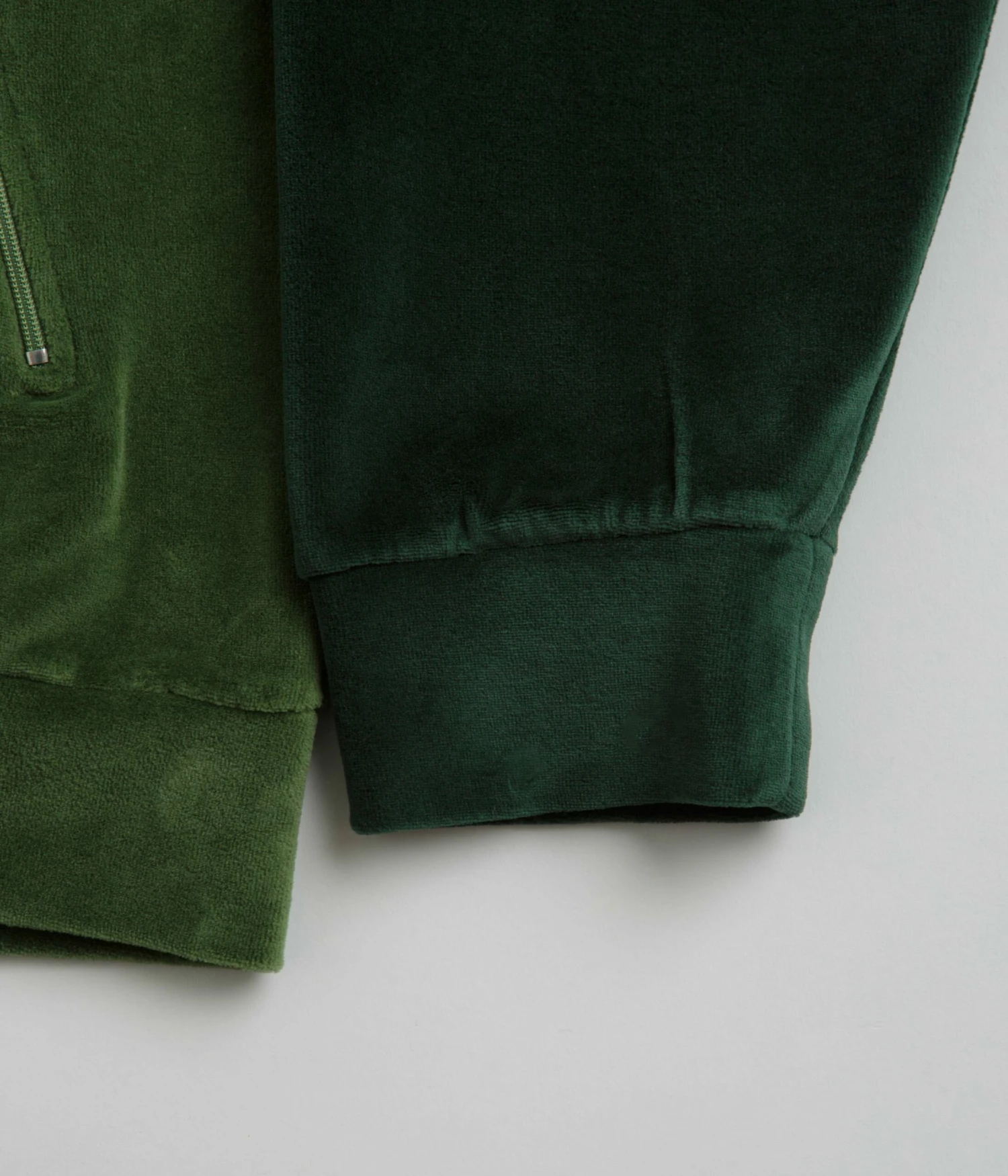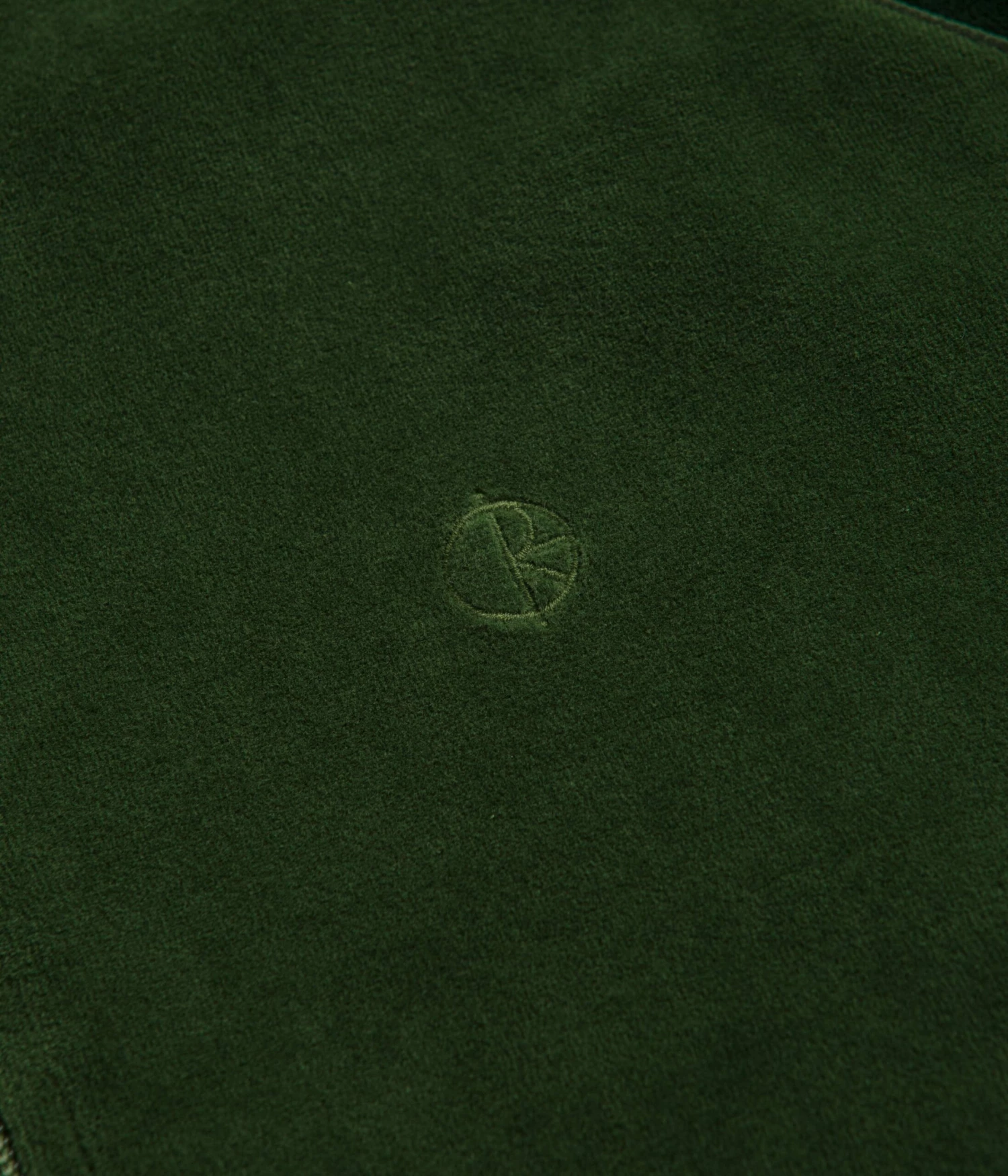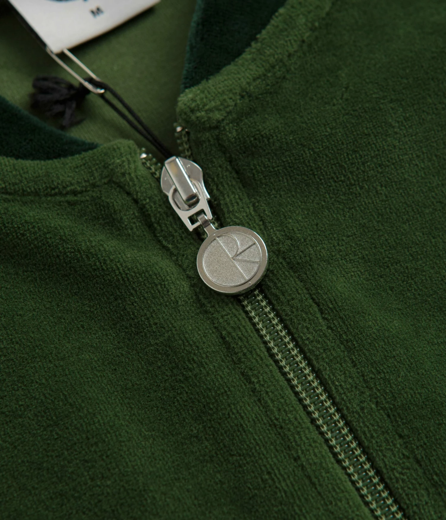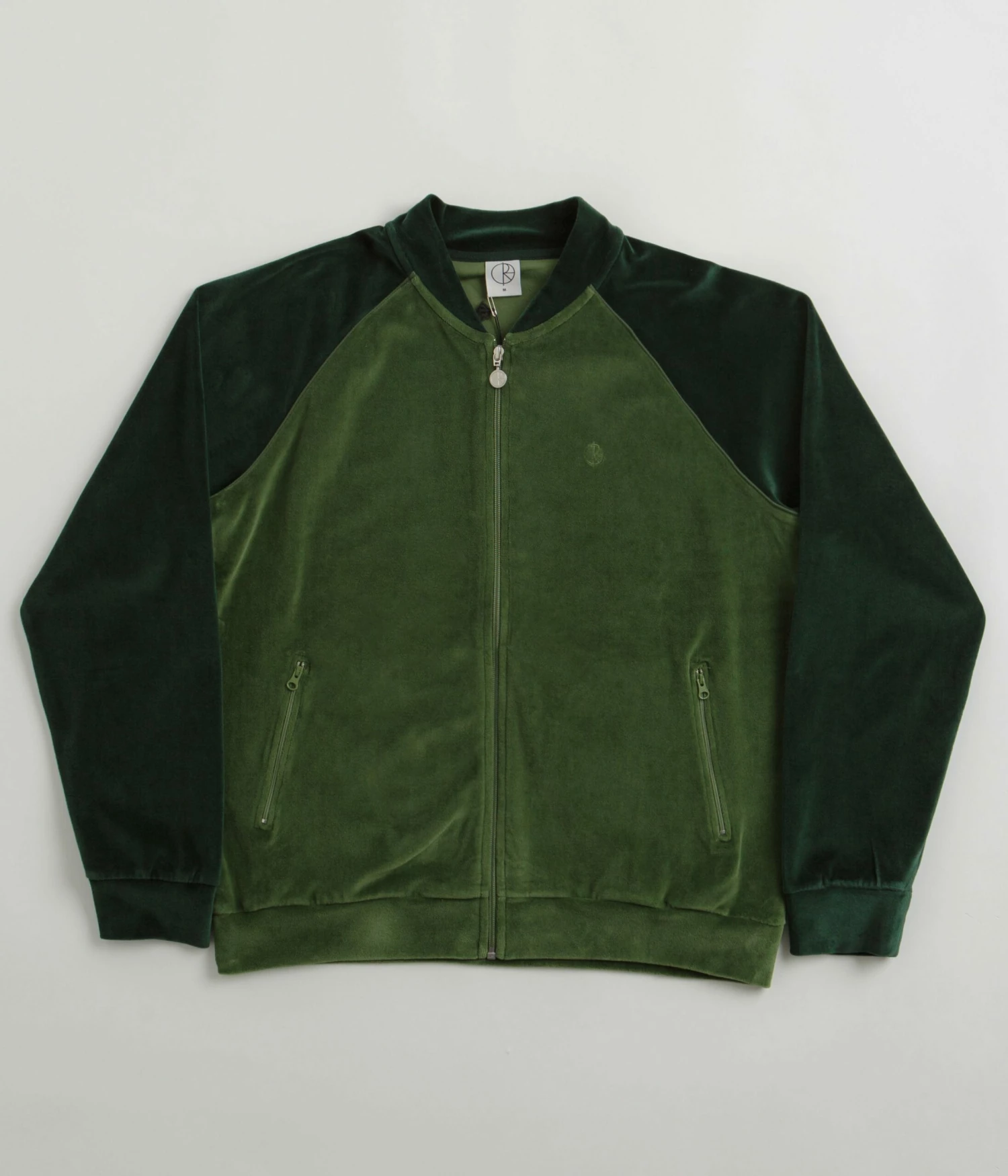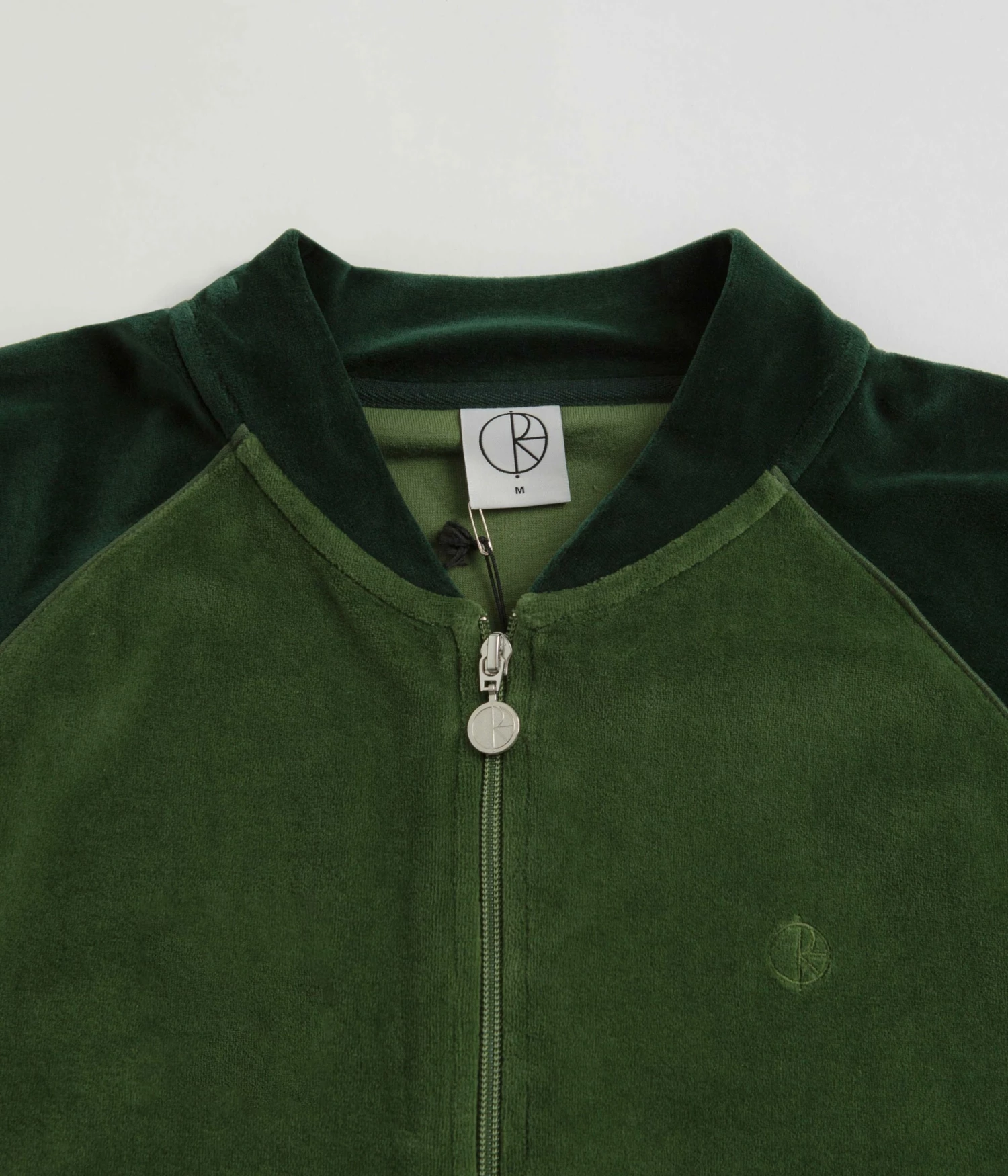 Polar Velour Ralph Jacket in Garden Green. Varsity inspired and made from a cotton-polyamide blend, this regular fitting Polar jacket is designed with a bomber-style collar, raglan sleeves and ribbed cuffs. Featuring a full length zipper fastening, a custom coin pull and two zippered waist pockets, this green Polar jacket is finished with contrasting sleeves and with tonal logo embroidery.