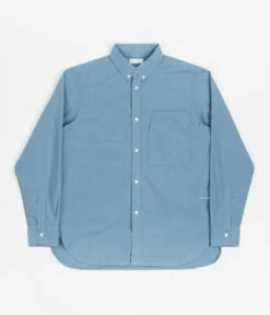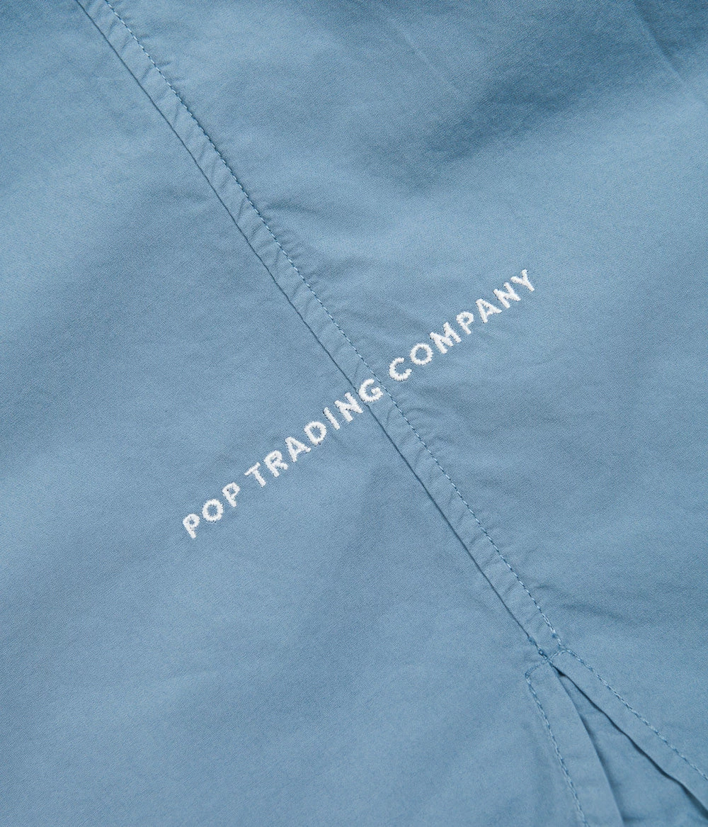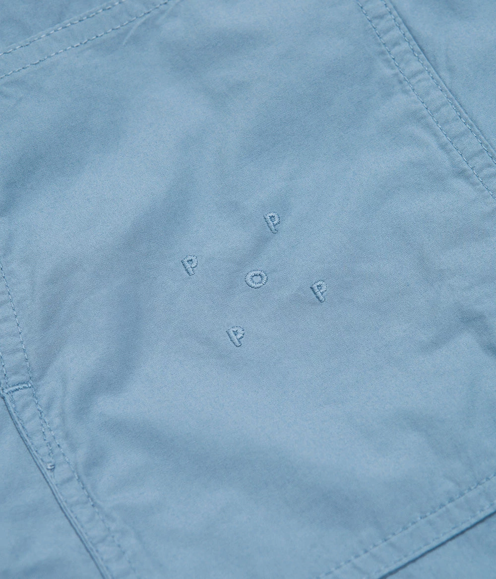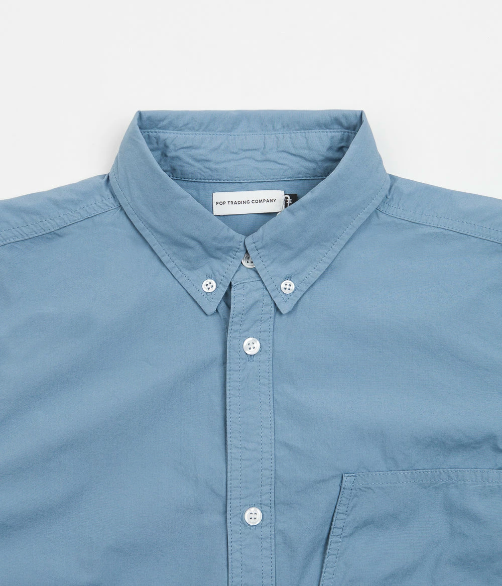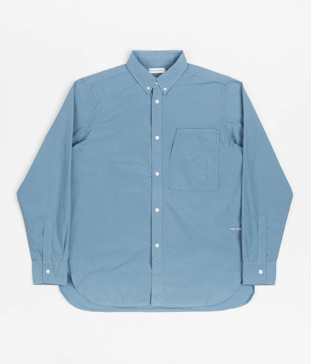 Pop Trading Company BD Shirt in Blue Shadow. Tailored to a regular fitting from 100% cotton poplin, this Pop Trading Company shirt is styled with a three-quarter length button fastening and a button-down collar. Featuring a shaped hemline with V-insert side details, this blue shirt is finished with adjustable cuffs, a single map pocket and with embroidered branding sewn across the left side.