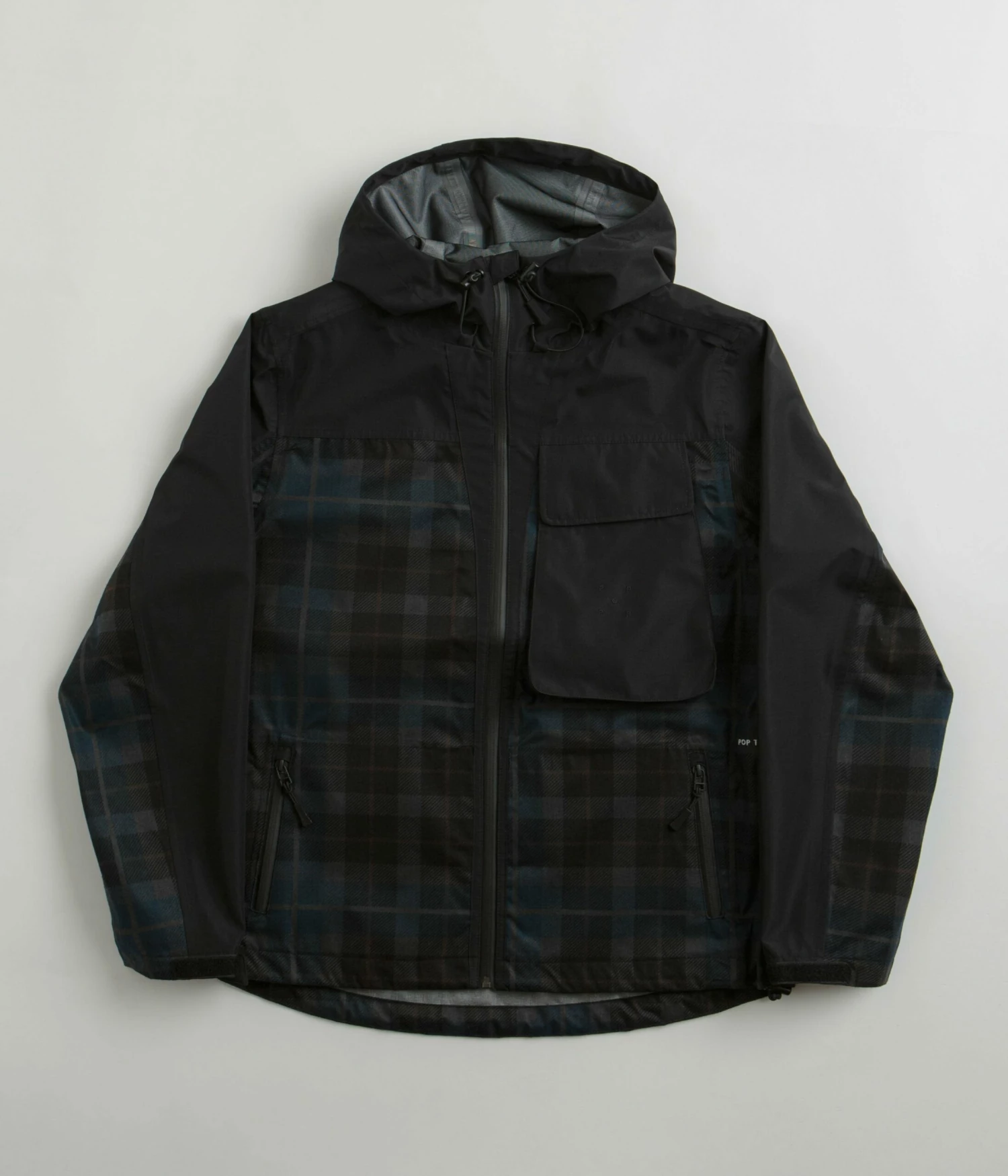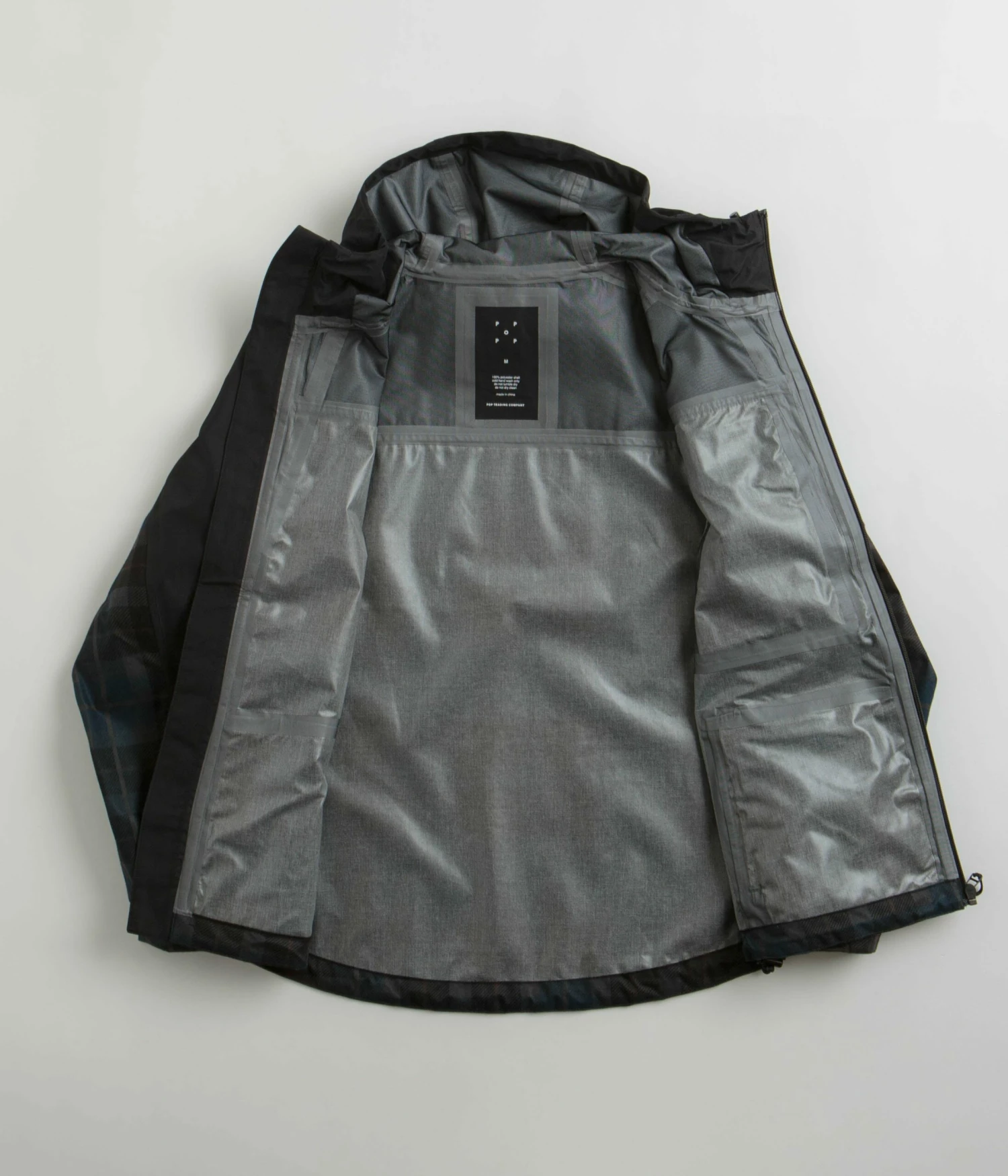 Pop Trading Company Big Pocket Hooded Jacket in Black and Navy Check. Tailored to a regular fitting with a 100% polyester shell, this Pop Trading Company jacket is designed with an adjustable cord-lock hood and a waterproof full-length zipper fastening. Featuring adjustable cuffs, a cord-lock hem and panelled plaid details, this black and navy check Pop Trading Company jacket is finished with two front pockets, a 3D chest pocket and with embroidered POP and left side detailing.