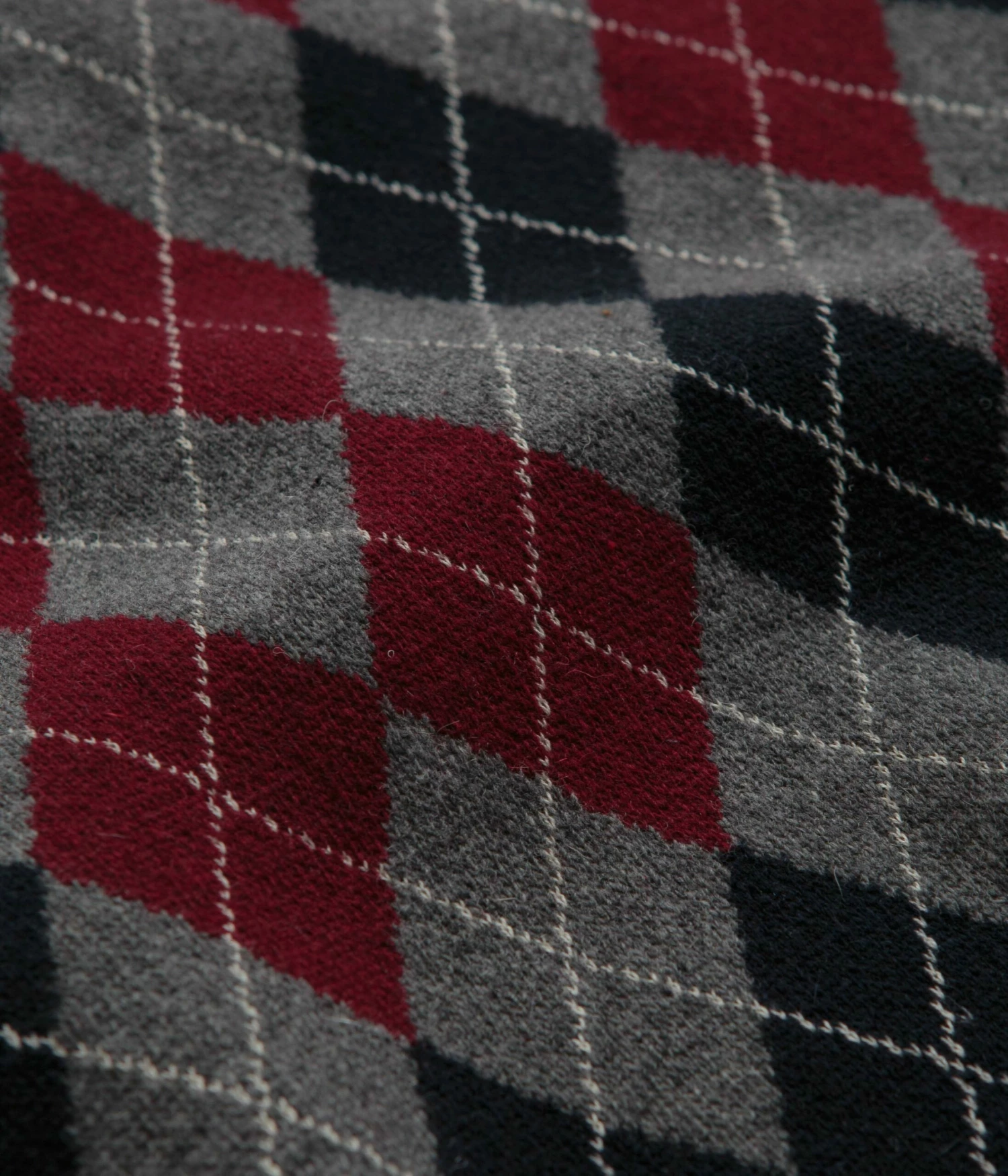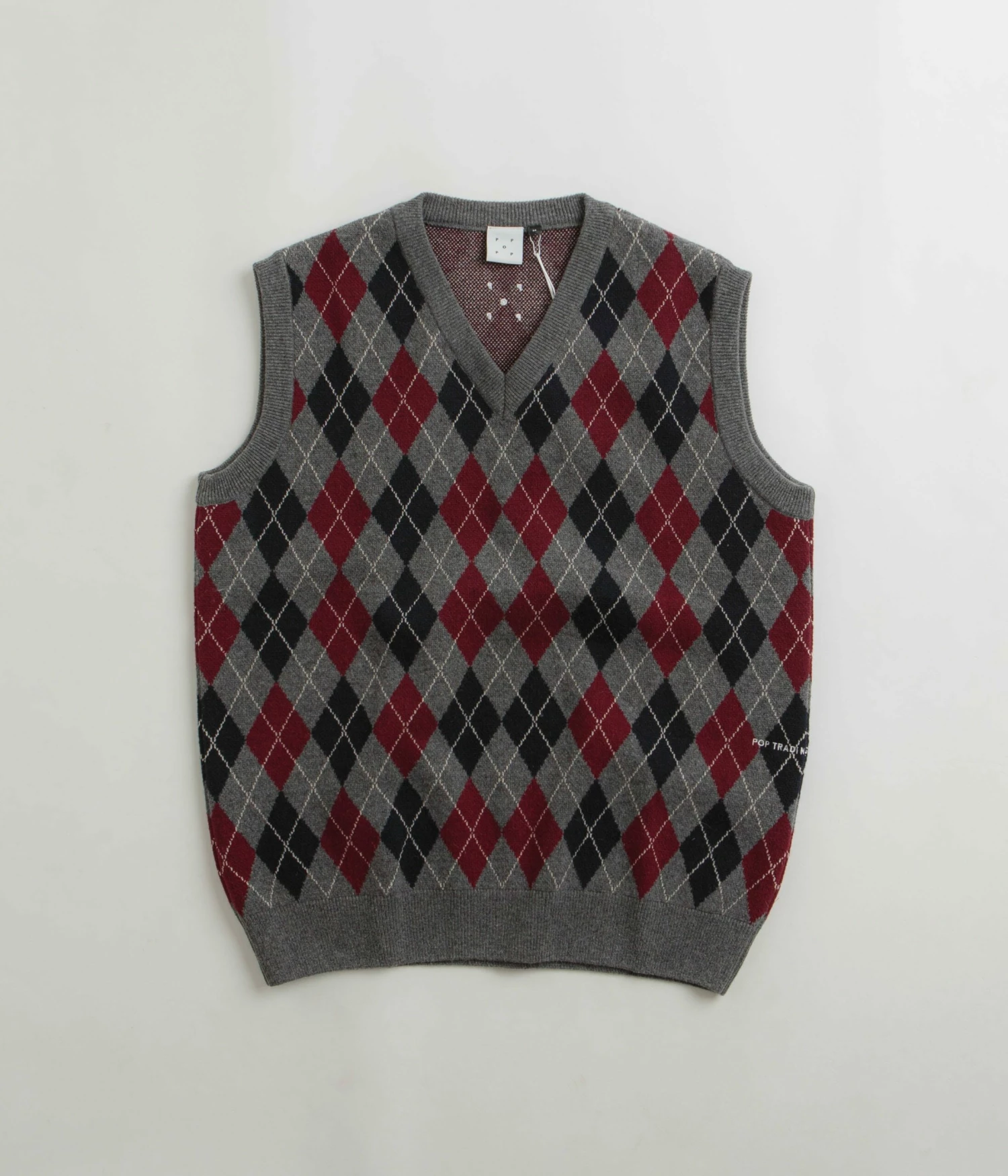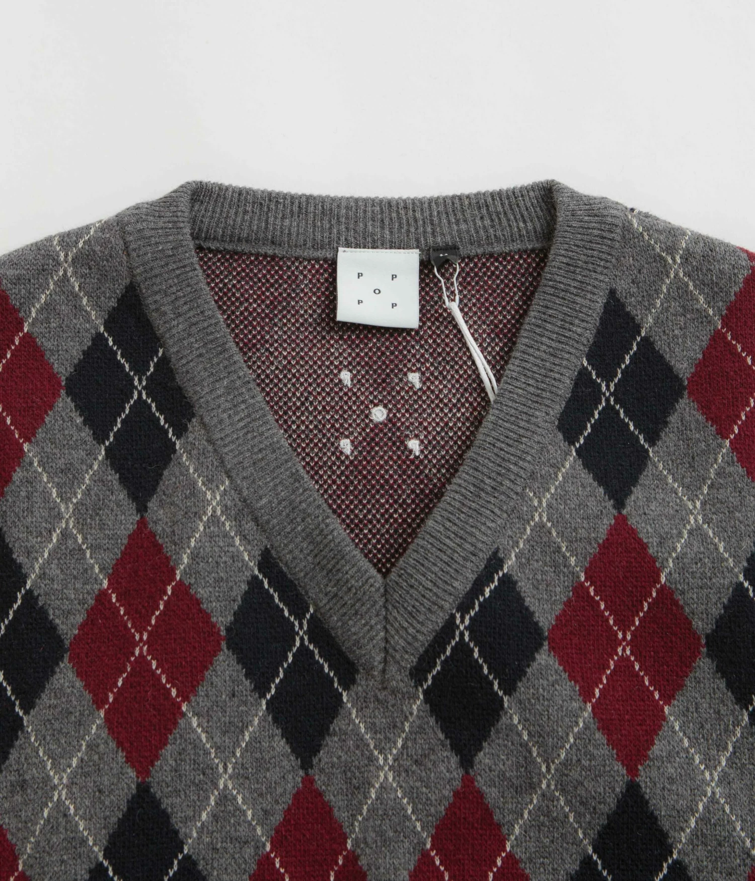 Pop Trading Company Burlington Knitted Spencer Vest in Charcoal and Multi. Made from a lambswool-polyamide blend with a custom diamond knit pattern, this regular fitting Pop Trading Company vest is styled with a classic V-neck collar. Featuring ribbed sleeve cuffs and a woven elastic hem, this grey red Pop Trading Company vest is finished with embroidered side branding and woven POP rear neckline detailing.
