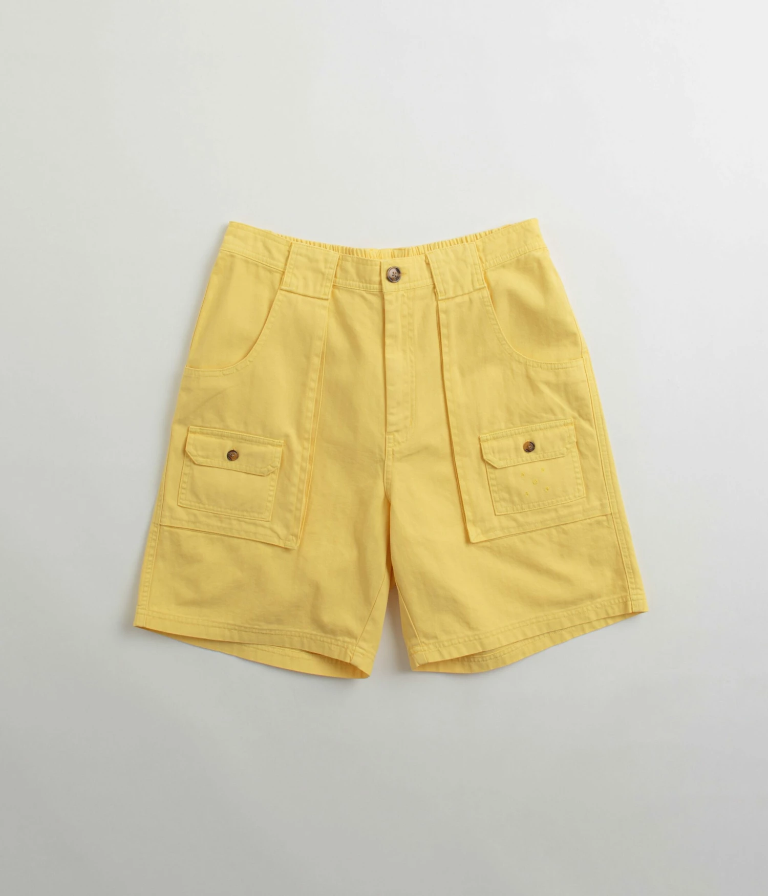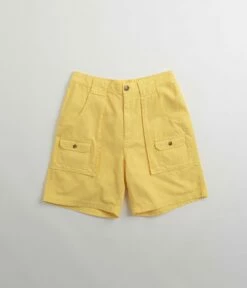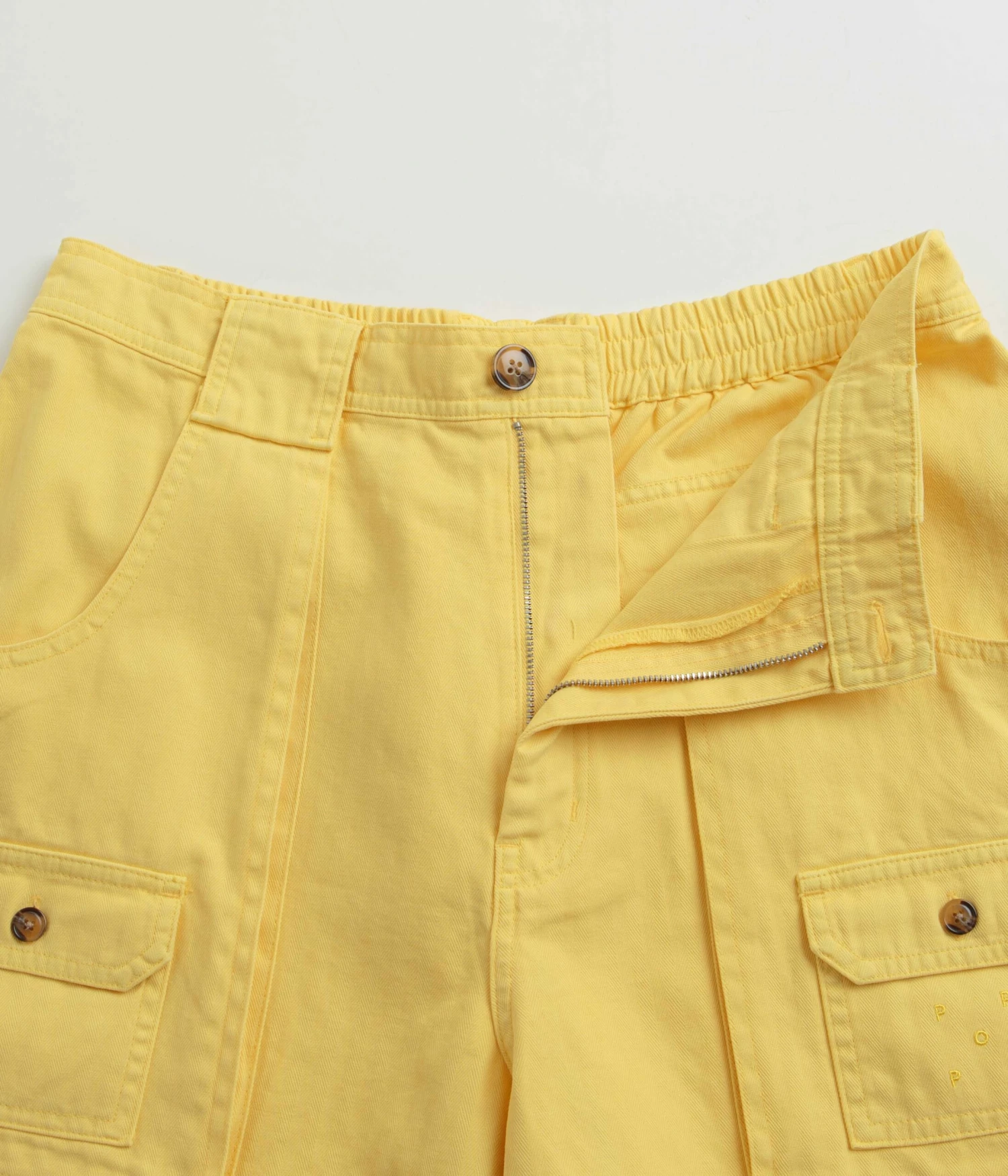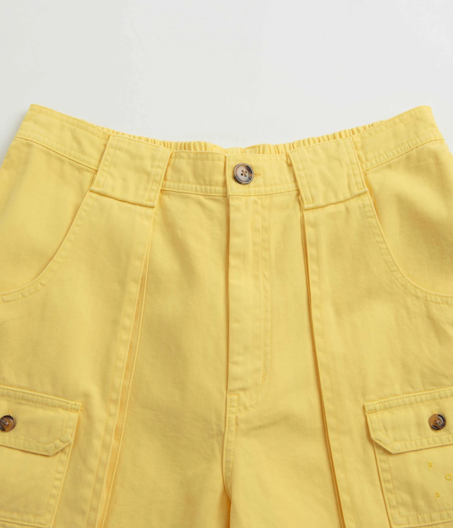 Pop Trading Company Pockets Shorts in Snapdragon. Utility inspired and tailored to a loose fitting from 100% cotton, these Pop Trading Company shorts are designed with an all-over herringbone pattern. Featuring a YKK zipper fly, an elasticated rear waistband and mother of pearl buttons, these yellow Pop Trading Company shorts are finished with two side pockets, two rear pockets, additional cargo pockets and with embroidered logo branding.