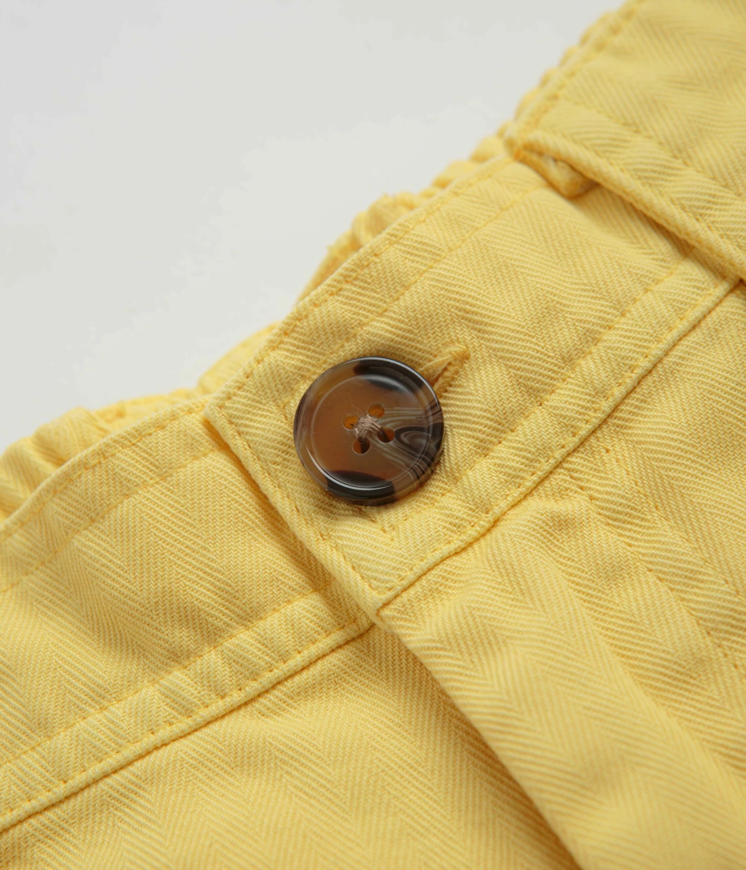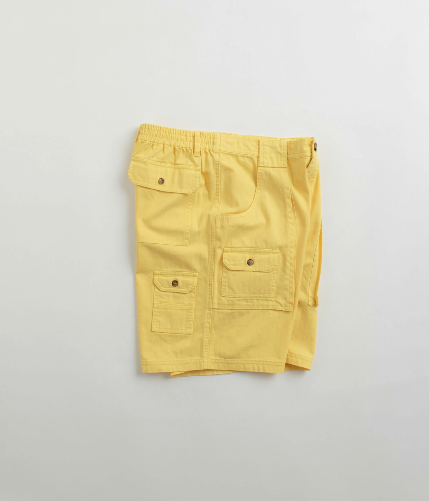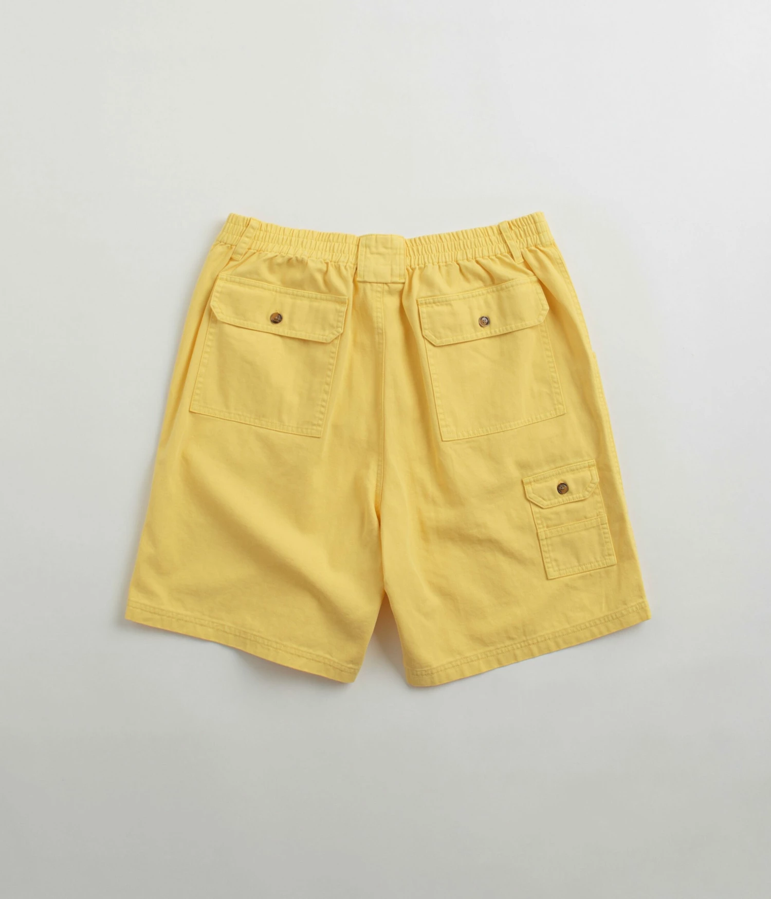 Pop Trading Company Pockets Shorts in Snapdragon. Utility inspired and tailored to a loose fitting from 100% cotton, these Pop Trading Company shorts are designed with an all-over herringbone pattern. Featuring a YKK zipper fly, an elasticated rear waistband and mother of pearl buttons, these yellow Pop Trading Company shorts are finished with two side pockets, two rear pockets, additional cargo pockets and with embroidered logo branding.