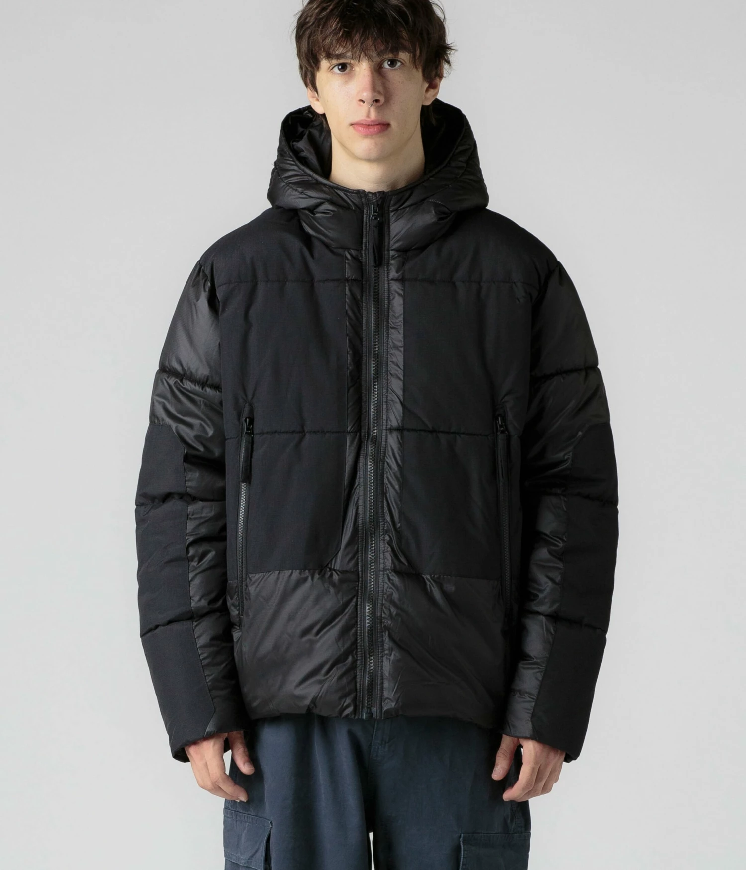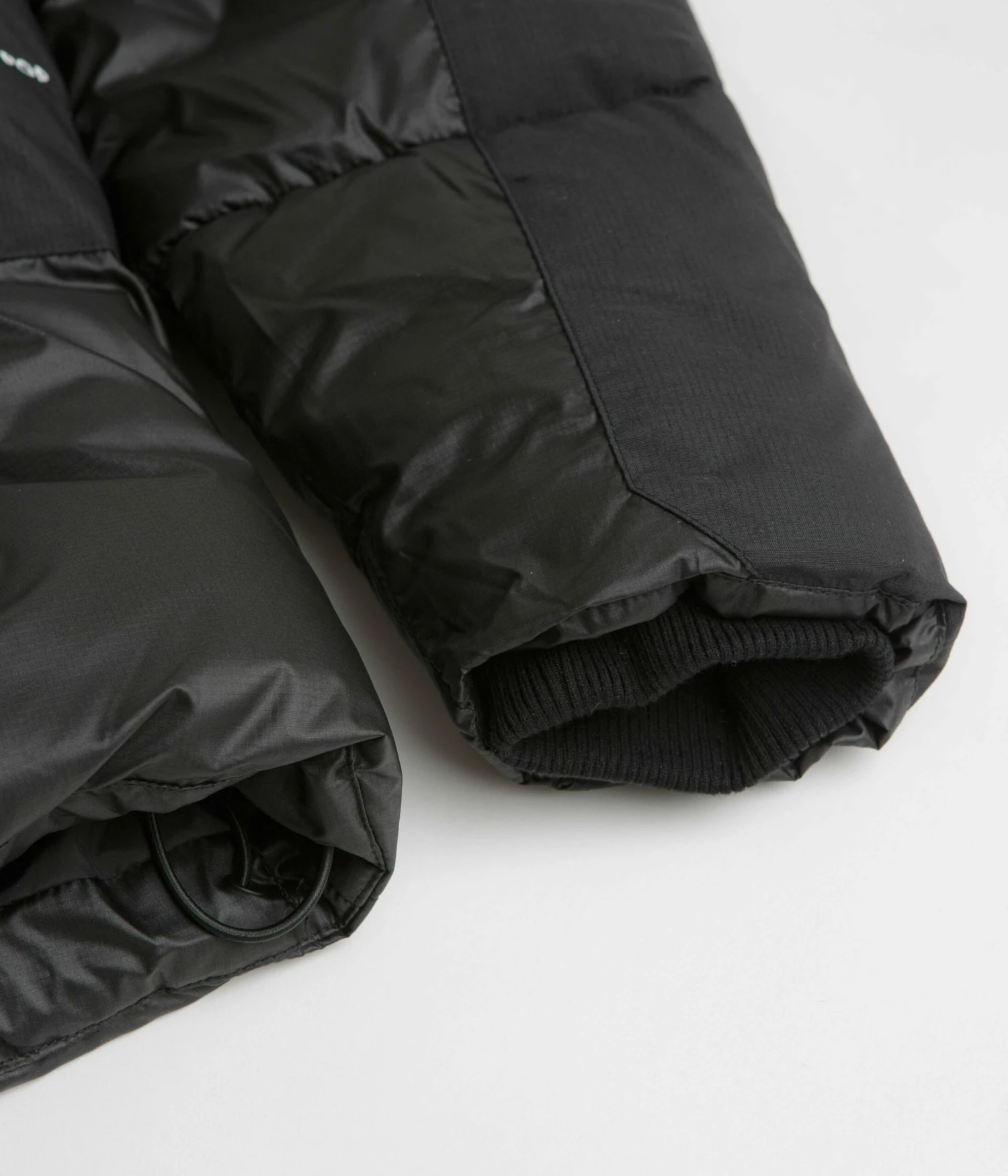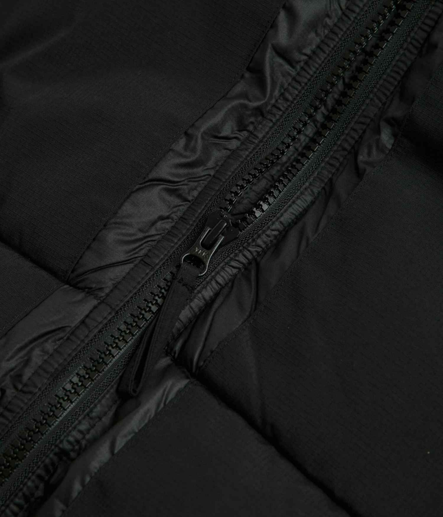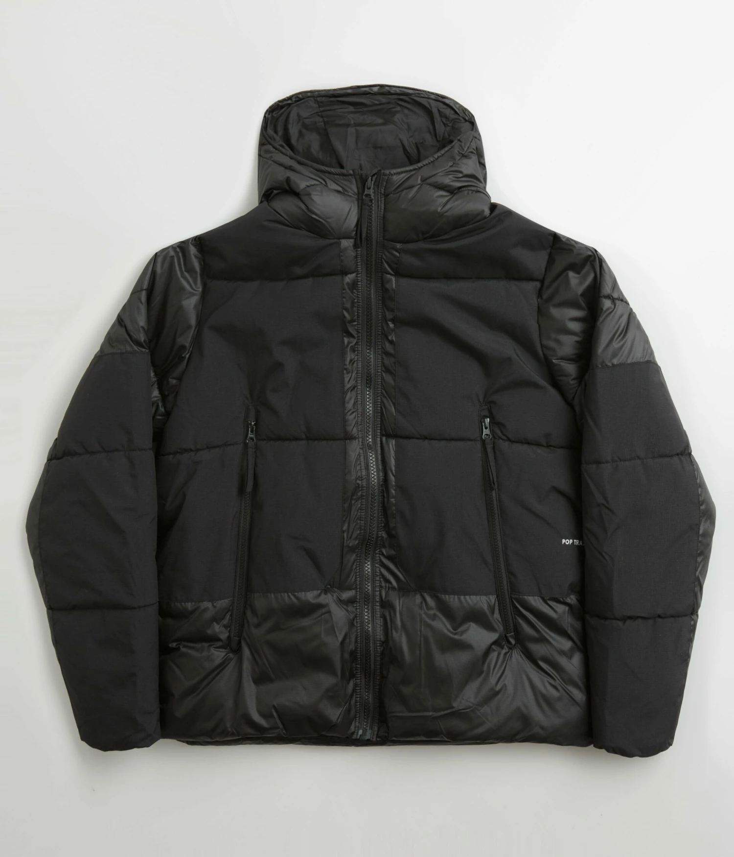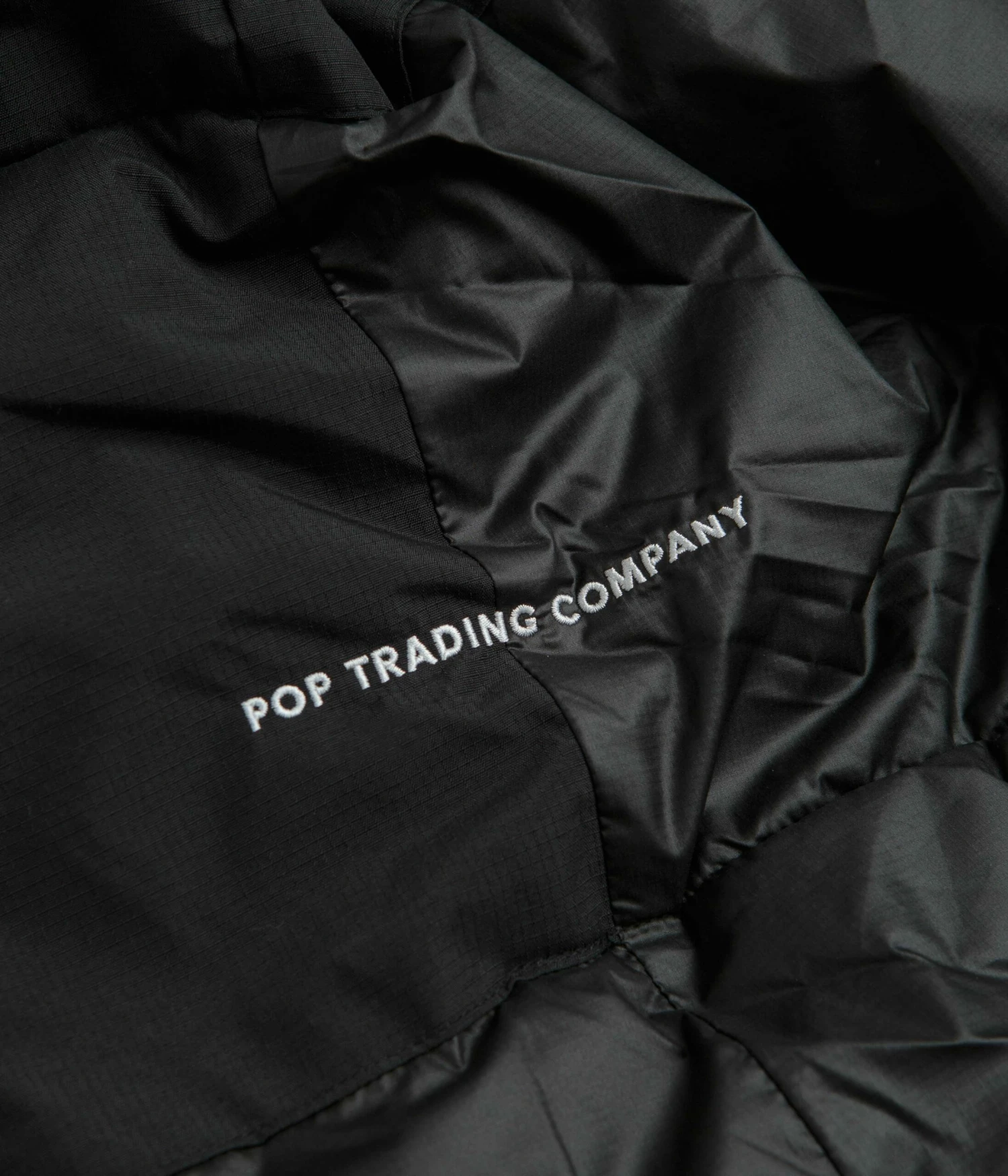 Pop Trading Company Puffer Jacket in Black. Made from 100% nylon ripstop with a Dupont Sorona biodegradable down filling, this Pop Trading Company jacket is tailored to a regular fitting with a full length YKK zipper. Featuring a high-rise collar, an adjustable hood, an adjustable hem and elasticated cuffs, this black Pop Trading Company puffer jacket is finished with two zippered front pockets and embroidered logo branding.