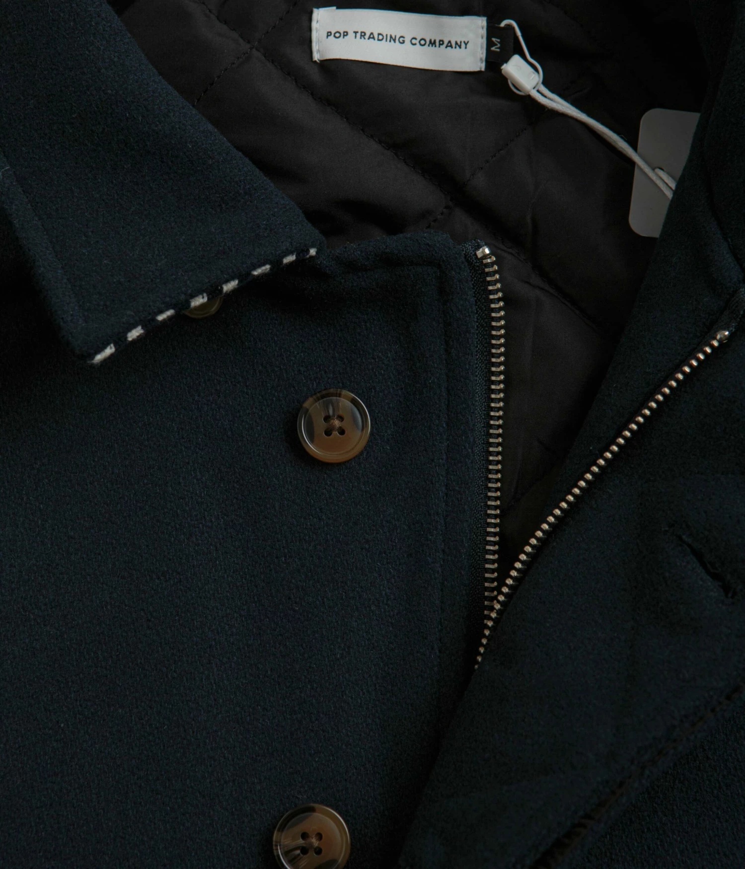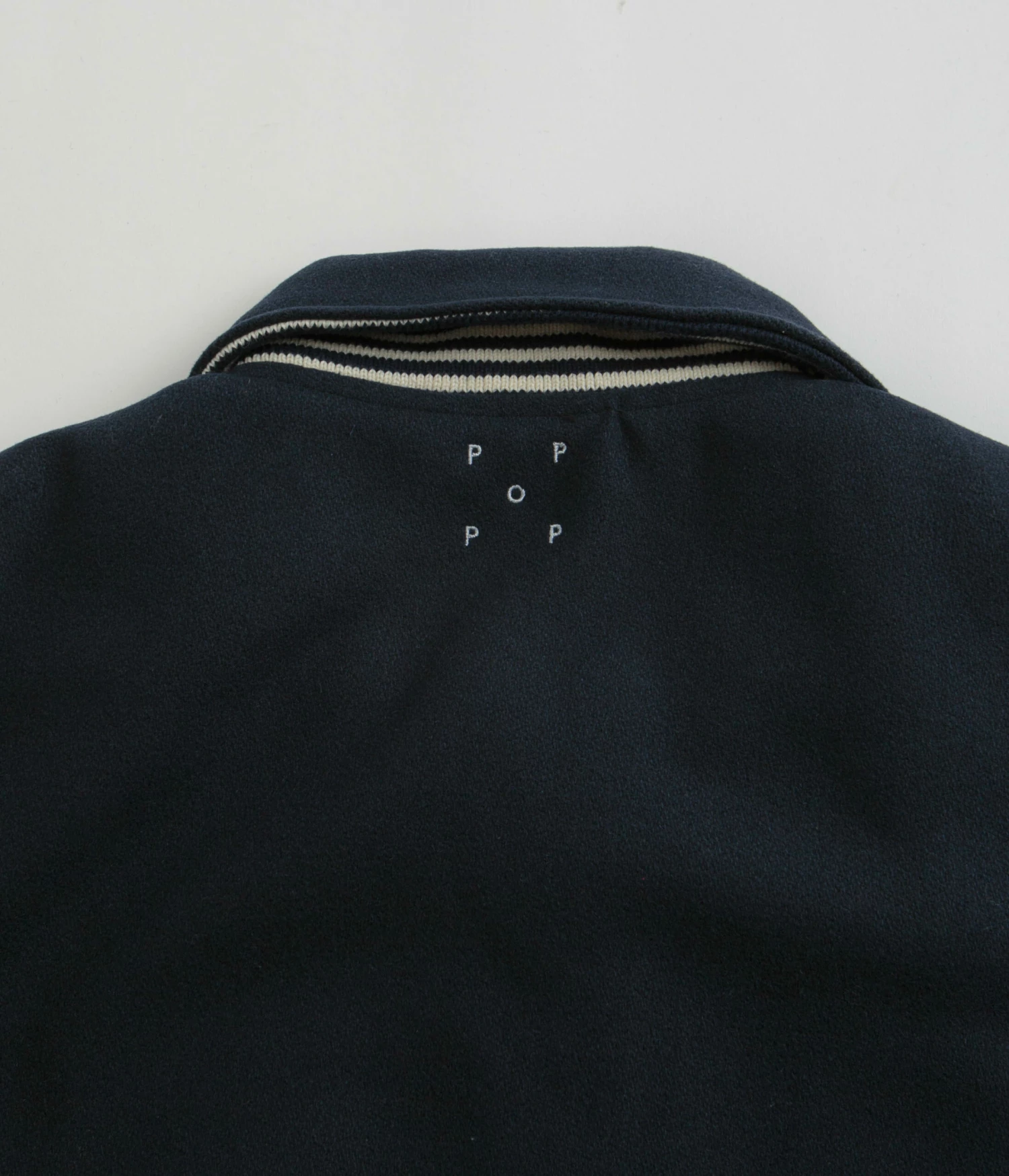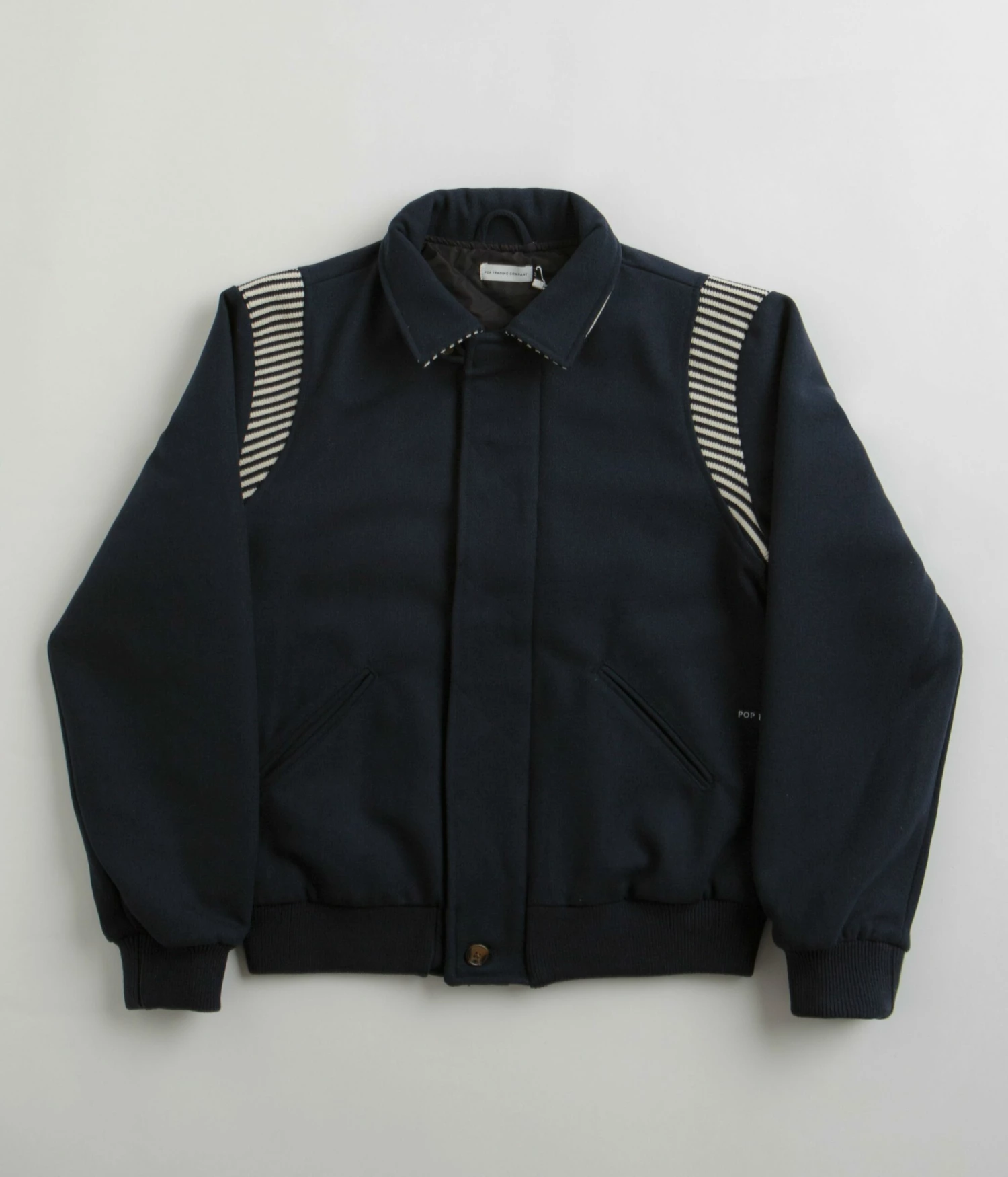 Pop Trading Company Varsity Jacket in Navy. Collegiate inspired and tailored to a regular fitting from a heavyweight wool blend, this Pop Trading Company jacket is designed with a 3M Thinsulate quilted lining and a classic stand collar. Featuring a full length zipper fastening with a concealing button-secured placket, this navy Pop Trading Company jacket is finished with ribbed cuffs, a woven elastic hem, two front pockets, striped shoulder panels and with embroidered logos.