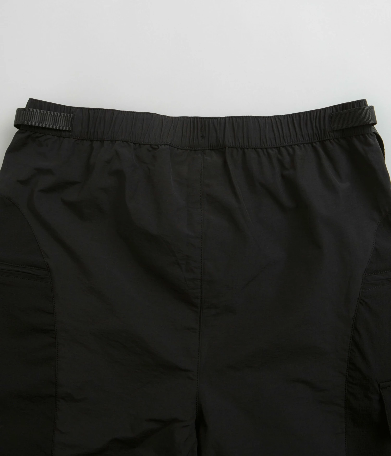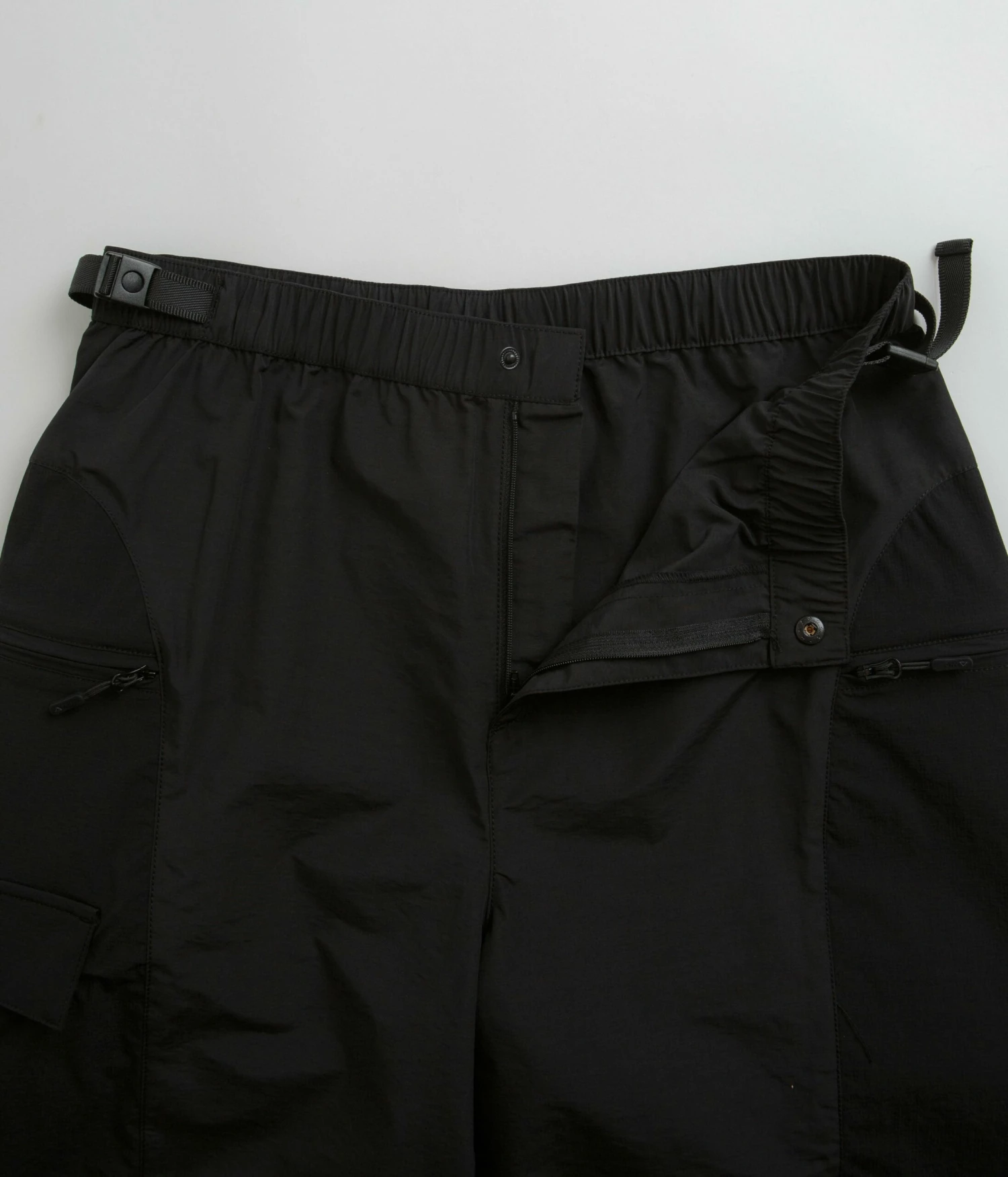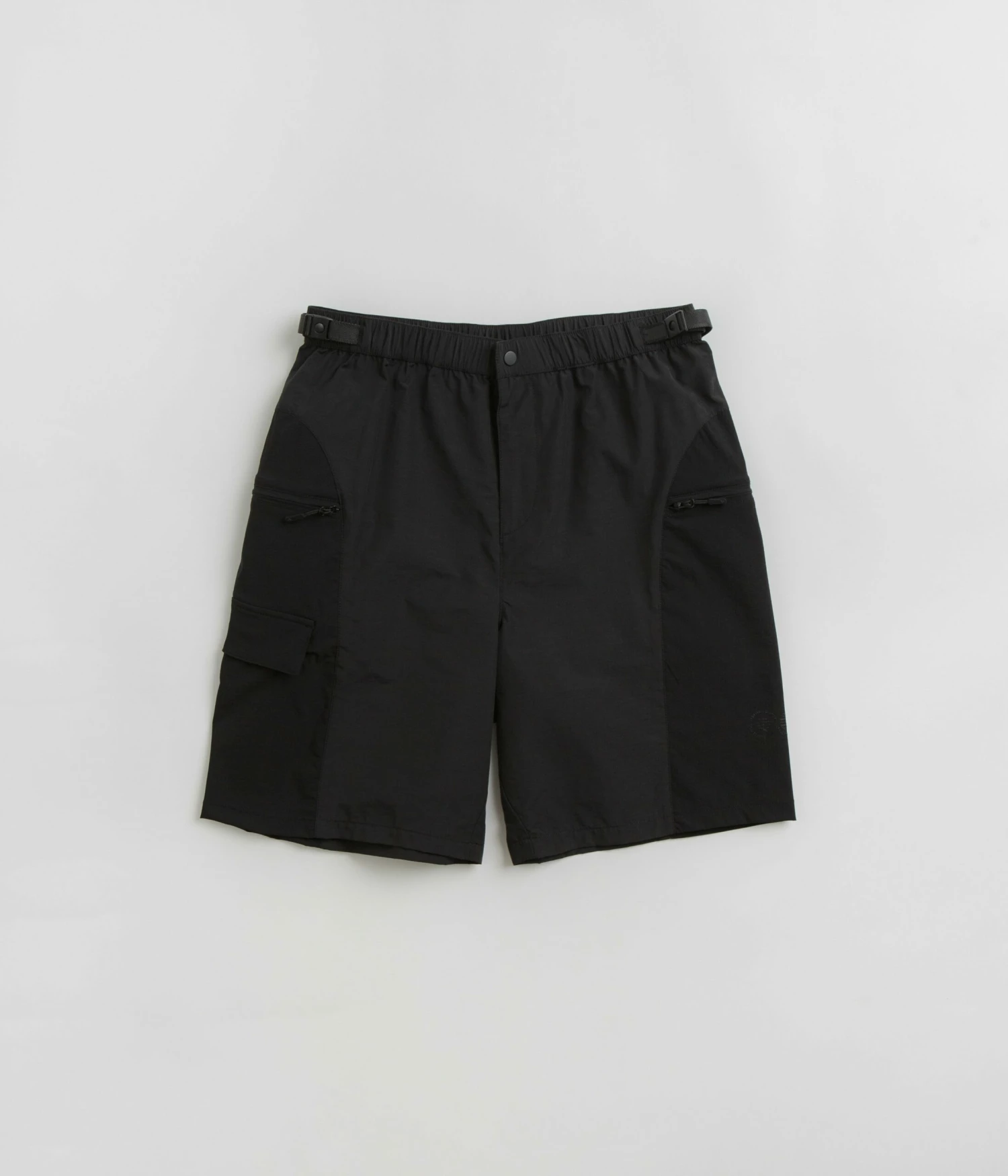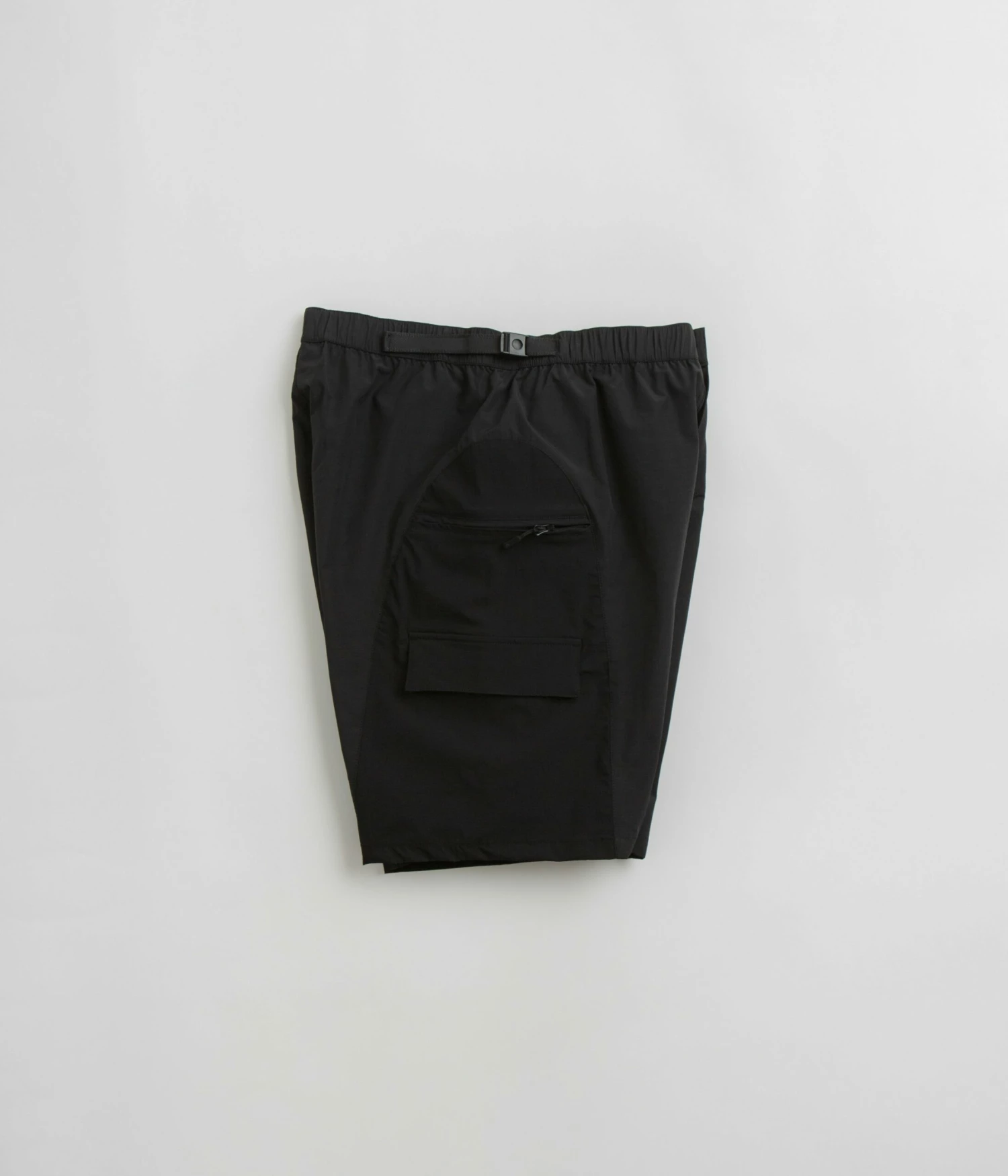 Purple Mountain Observatory Expedition Shorts in Black. Utility inspired and tailored to a regular fitting, these Purple Mountain Observatory shorts are made from a water-repellent nylon elastane blend. Featuring an adjustable waist, a single button secured zipper fly and two zippered side pockets, these black Purple Mountain Observatory shorts are finished with an additional utility pocket and printed logo branding.