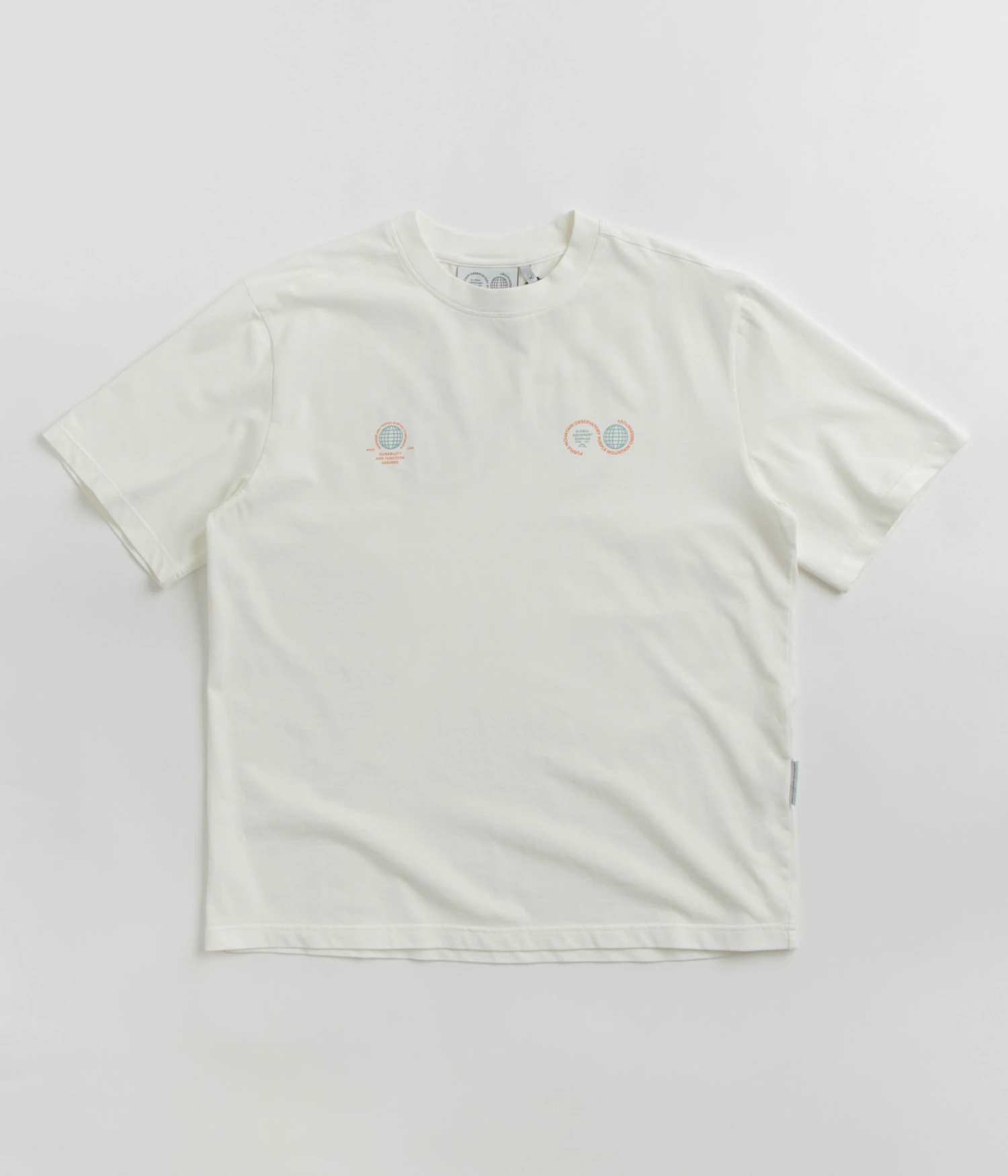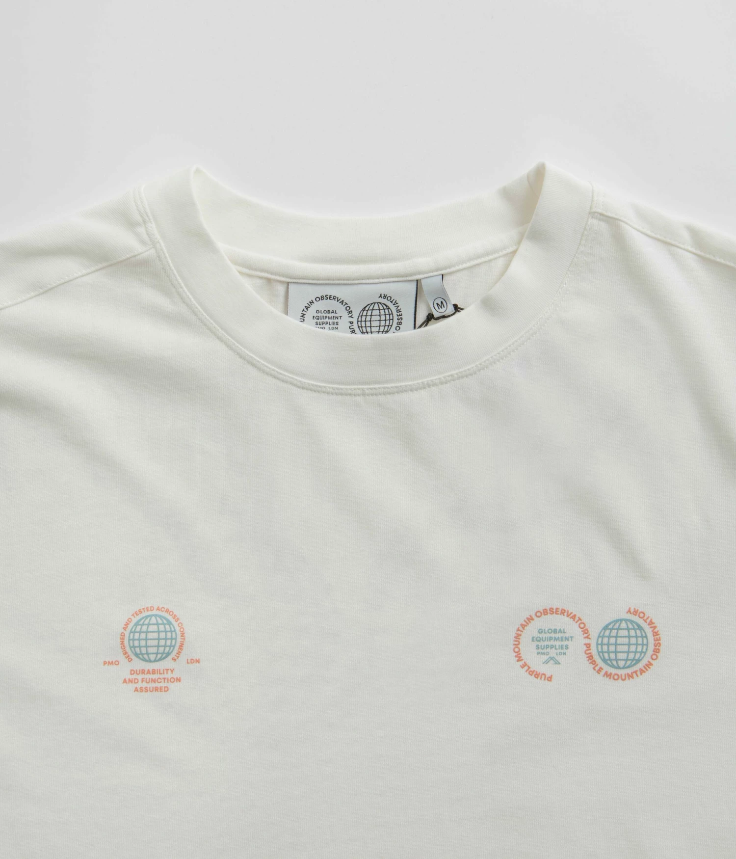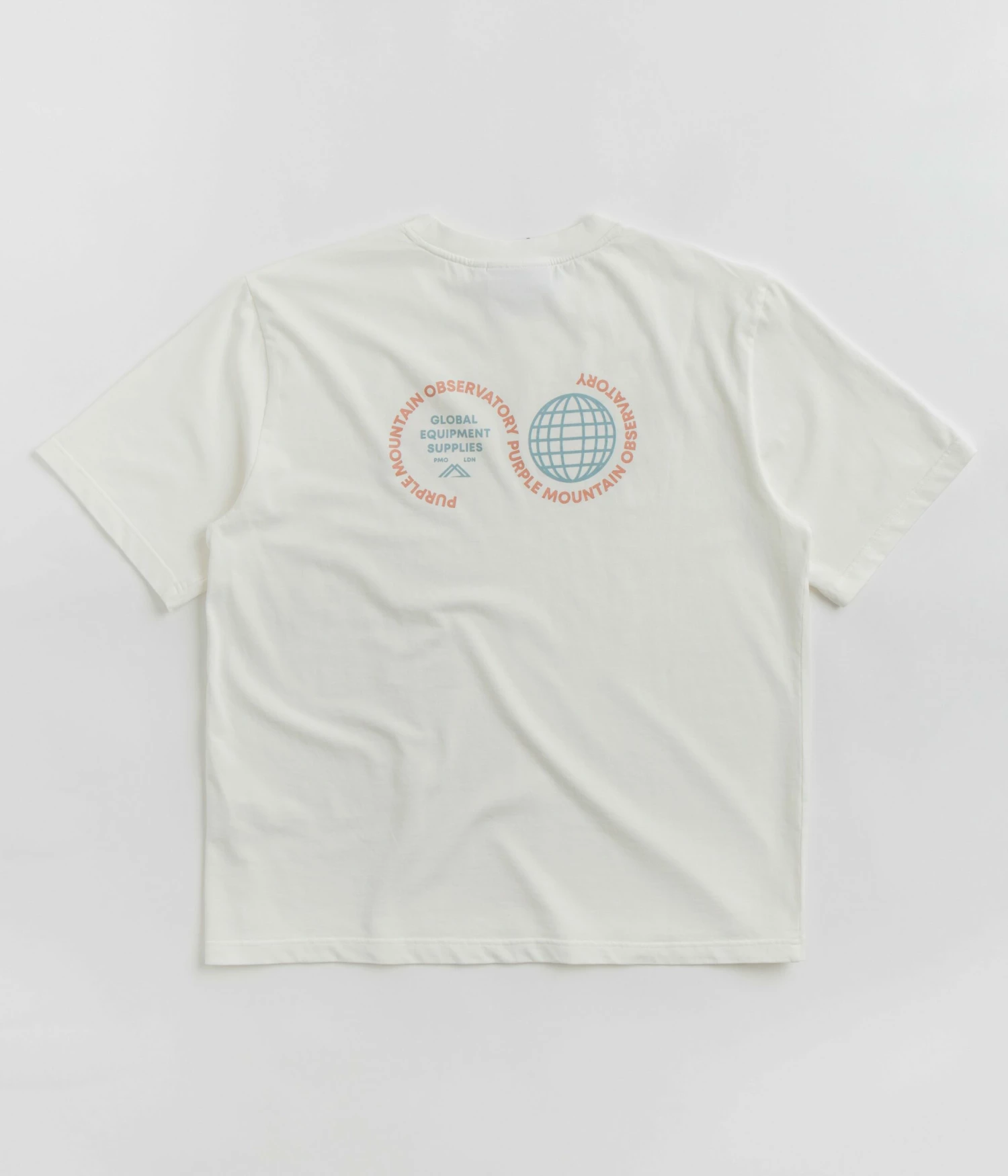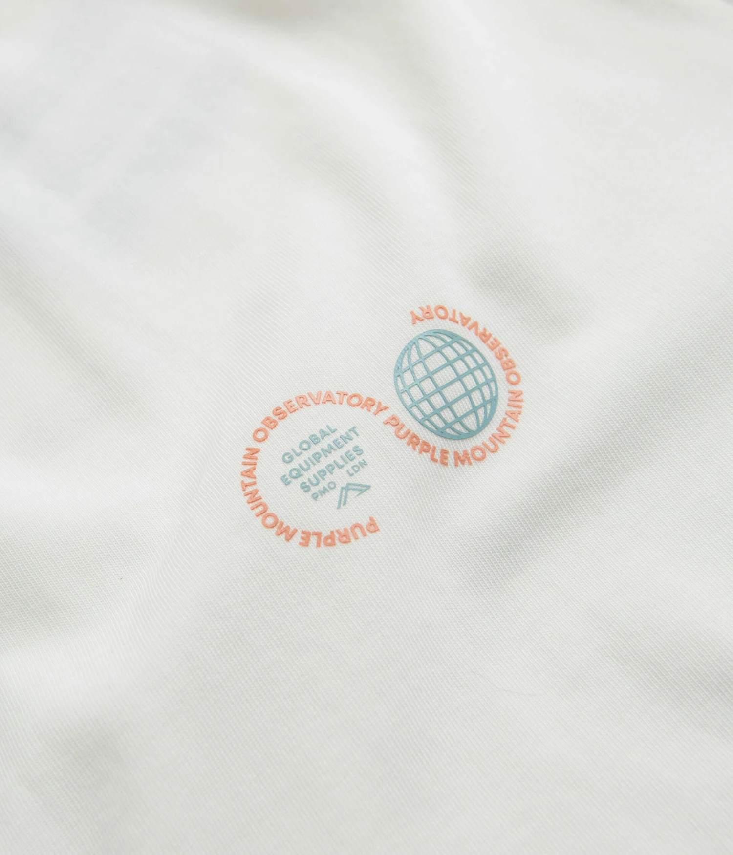 Purple Mountain Observatory Globe T-Shirt in White. Tailored to a loose fitting from 100% cotton, this midweight Purple Mountain Observatory t-shirt is designed with a rib knit collar and dropped shoulders. Finished in a shade of white with a reinforced hem and printed graphics displayed across both the chest and rear.