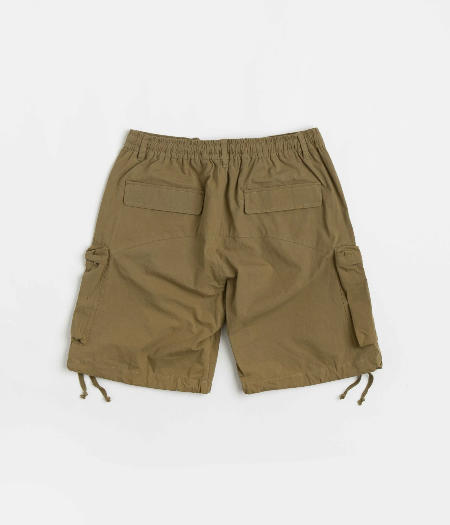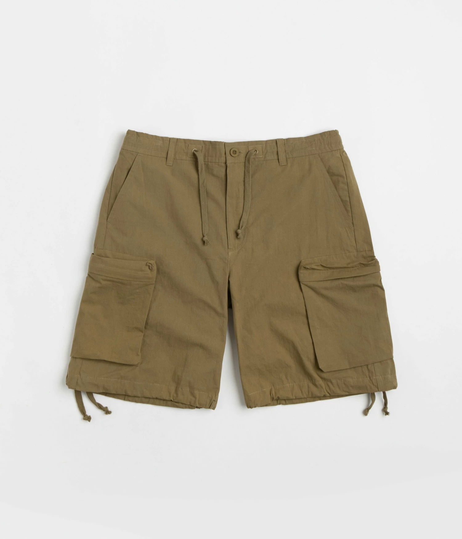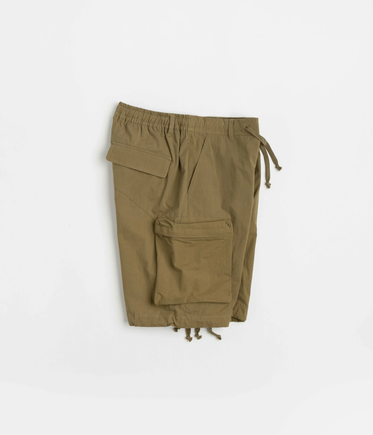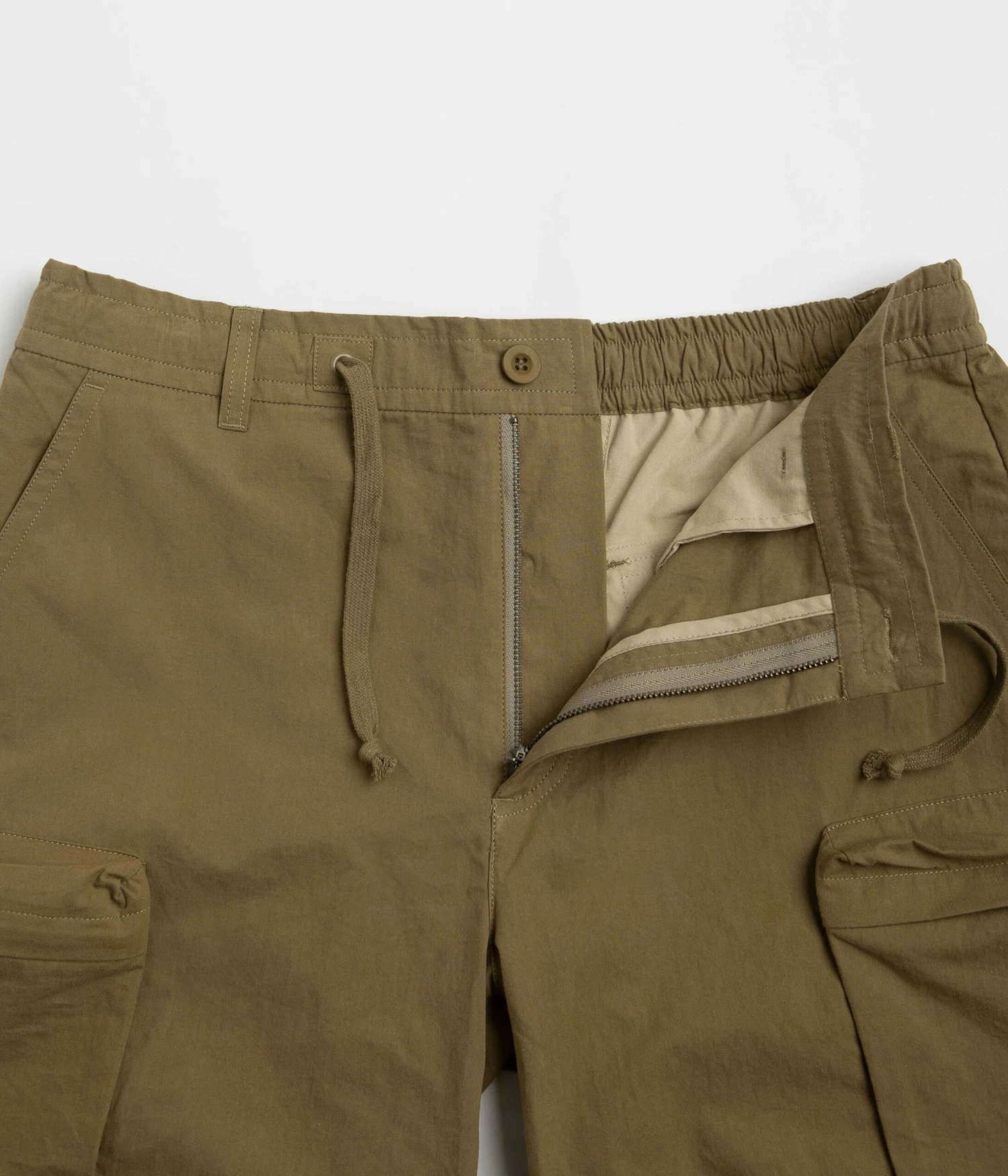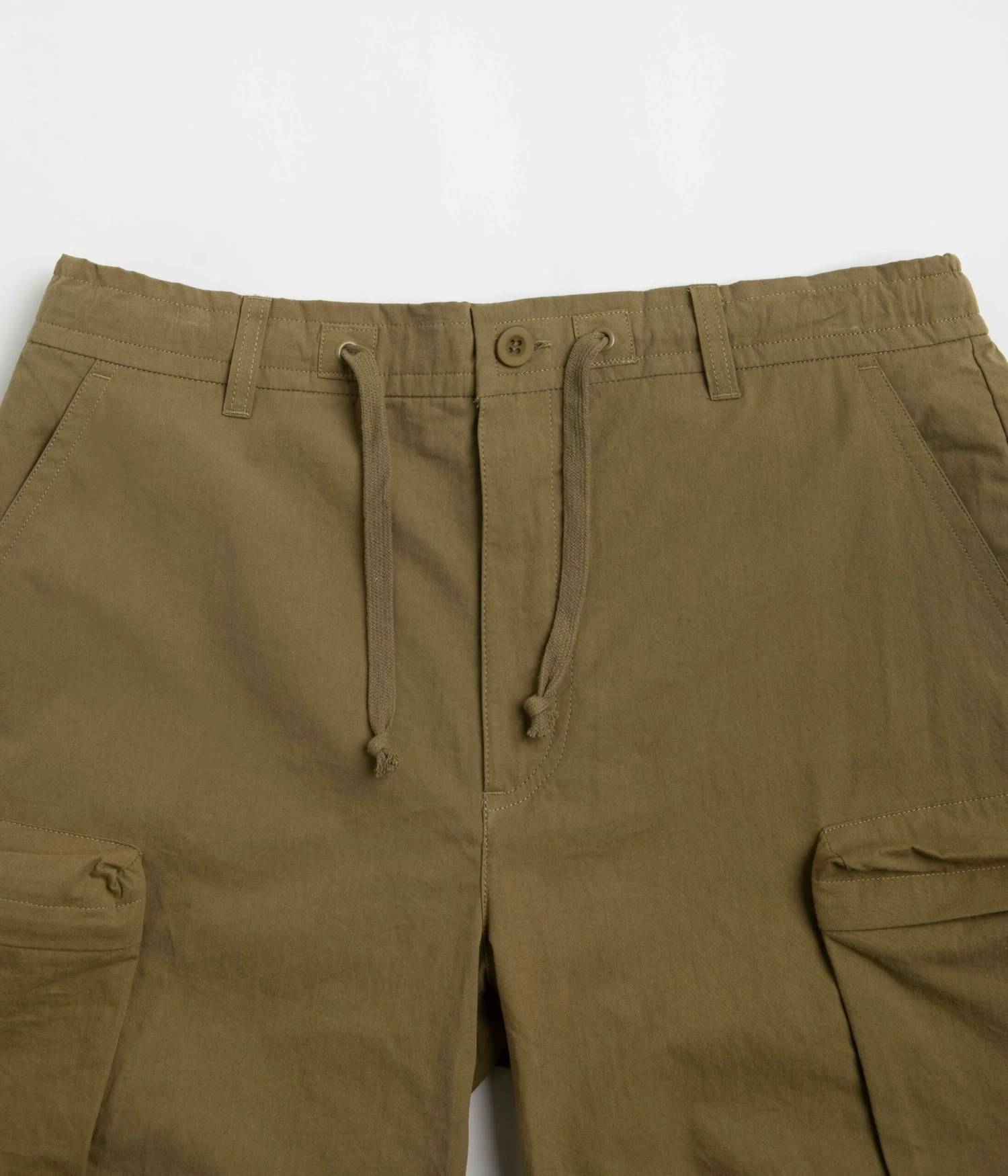 Satta Cargo Shorts in Olive. Cut to knee length from 100% cotton poplin cloth, these utility style Satta shorts are tailored to a regular fitting with a wide, straight leg. Featuring a woven elastic waist with integrated belt loops and a drawstring fastening, these olive khaki Satta cargo shorts are finished with four classic pockets, two additional cargo pockets and with adjustable drawcords sewn across each hem.