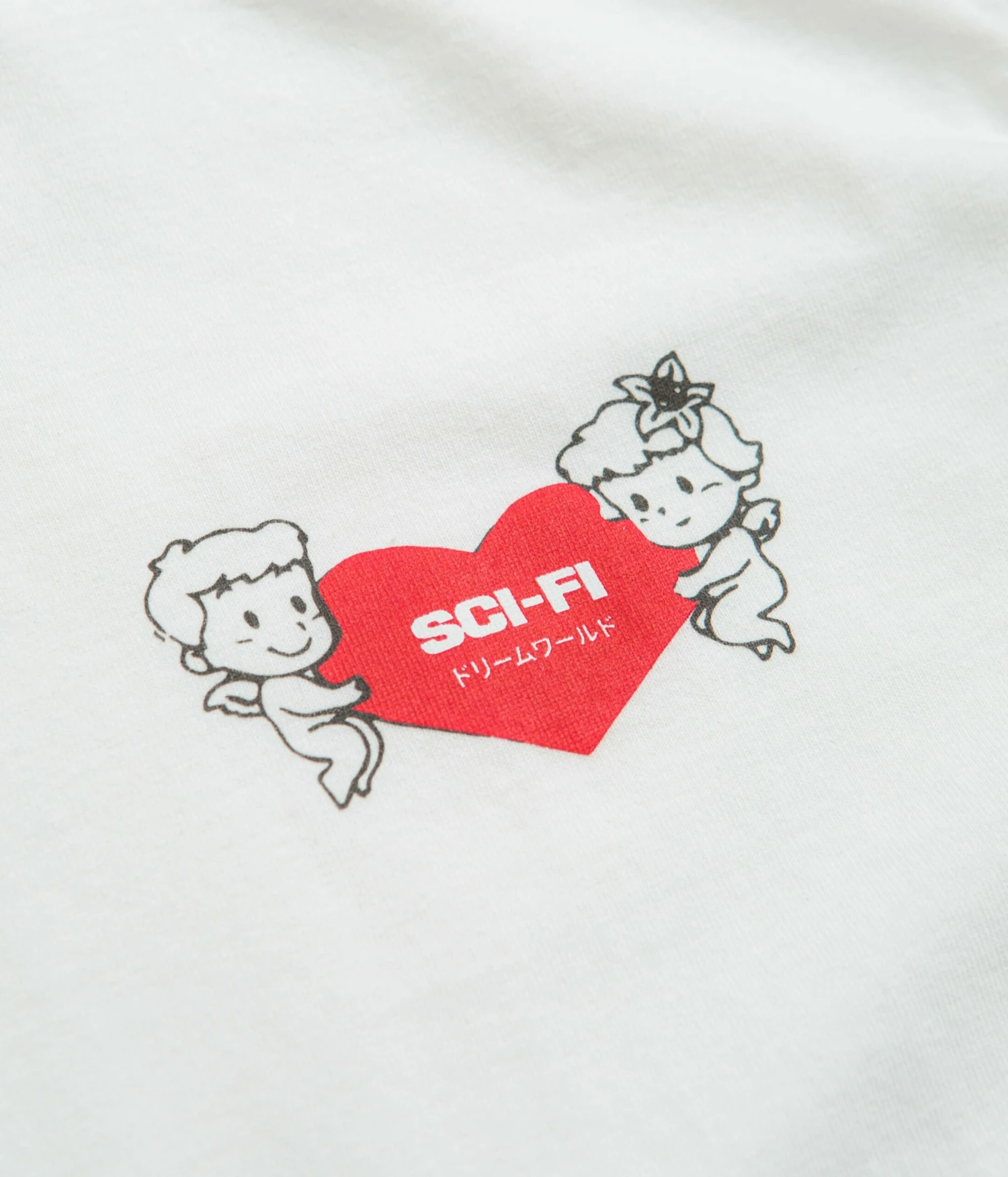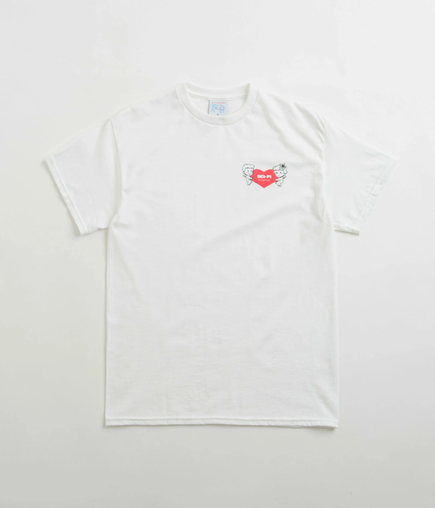 Sci-Fi Fantasy Love T-Shirt in White. Tailored to a regular fitting from 100% cotton, this new season Sci-Fi Fantasy t-shirt is designed with a classic crew collar and a reinforced hem. Finished in a shade of white with a screen printed left chest graphic.