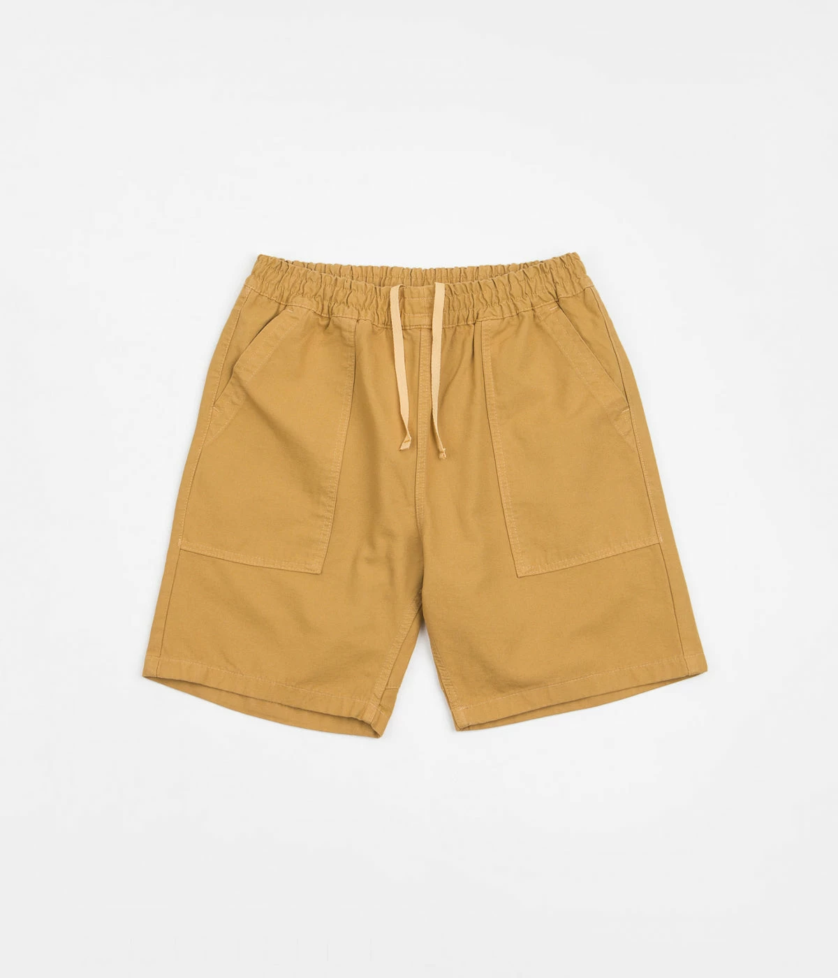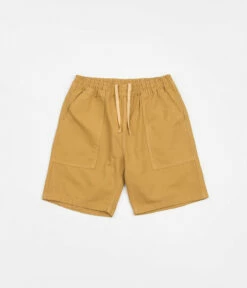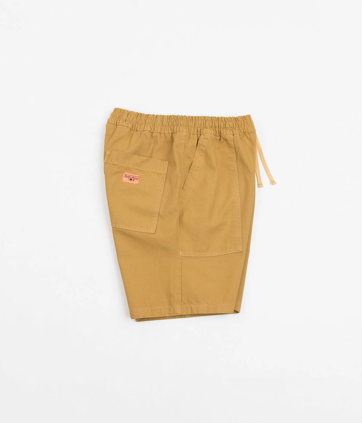 Service Works Classic Chef Shorts in Tan. Tailored to a relaxed fitting from 100% cotton canvas, these knee length Service Works shorts arrive as part of the brand’s latest release. Garment dyed pre-shrunk, these tan brown chef shorts feature a woven elastic waist, an integrated drawcord fastening, a reinforced crotch panel insert and colour matched seams. Finished with two raised fatigue pockets, two patch pockets on the rear and with an embroidered Service Works flag label sewn across the rear.
