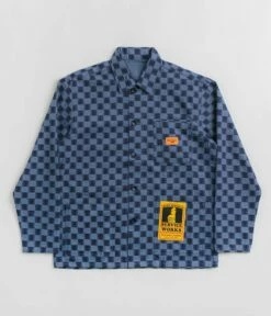 Service Works Coverall Jacket in Blue Checker. Garment dyed and tailored to a relaxed fitting, this Service Works jacket is made from 100% organic cotton canvas. Featuring a five button placket, a stand collar and two waist pockets, this Service Works blue checkered jacket is finished with a single left chest pocket, an inner chest pocket and with woven flag label branding.