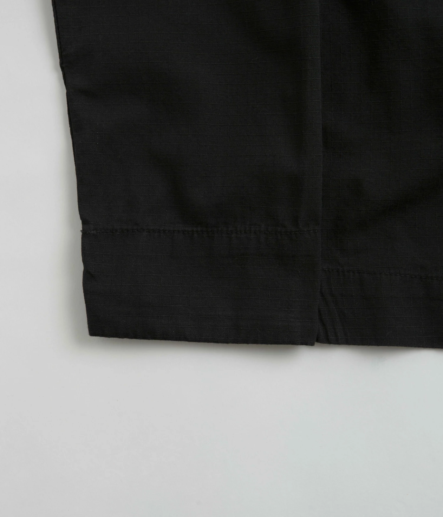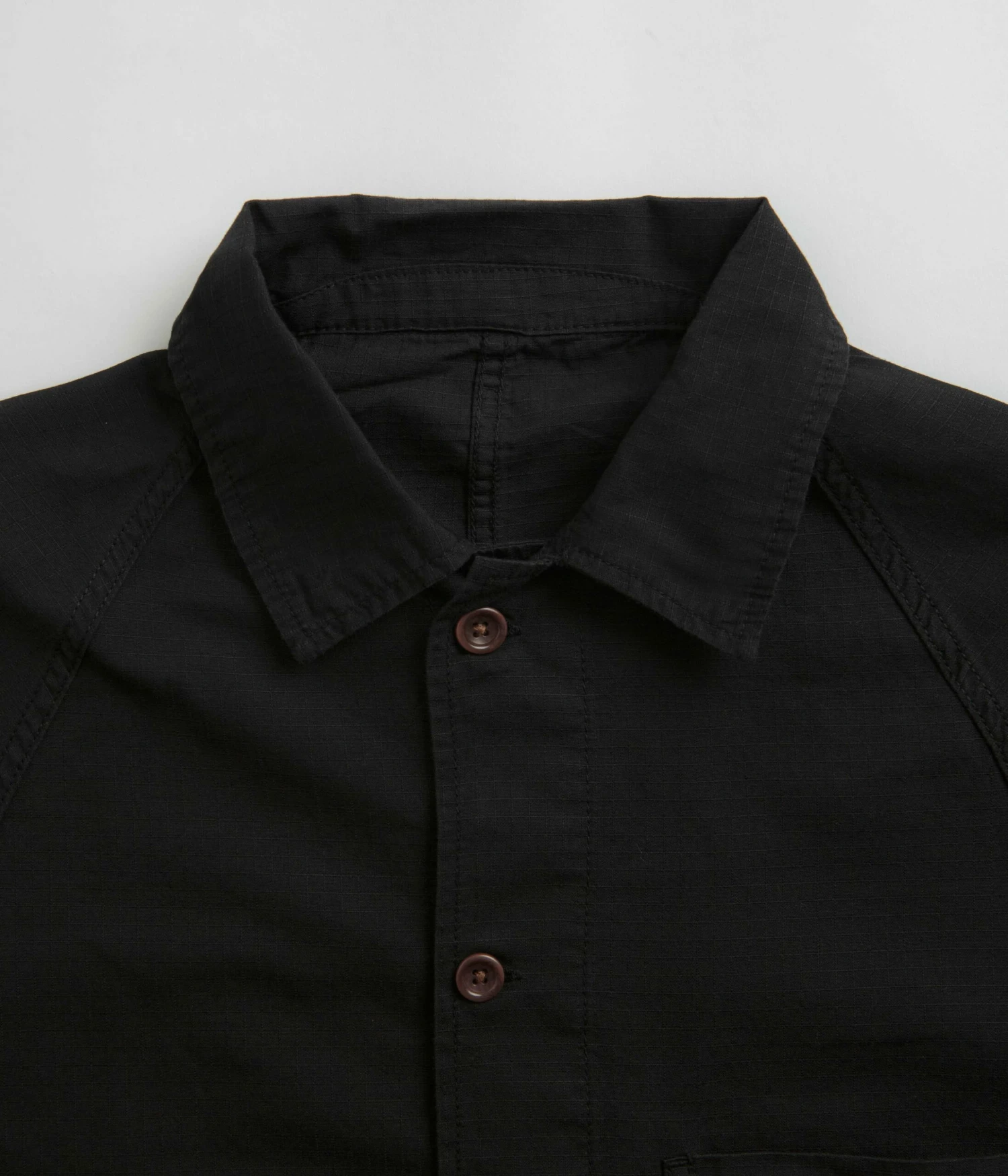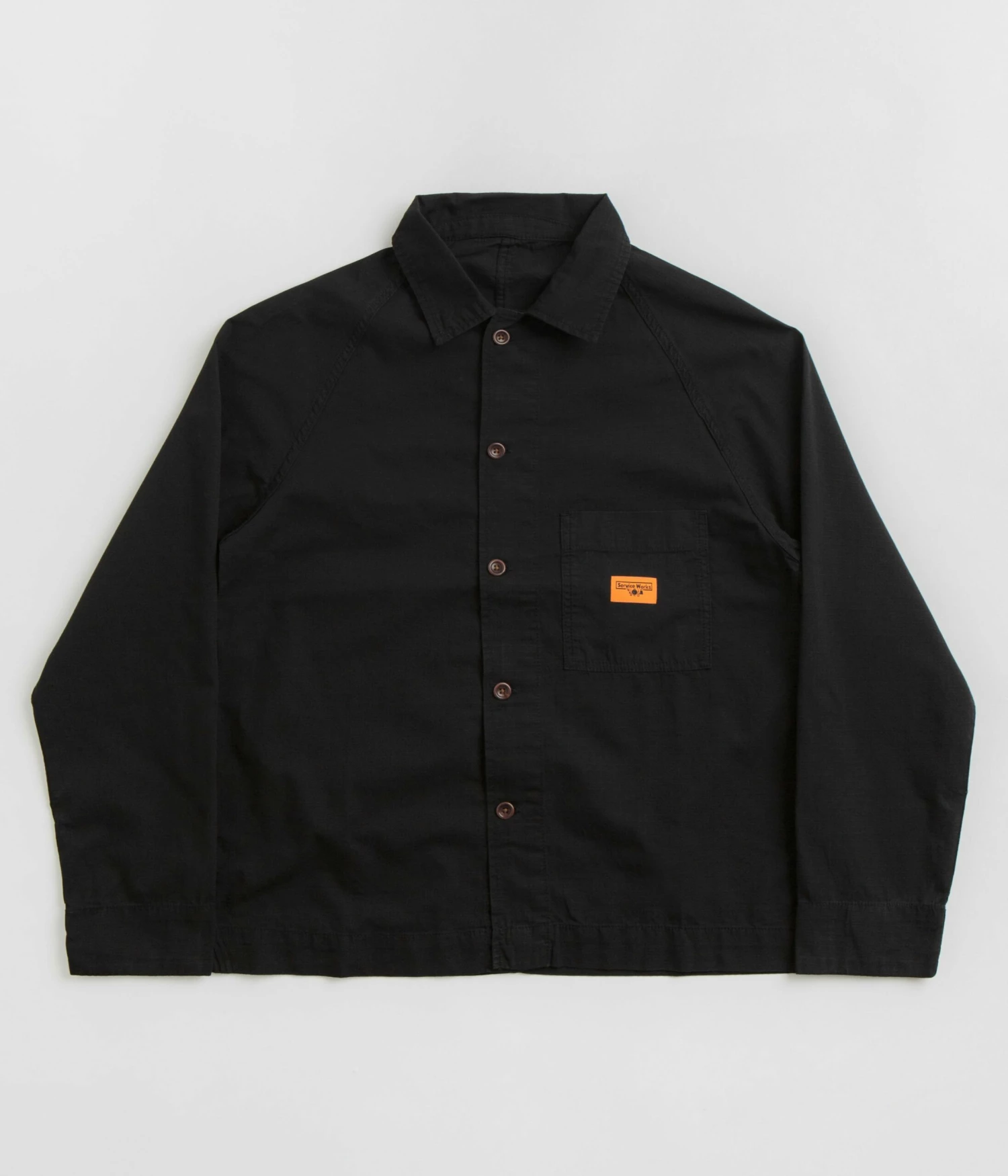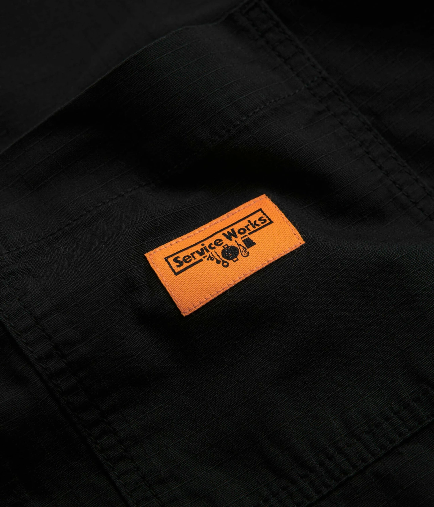 Service Works Ripstop FOH Jacket in Black. Designed with raglan sleeves and a flattened stand collar, this Service Works jacket is made from 100% organic cotton dense twill. Featuring a five button fastening and a side-split hem, this black Service Works jacket is finished with a single left chest pocket.