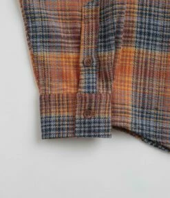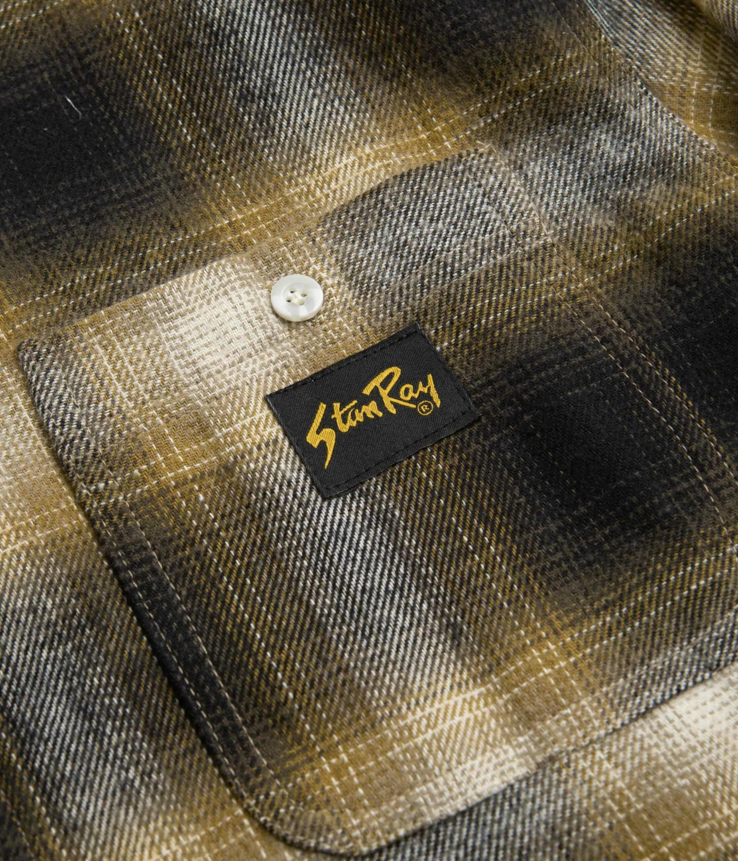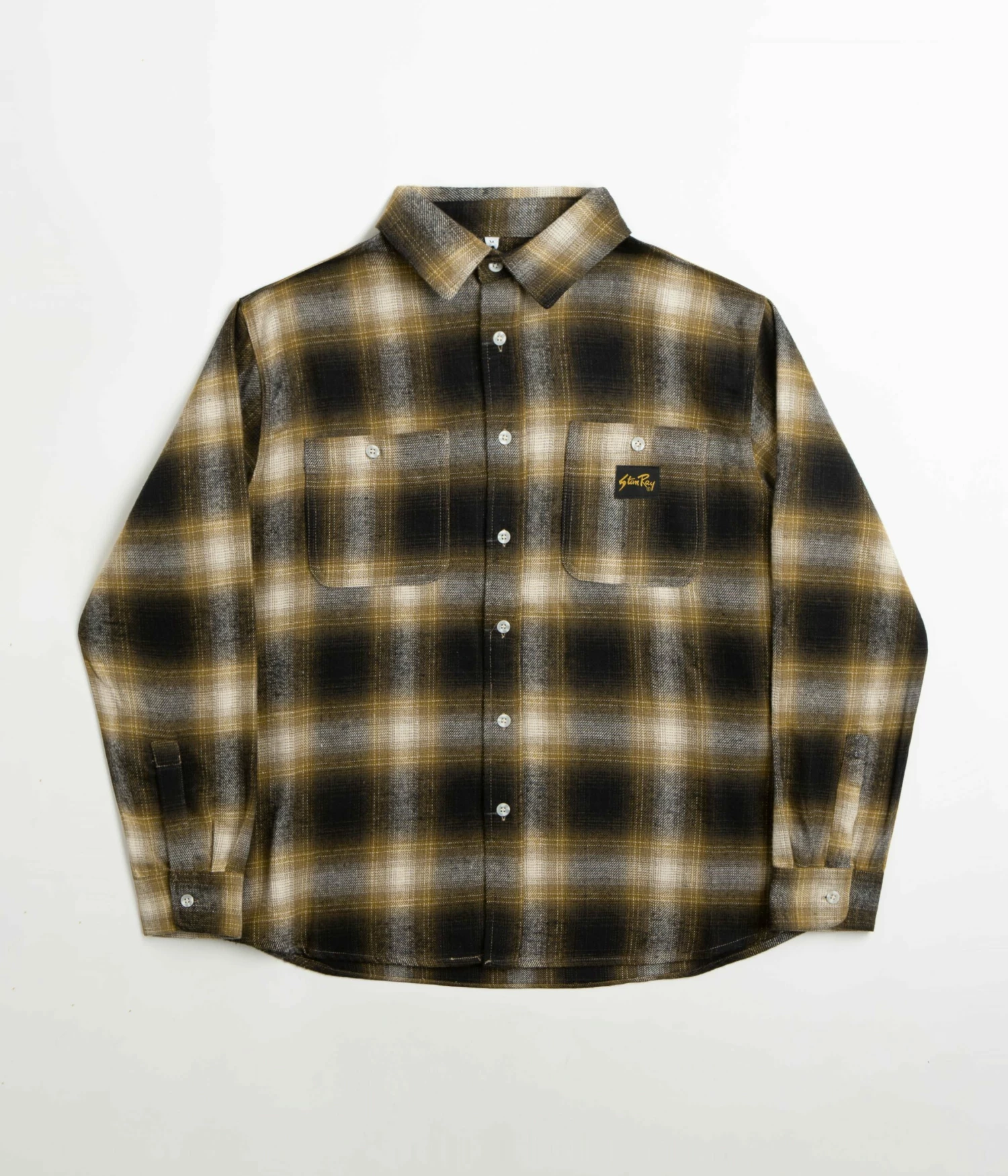 Stan Ray Flannel Shirt in Dusk Plaid. Workwear inspired and made from 100% cotton, this Stan Ray shirt is tailored to a relaxed fitting with a classic stand collar. Featuring a full length button fastening, buttoned cuffs and a curved hem, this black and yellow plaid Stan Ray shirt is finished with two buttoned chest pockets and a woven left chest flag label.
