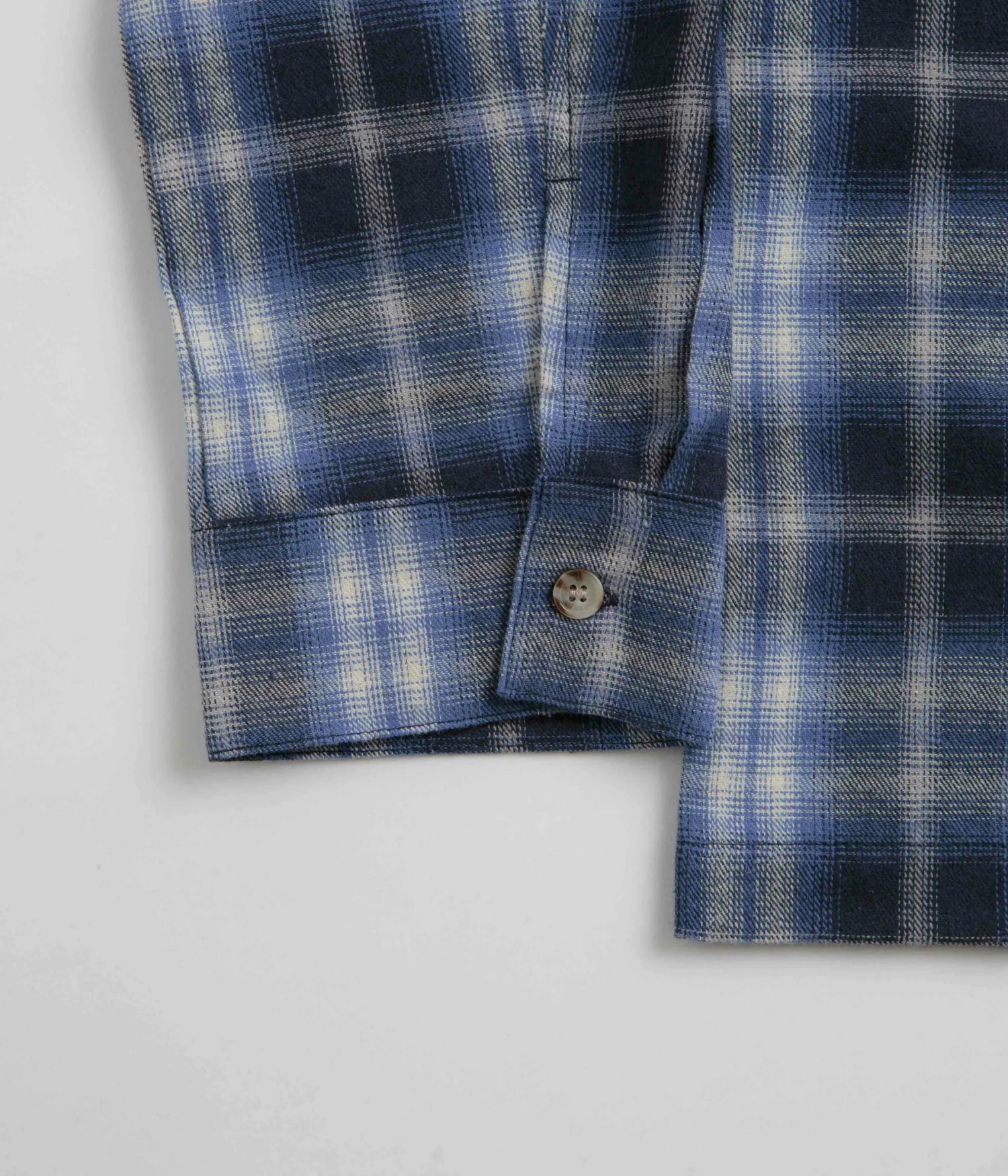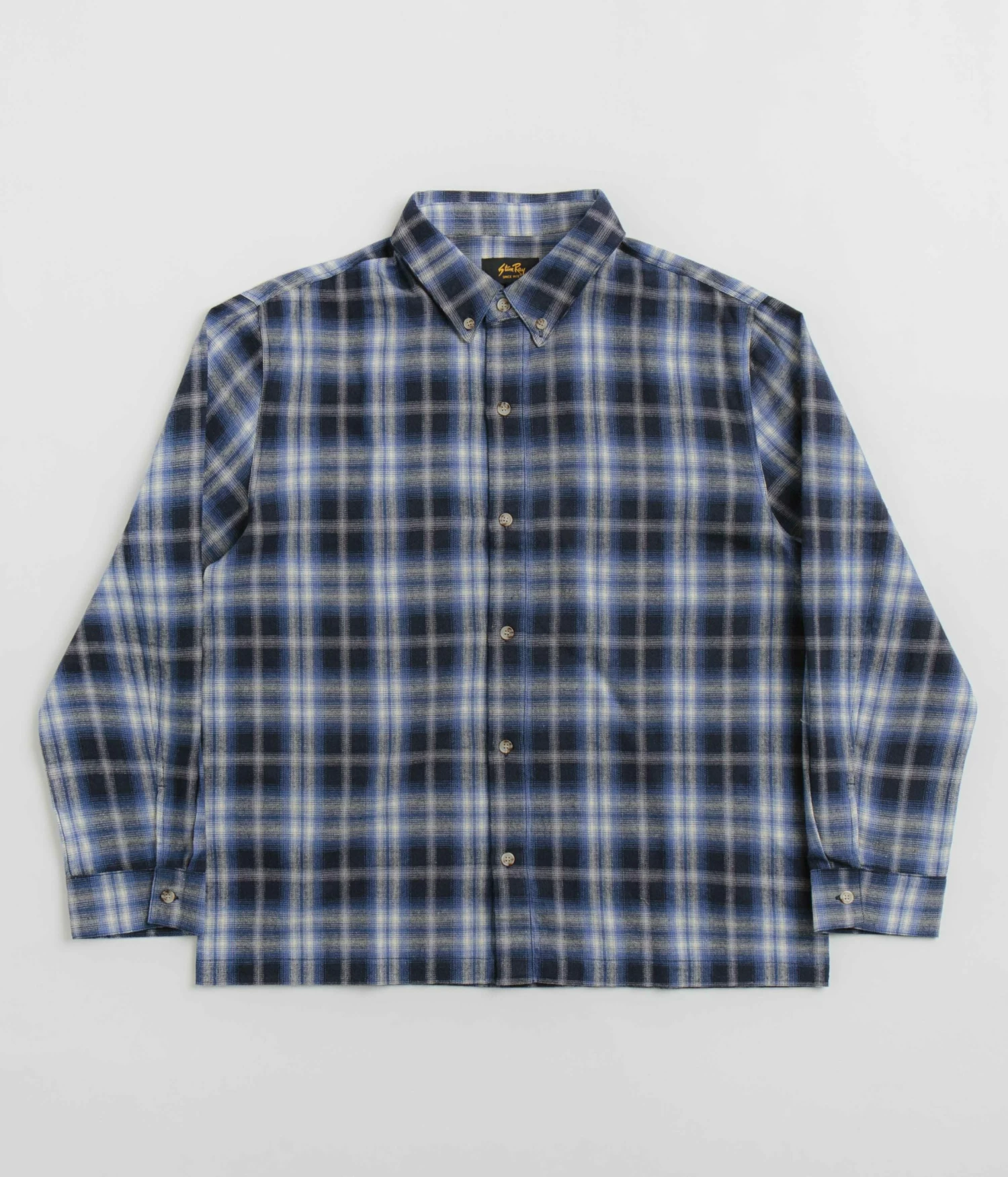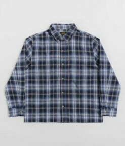 Stan Ray Flannel Shirt in Navy Plaid. Workwear inspired and made from 100% cotton, this regular fitting Stan Ray shirt is designed with a button-down collar and a full length button fastening, this navy plaid Stan Ray shirt is finished with adjustable buttoned cuffs and with embroidered S.R chest detailing.