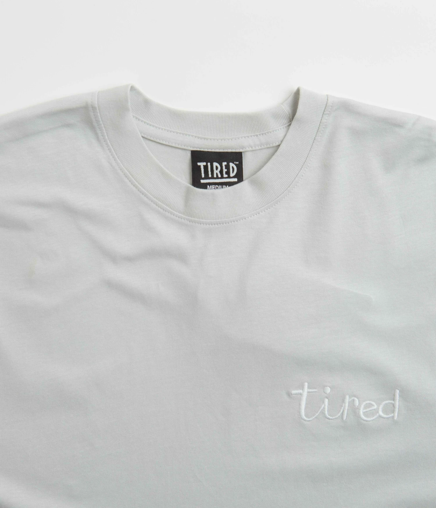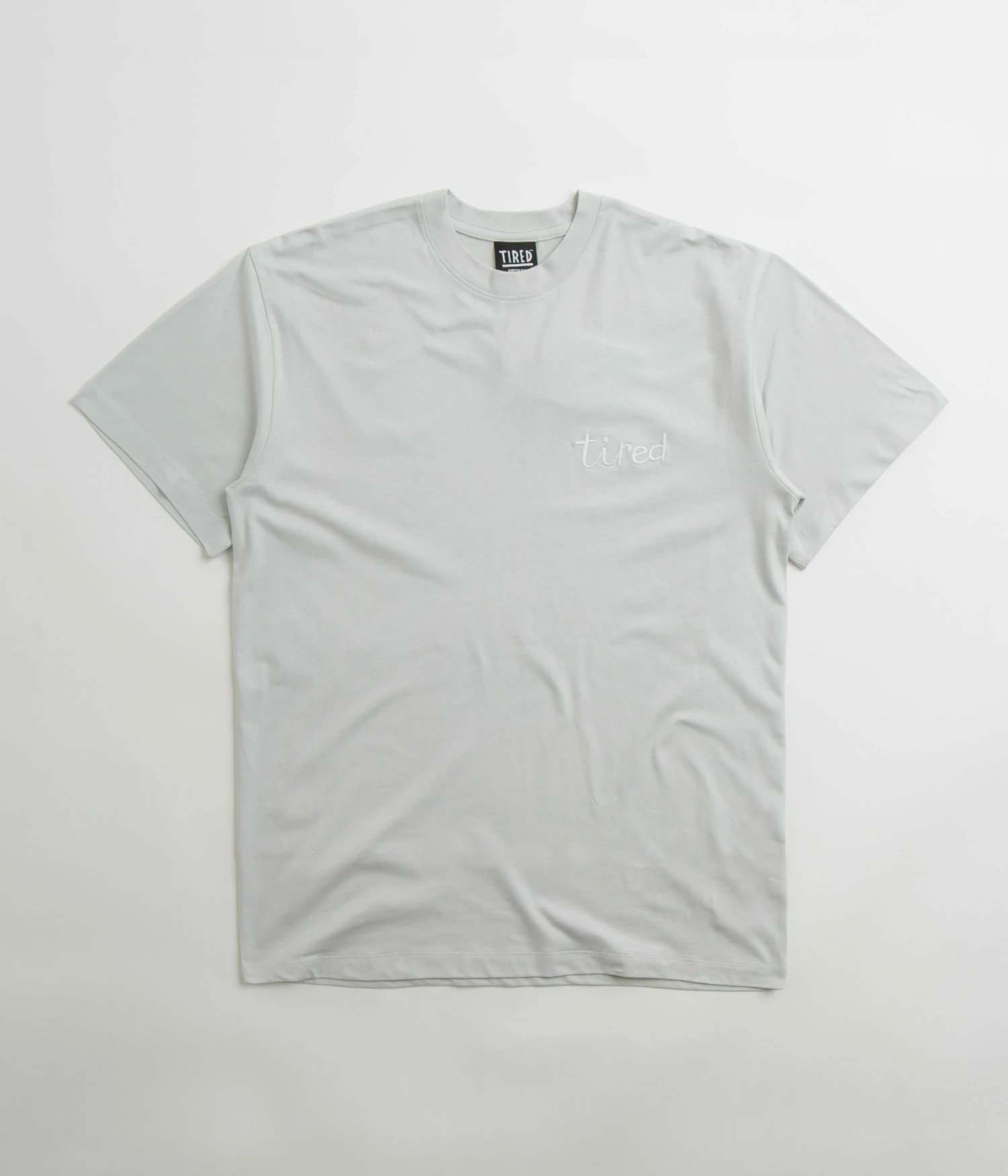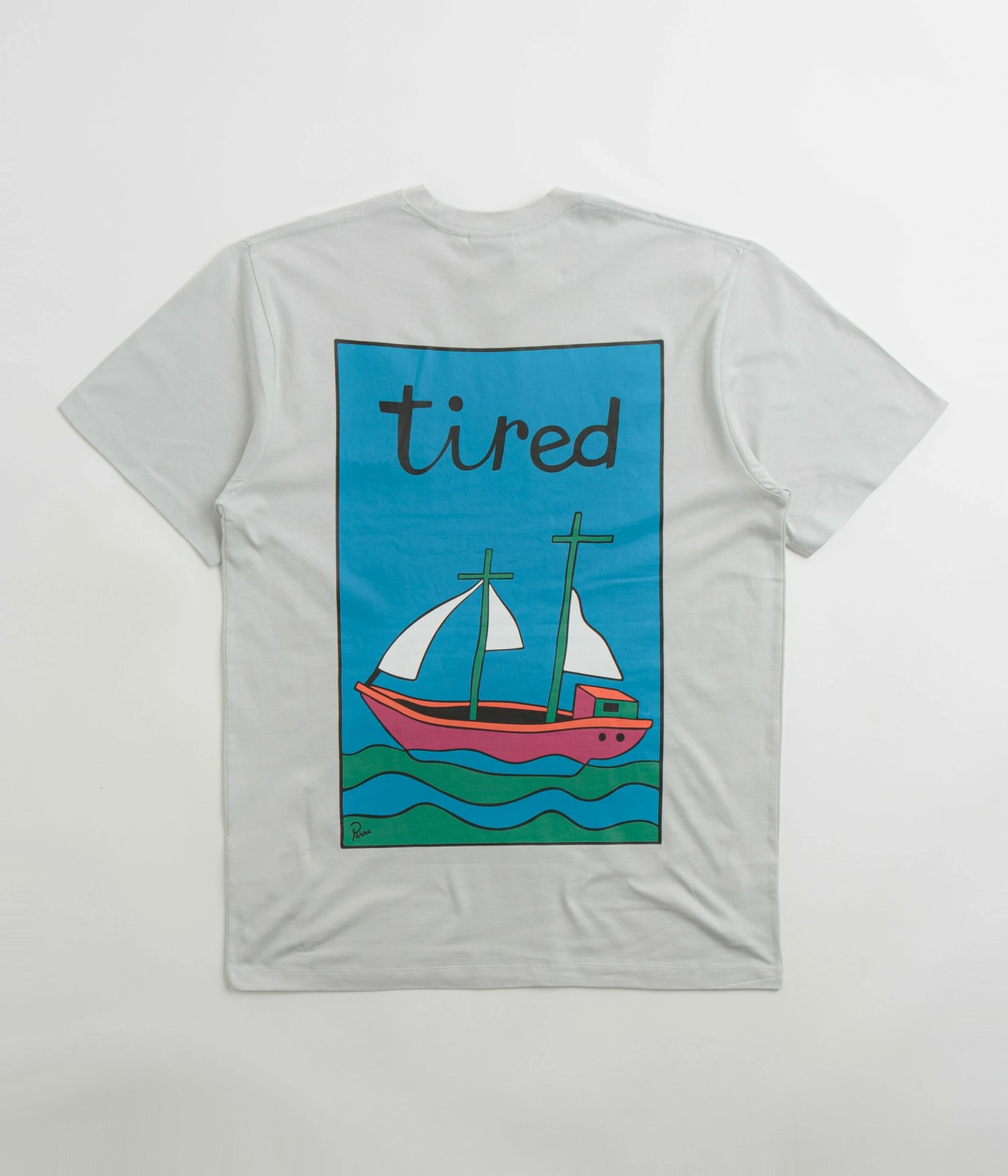 Tired The Ship Has Sailed T-Shirt in Stone. Part of the brand’s latest release, this regular fitting Tired t-shirt is made from 100% cotton. Featuring a rib knit crew collar, a reinforced hem and tonal stitched seams, this grey Tired t-shirt is finished with embroidered chest branding and with screen printed rear artwork.