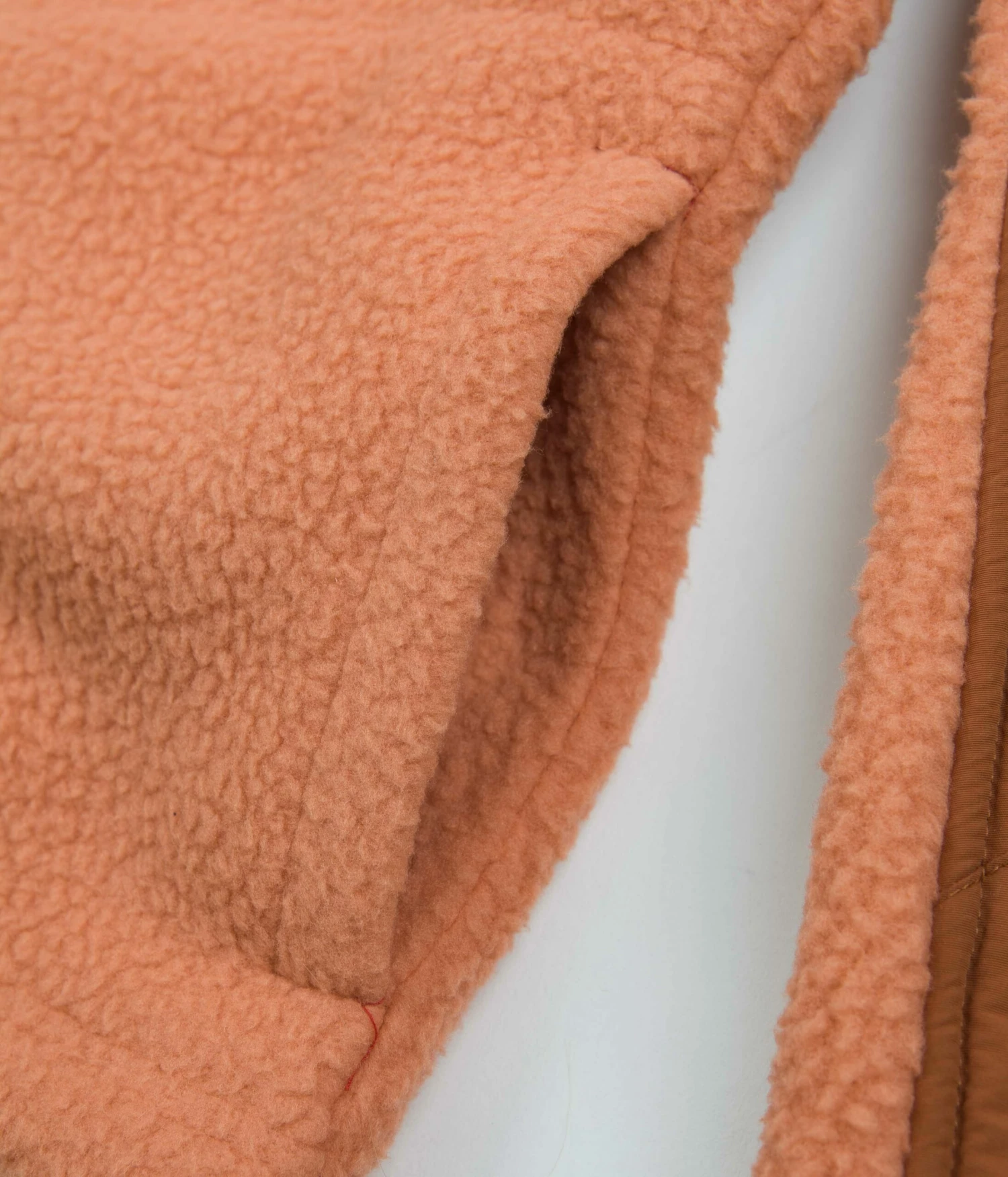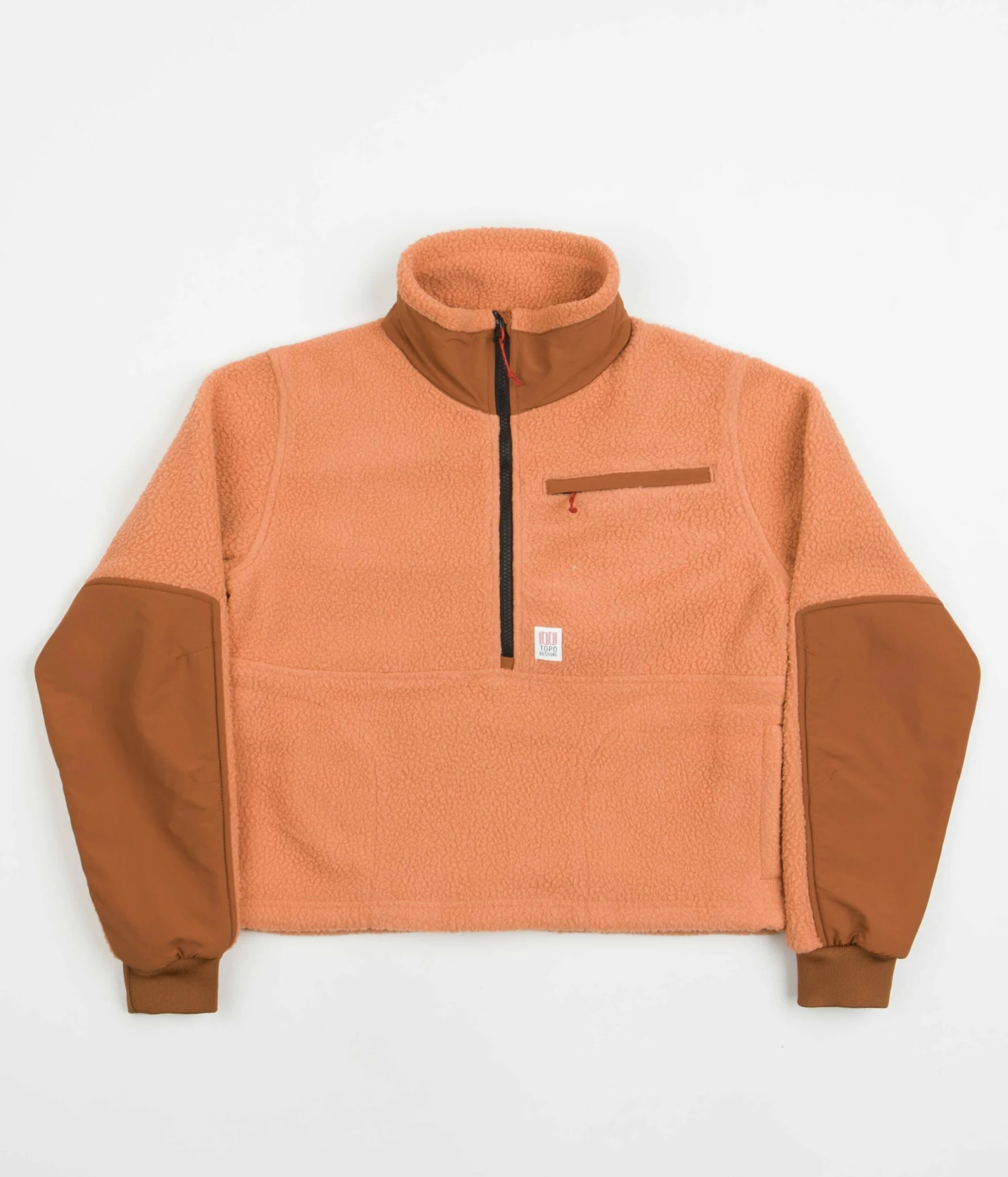 Topo Designs Womens Mountain Pullover Fleece in Rust and Brick. Tailored to a relaxed fitting with a cropped length, this colour block Topo Designs fleece is made from 100% recycled polyester with 100% nylon contrast panels. Featuring a half-length YKK zipper, a classic stand collar, elasticated cuffs and a cinch cord hem, this brown Topo Designs pullover fleece also features reinforced elbow panels. Finished with two front pockets, a single zippered chest pocket and with a woven flag label sewn across the chest.