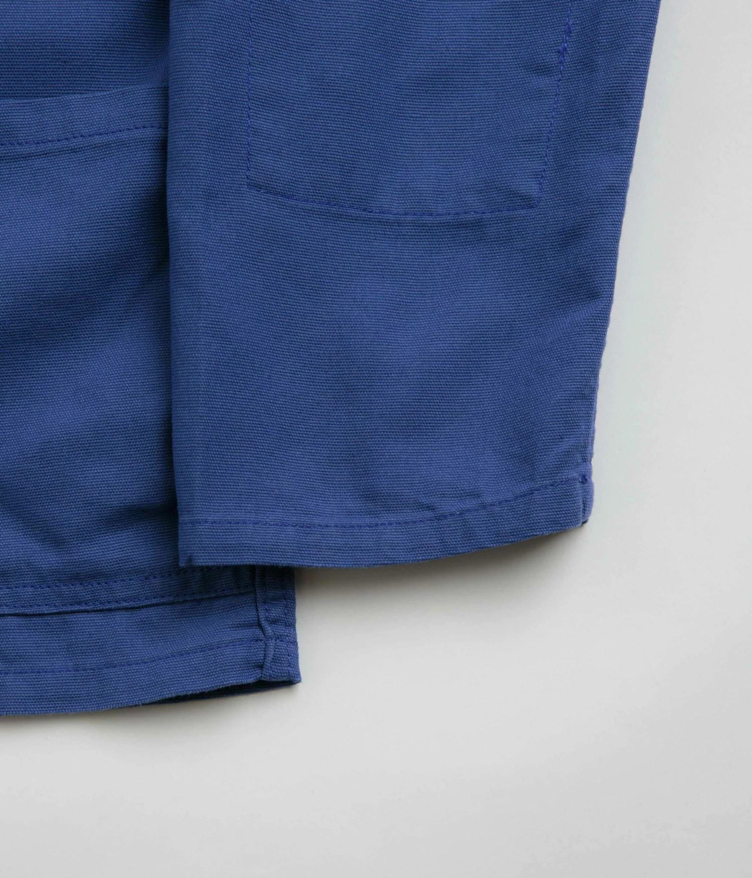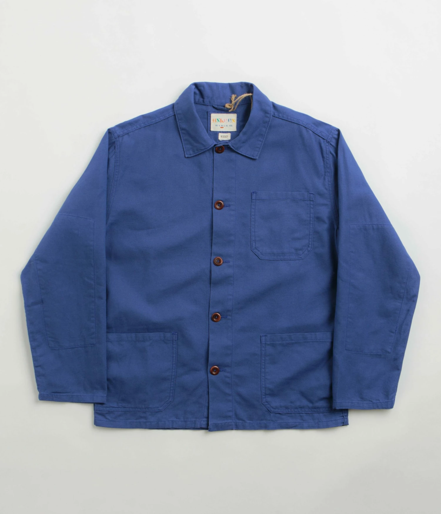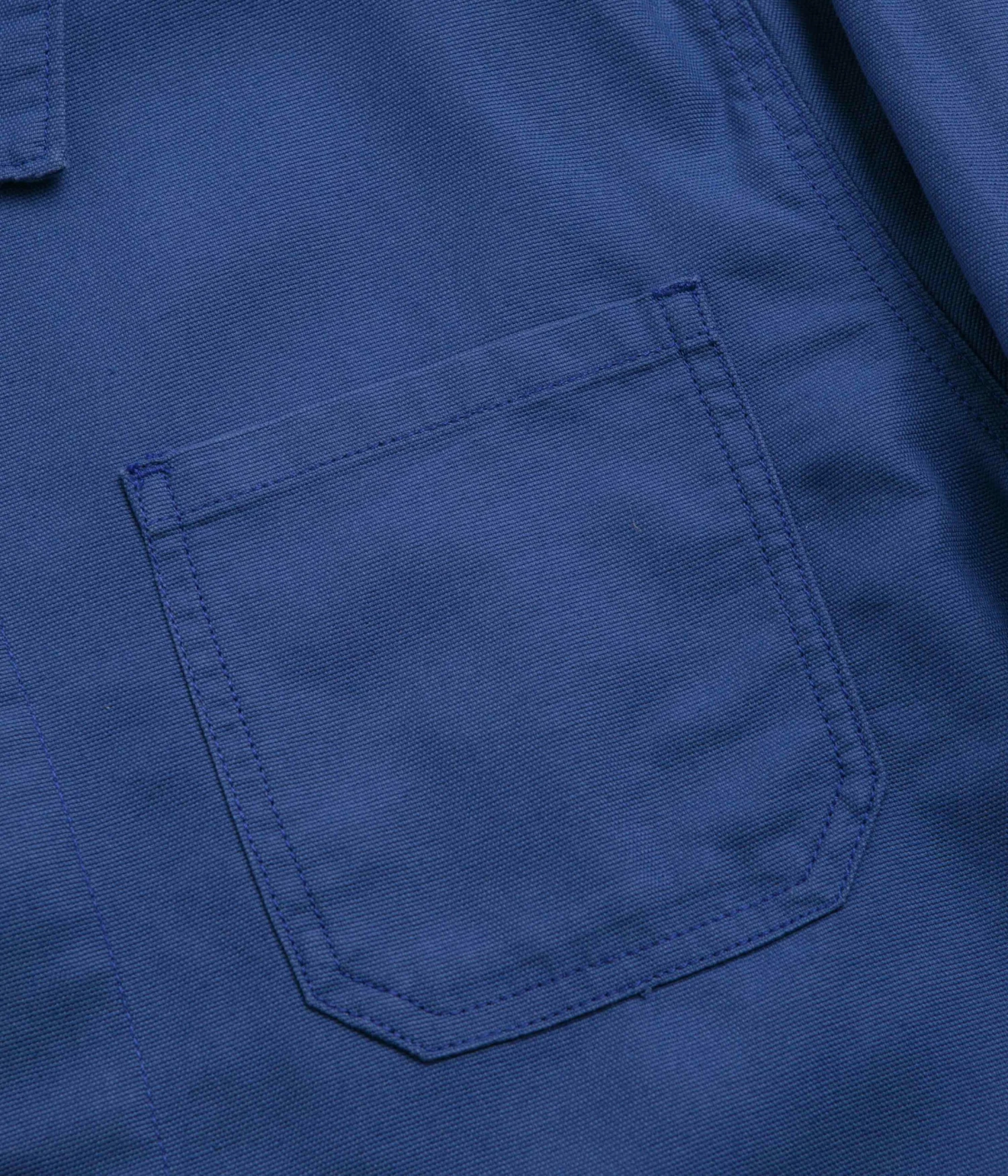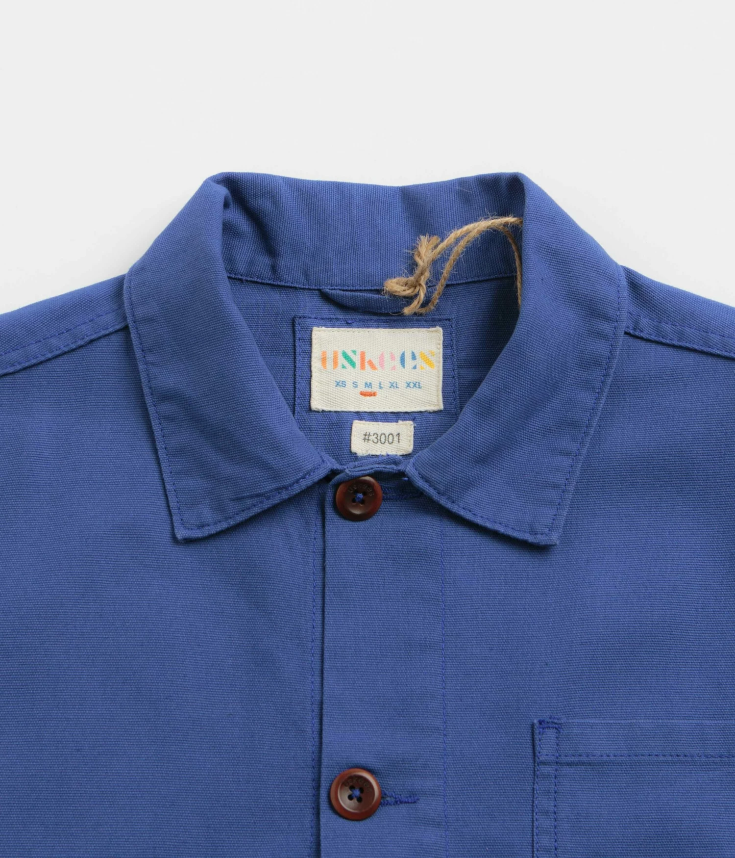 Uskees 3001 Buttoned Overshirt in Ultra Blue. Made from 100% organic cotton with plant-based corozo buttons, this Uskees overshirt is tailored to a boxy fitting with a classic stand collar. Featuring a full length button fastening and reinforced elbow panels, this blue Uskees overshirt is finished with two waist pockets and with a single left chest pocket.