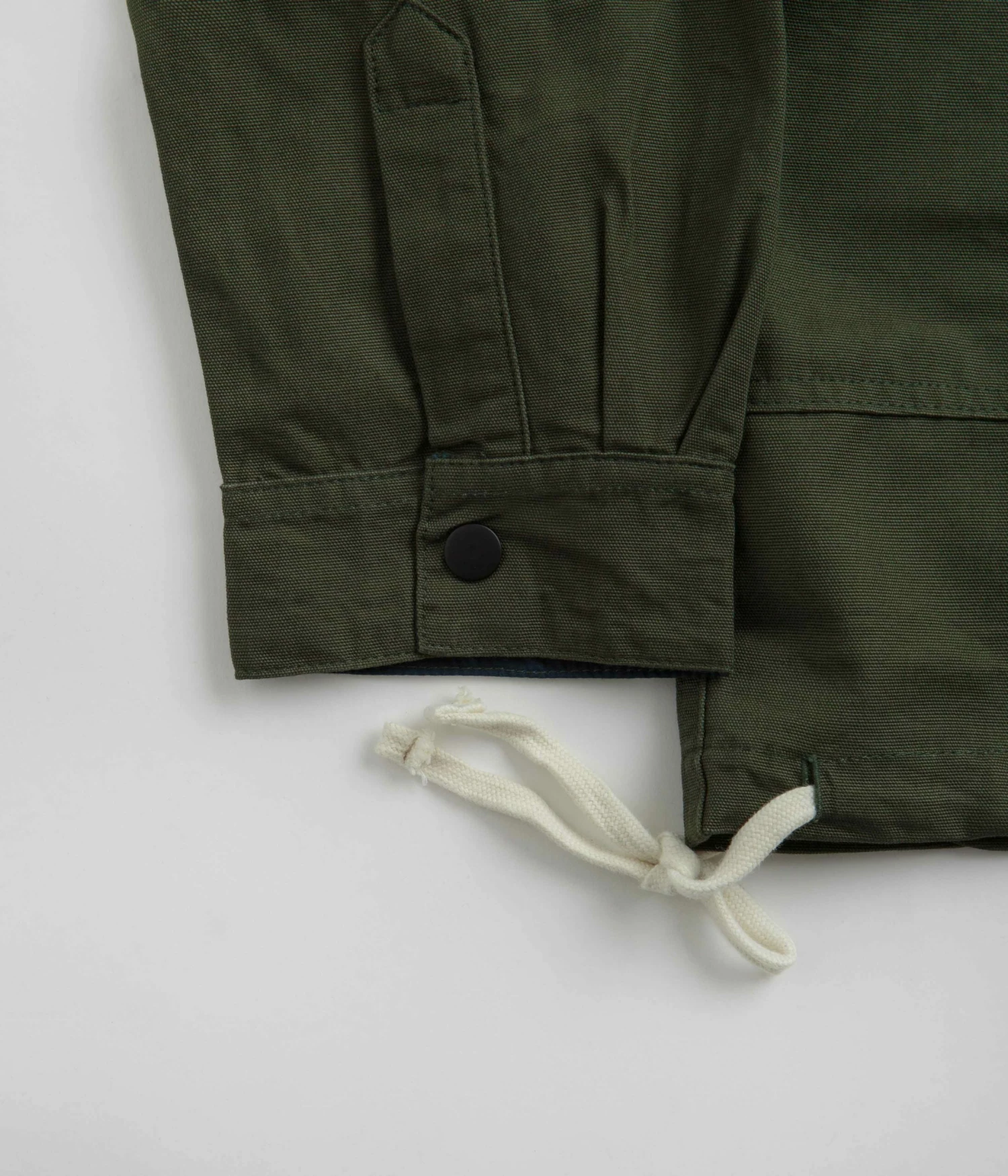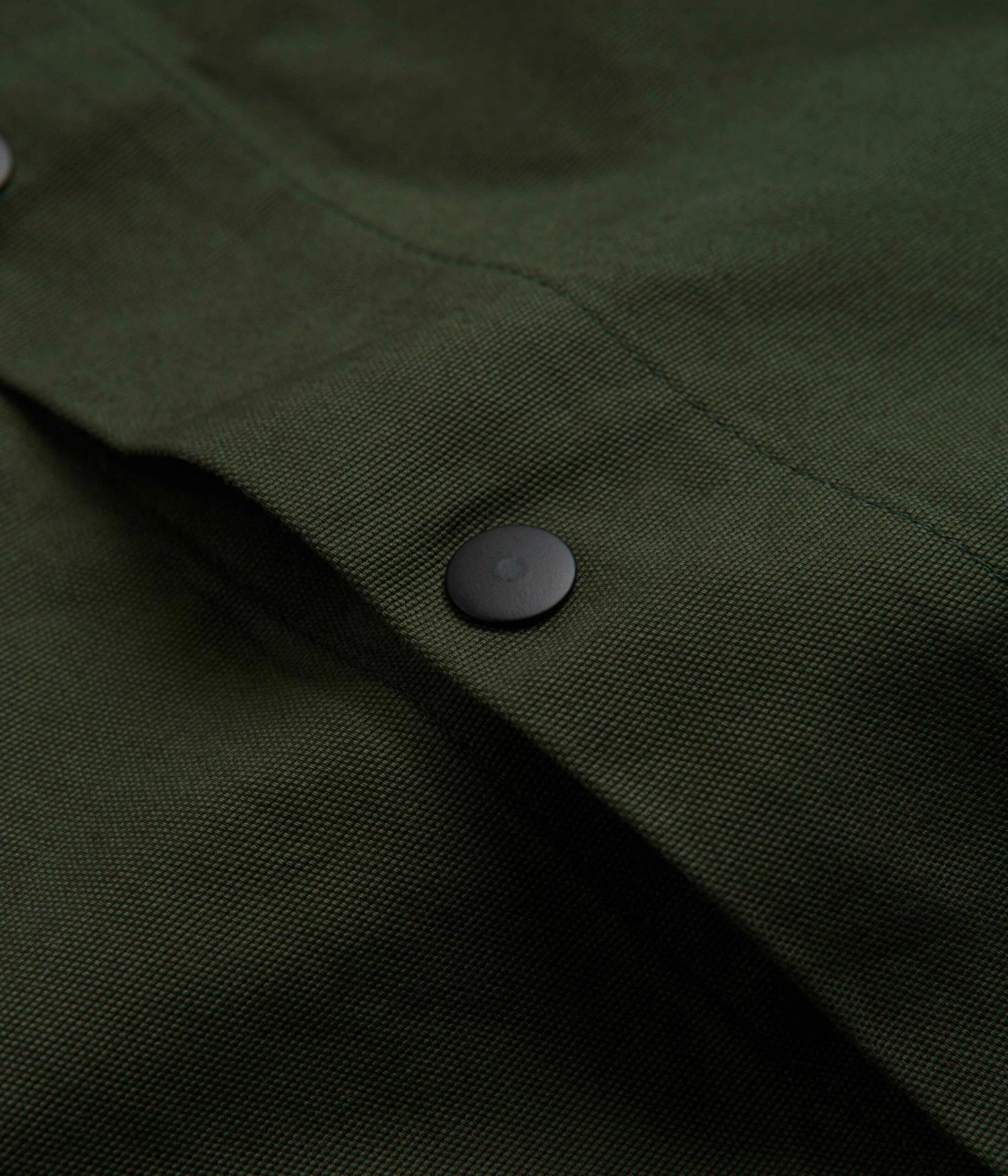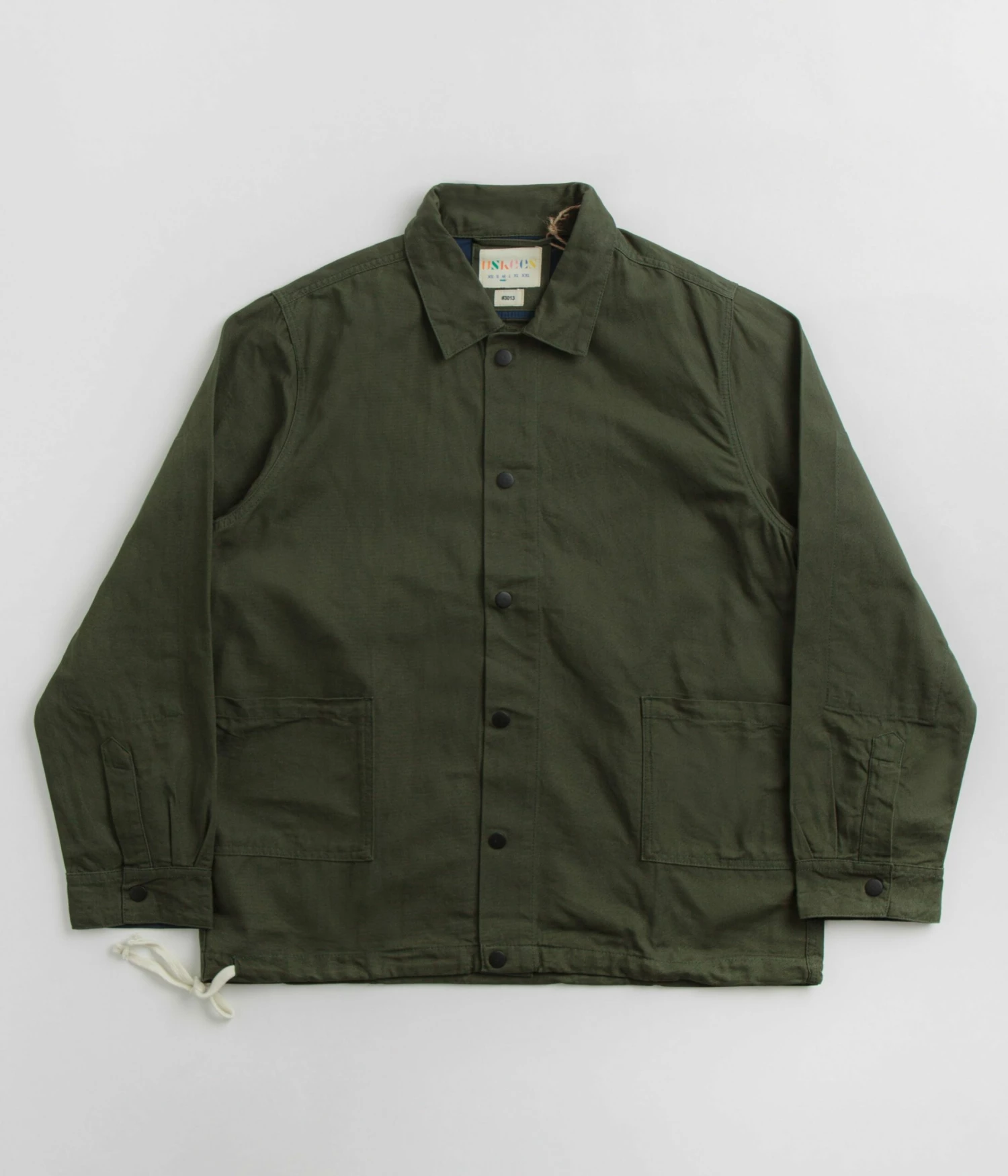 Uskees 3013 Oversized Coach Jacket in Vine Green. Boxy fitting and made from 100% organic cotton, this Uskees jacket is designed with a fold-down collar and with a full length snap placket fastening. Featuring reinforced elbow panels, snap secured cuffs and a drawstring hem, this green Uskees coach jacket is finished with two waist pockets.