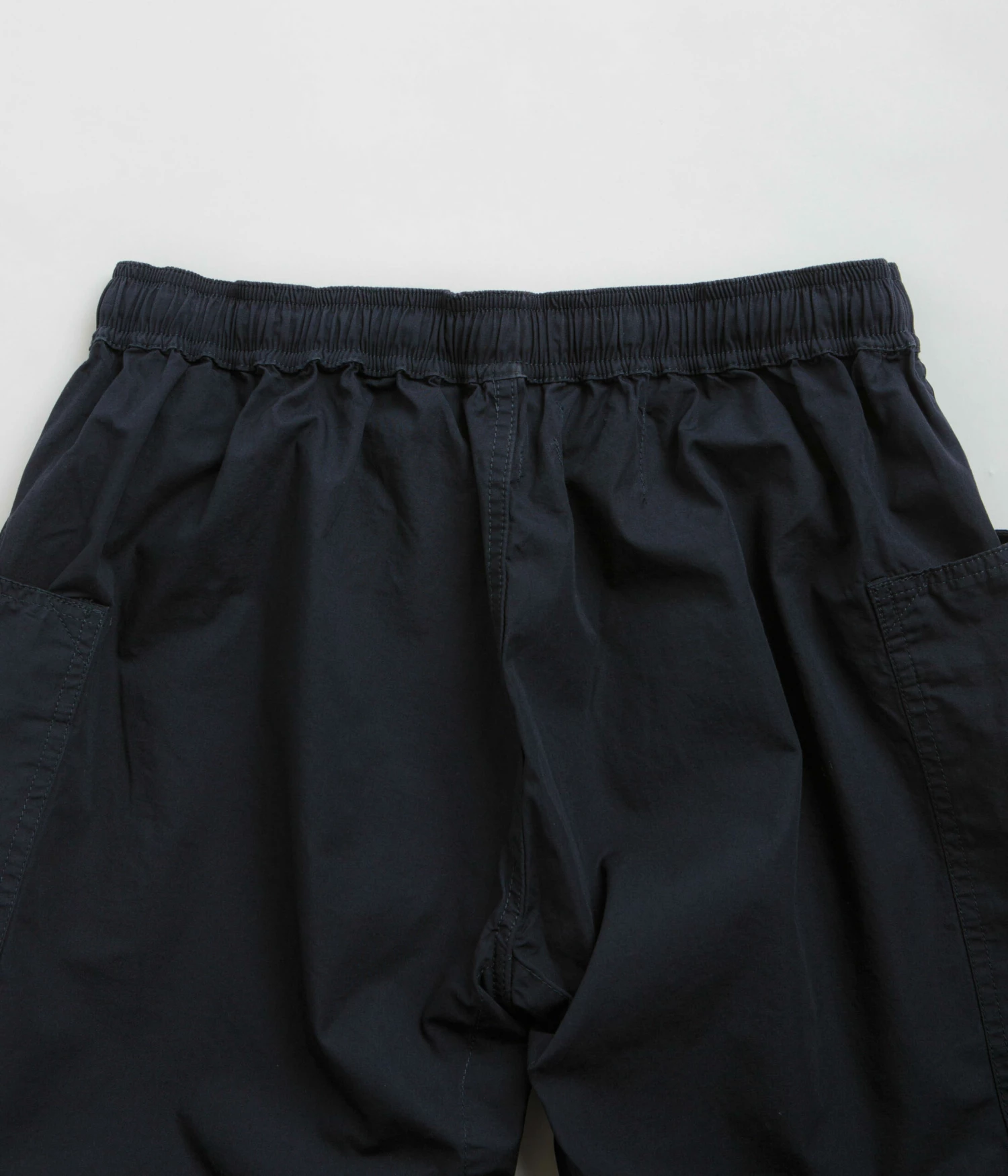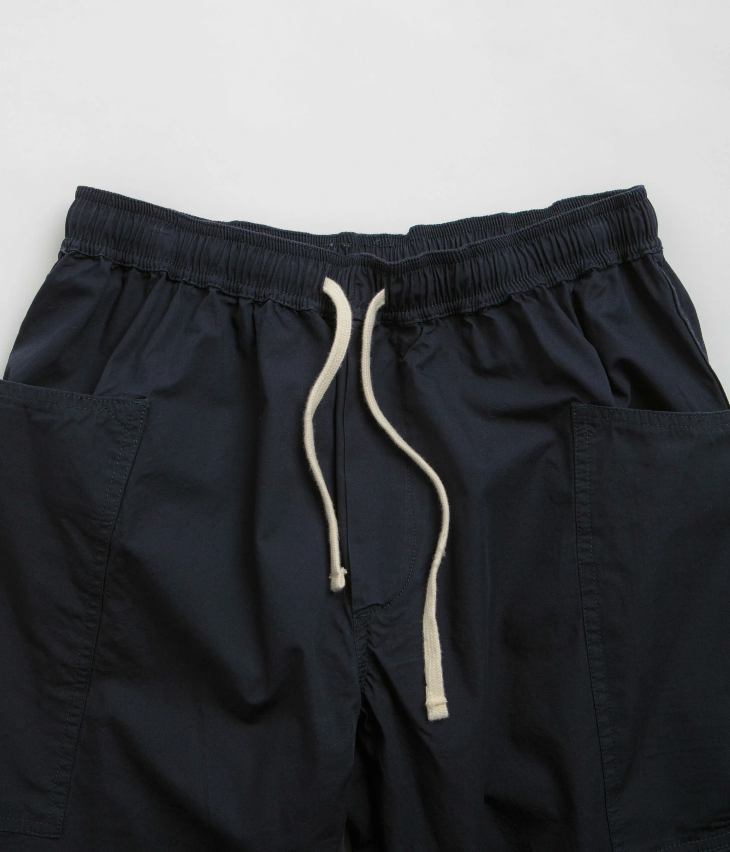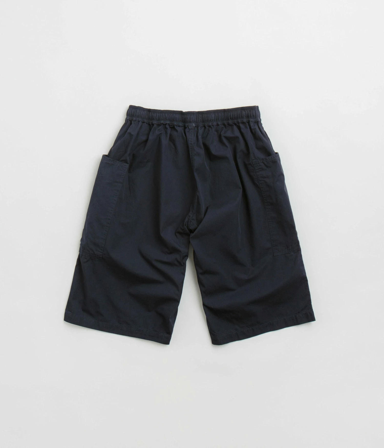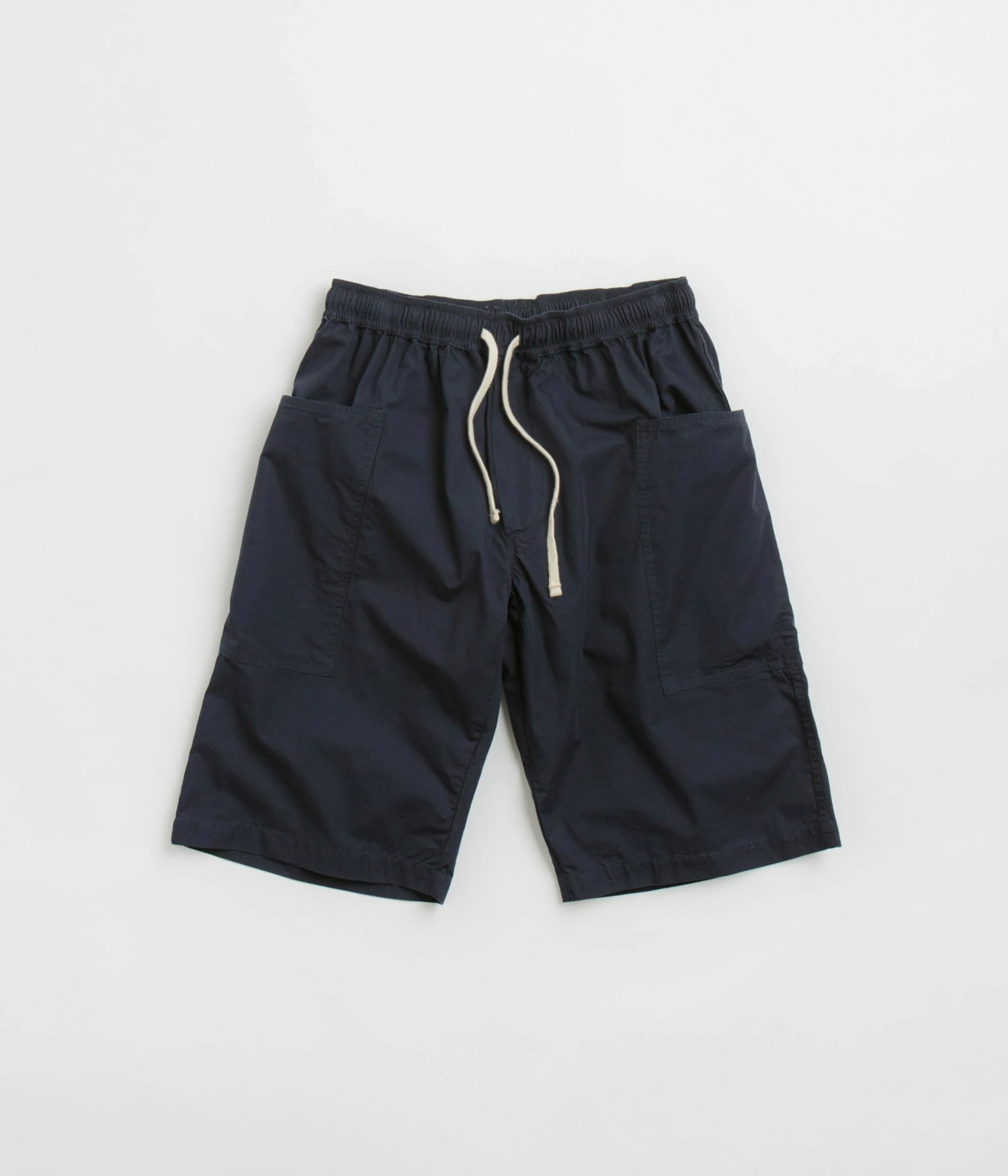 Uskees 5015 Lightweight Shorts in Midnight Blue. Cut to an above-knee length with a loose fit, these Uskees shorts are made from 100% organic cotton. Featuring an elasticated waistband, an external drawstring fastening and a single corozo-button fastening, these blue Uskees shorts are finished with two wrap-around side pockets.