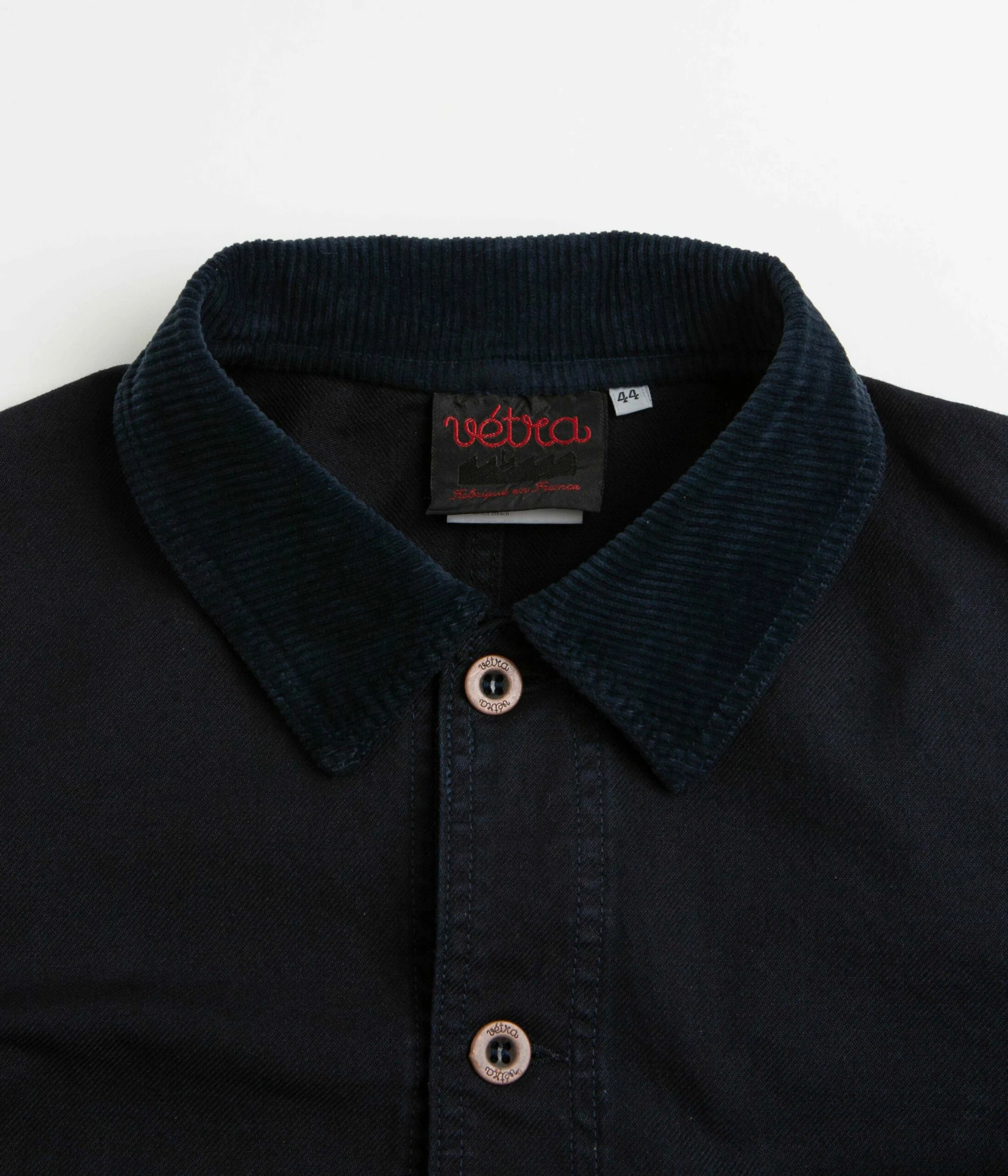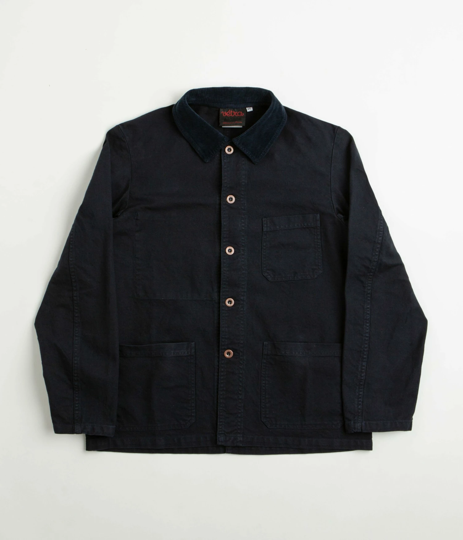 Vetra 5V Double Fabric Workwear Jacket in Dark Navy. Tailored to a regular fitting from 100% organic cotton, this Vetra jacket is designed with a corduroy collar and panelled sleeves. Featuring a full length button fastening and a reinforced hem, this navy Vetra jacket is finished with two waist pockets, a left chest pocket and a concealed inner pocket.