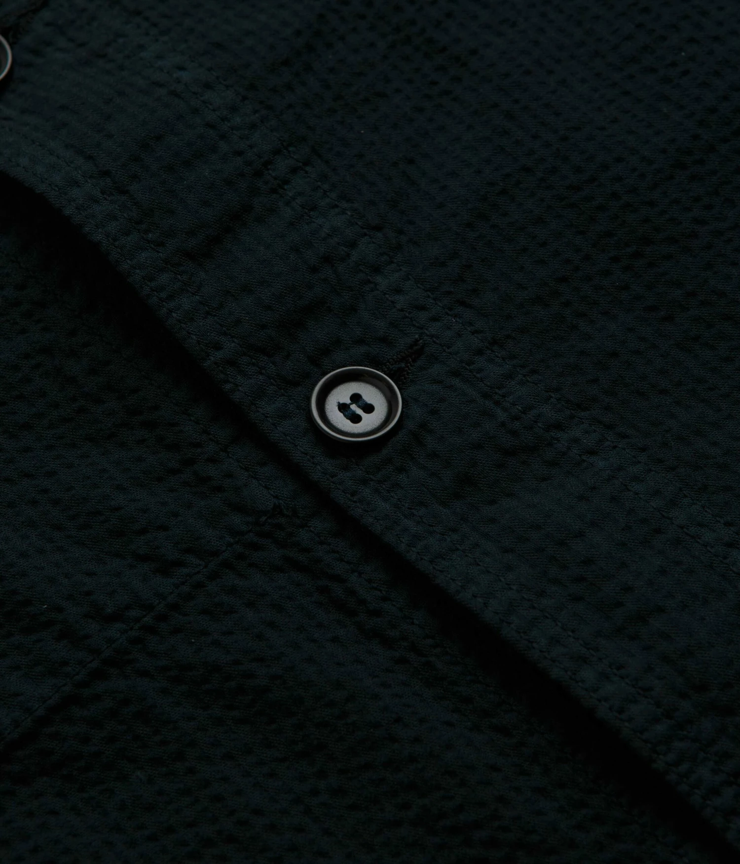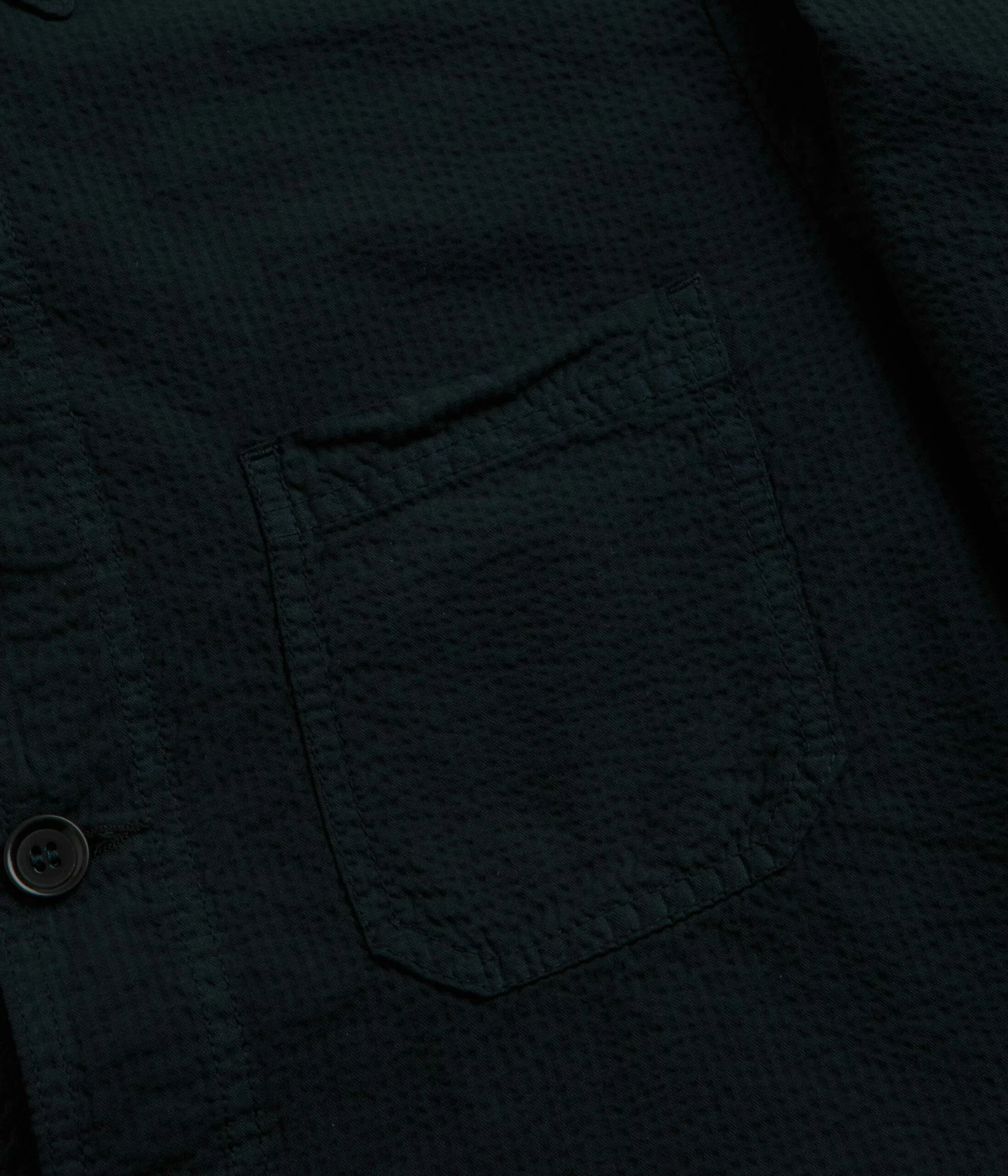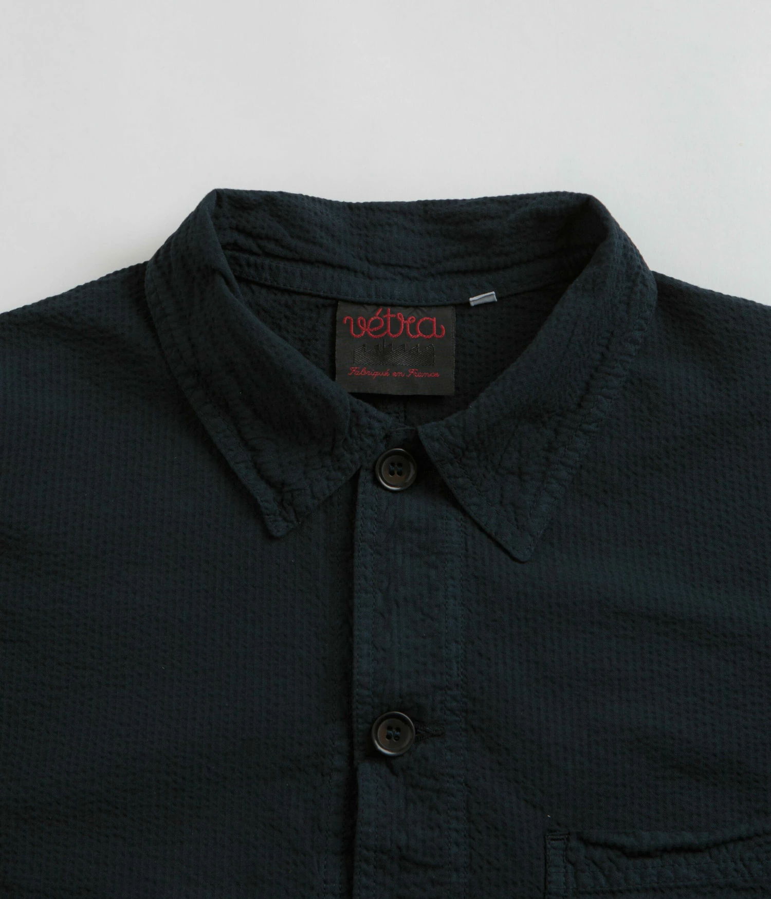 Vetra No.5 Seersucker Workwear Jacket in Navy. Regular fitting from 100% organic cotton seersucker, this Vetra jacket is designed with a classic fold-down collar and a five button placket. Finished in a shade of navy with two front pockets, a single chest pocket and with a concealed inner chest pocket.