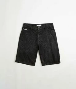 Yardsale Ripper Shorts in Black. Tailored to a loose fitting and cut to knee length, these overdyed Yardsale shorts are made from 100% cotton denim. Featuring a classic belt loop waistband, a single button secured zipper fly and all-over ripper laser detailing, these black Yardsale shorts are finished with two side pockets, two rear pockets, an embroidered coin pocket and with a woven YS rear graphic.